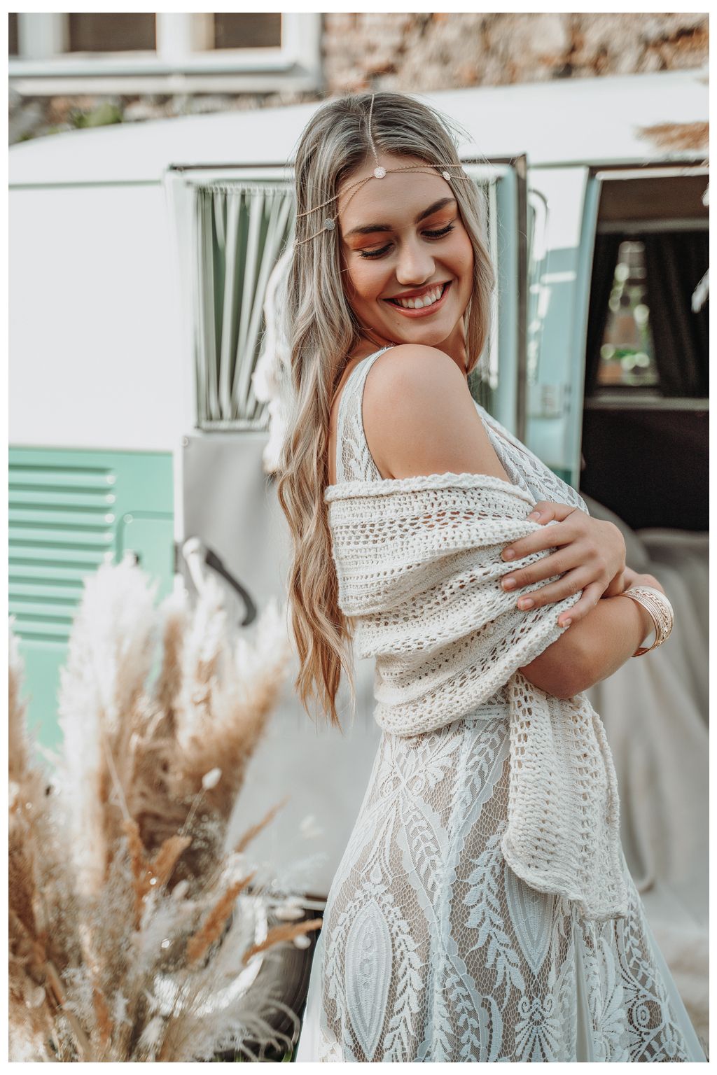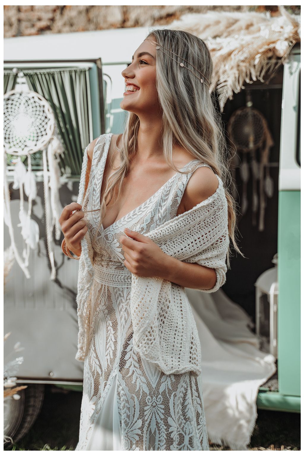 Elegantní hřejivá šála, kterou využijete jako doplněk, pokud plánujete svatbu v chladnějších měsících. Hodit se bude zejména k přírodním, nebo bohémským šatům. Barva krémová.