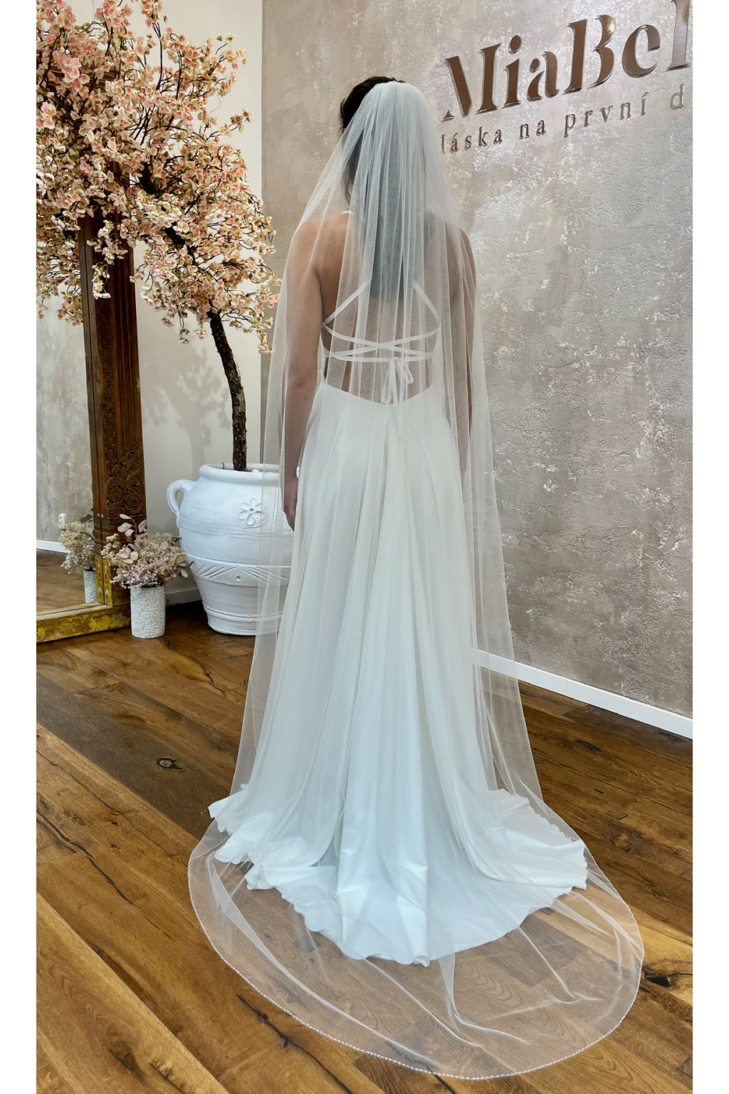 Jemný, lehounký závoj je zdobený elegantním lemováním ve formě křišťálků. Tento jednoduchý závoj se bude hodit ke všem krajkovým i minimalistickým šatům.