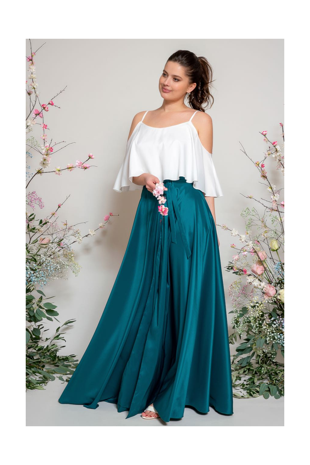 Sukni doporučujeme kombinovat s naším jednoduchým topem (najdete v také v kategorii družičky), který si můžete vybrat s libovolným výstřihem (V výstřih, s rukávy, lodička, na ramínka, zavazování za krk). Náš top je k sukni naprosto ideální, protože má prodlouženou délku, je ušitý ze stejného materiálu, jako sukně a pod lehounkou sukní se ukončení topu vůbec neprotlačuje.