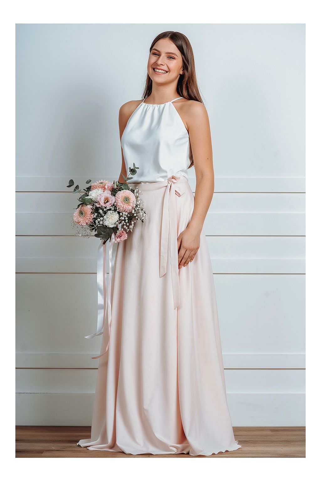 Doporučujeme kombinovat s naším jednoduchým topem (najdete v kategorii družičky), který si můžete vybrat s libovolným výstřihem (V výstřih, s rukávy, lodička, na ramínka, zavazování za krk). Náš top je k sukni naprosto ideální, protože má prodlouženou délku, je ušitý ze stejného materiálu, jako sukně a pod lehounkou sukní se ukončení topu vůbec neprotlačuje.