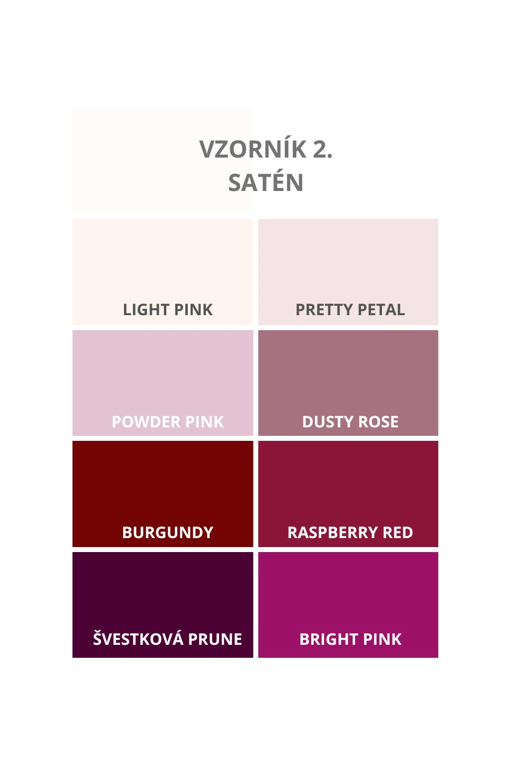 Pokud si nejste jistá zvoleným odstínem barvy, můžete si objednat naše vzorníky a libovolně kombinovat jednotlivé barvy šatů.