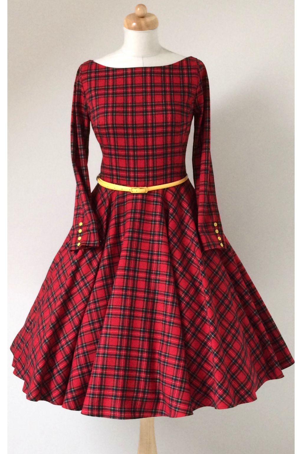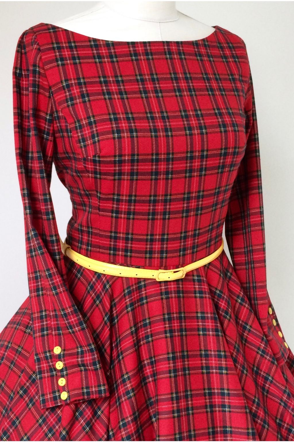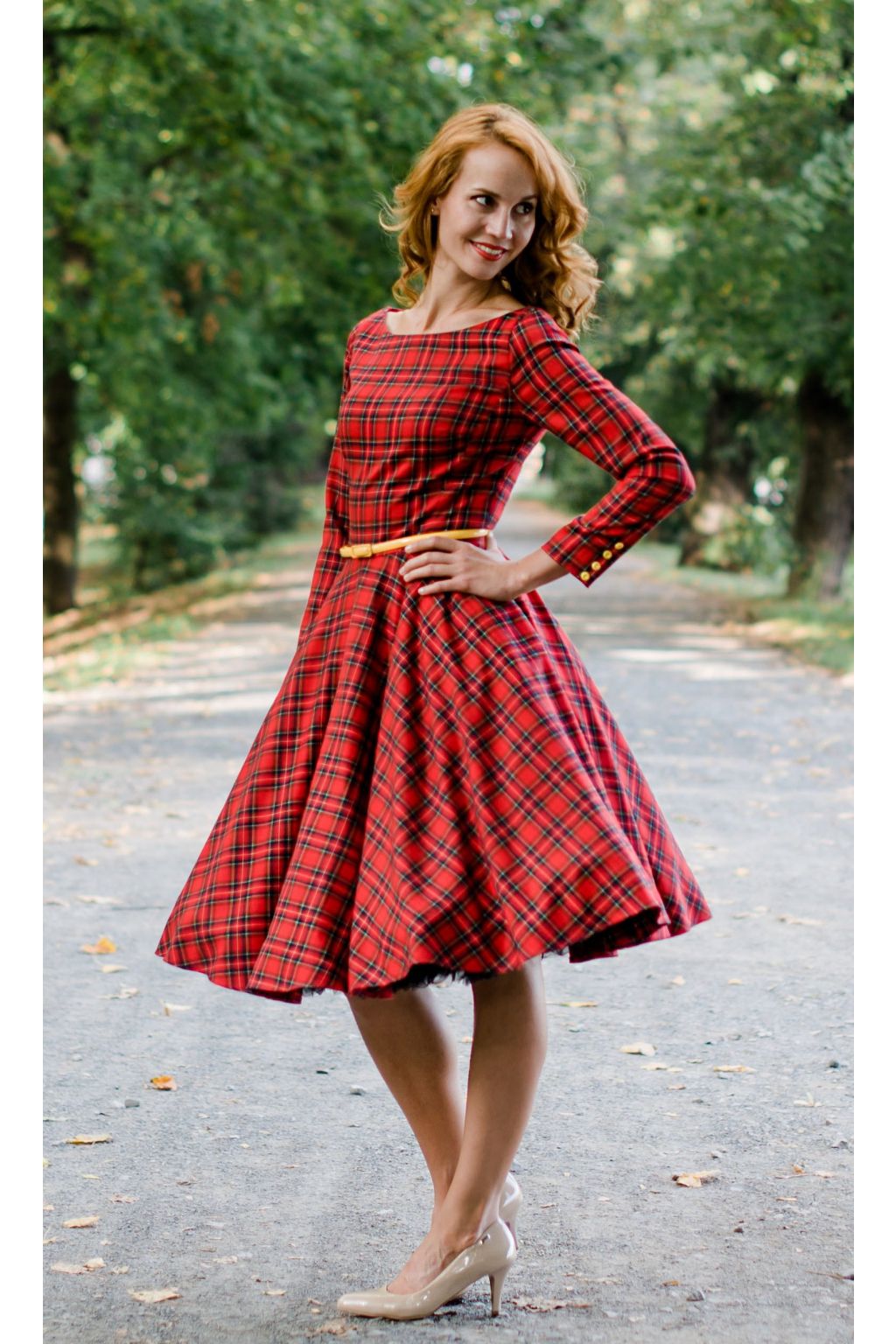 Tyto klasické retro šaty ušité z červené skotské kostky vám budou skvělým společníkem v podzimních i zimních chladných dnech. Jsou ušité z příjemné hřejivé látky. Jsou vhodné na méně významné splečenské události, ale můžete si je klidně vzít i do práce, nebo do školy. Model ADELE má širokou bohatou kolovou sukni a rovný lodičkový výstřih a dlouhý rukáv ukončený knoflíčky. Díky svému střihu šaty svědčí všem typům postav. Šaty lze zakoupit v konfekčních velikostech, nebo je možné zadat vlastní rozměry a šaty ušít na zakázku. Součástí šatů je kvalitní pásek, kterého barvu si můžete vybrat. Šaty jsou focené se spodničkou, která není součástí šatů, k dokoupení ji najdete v kategorii Originální výběr - spodničky.