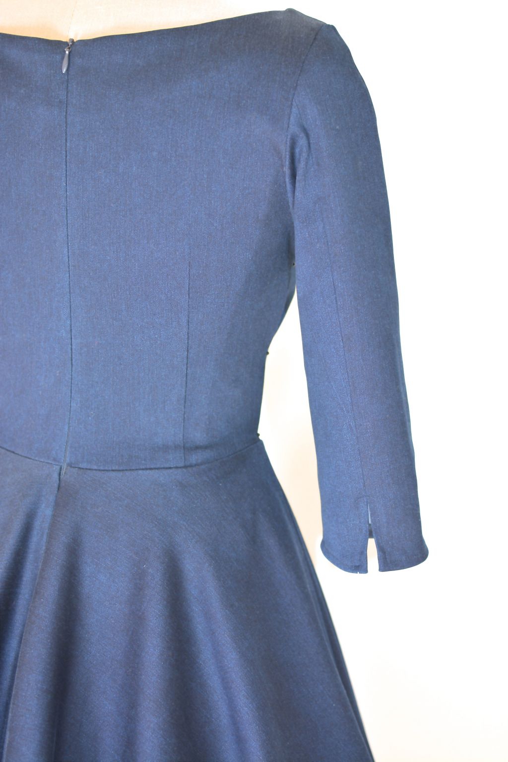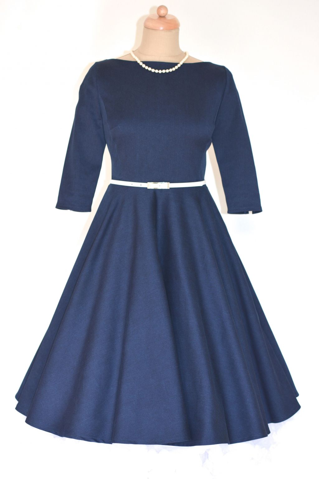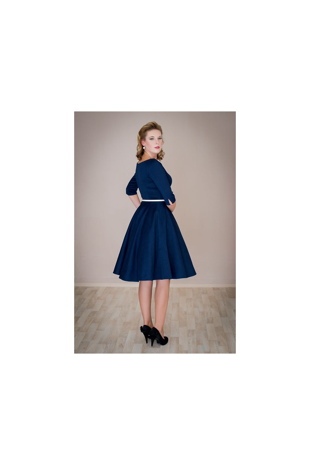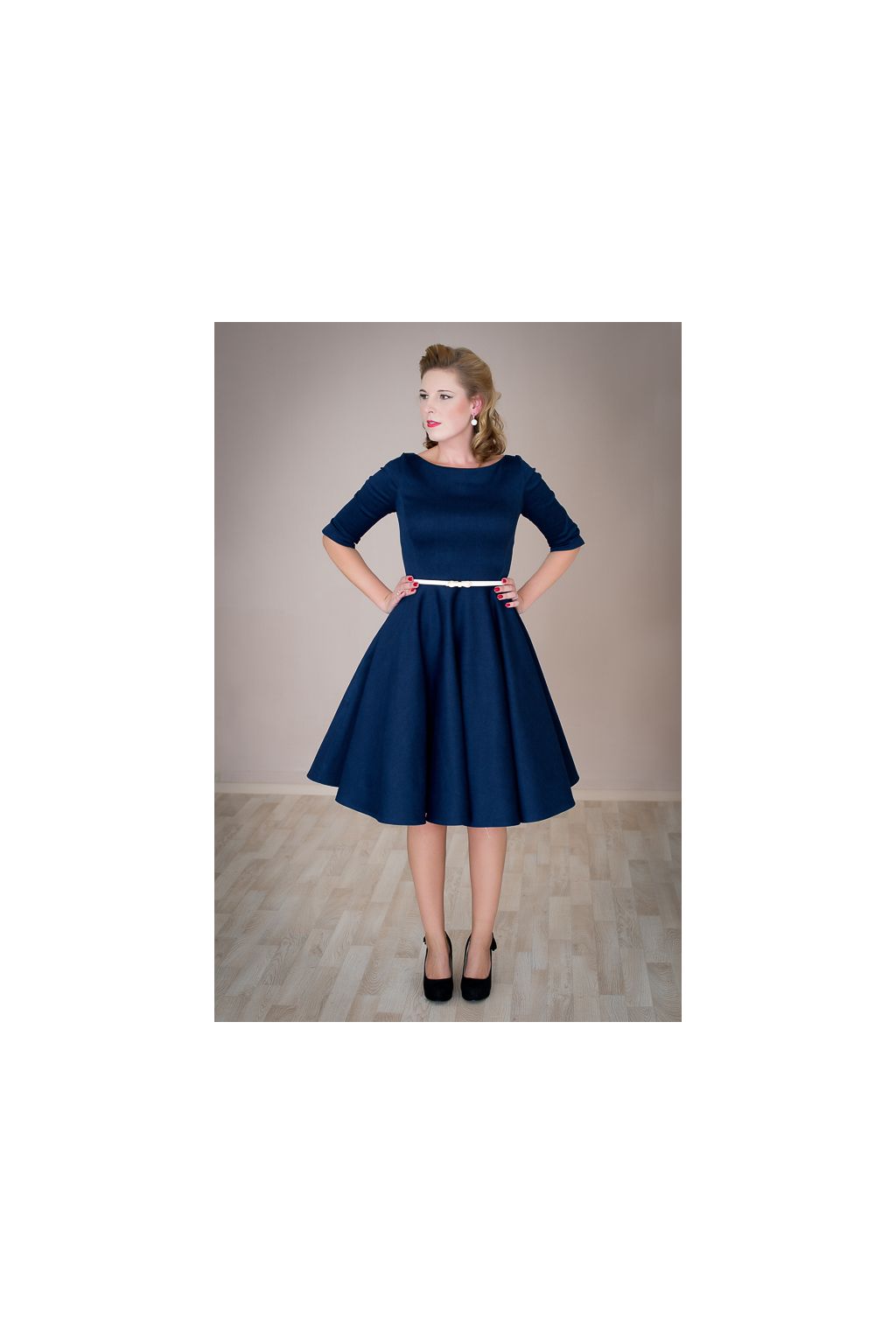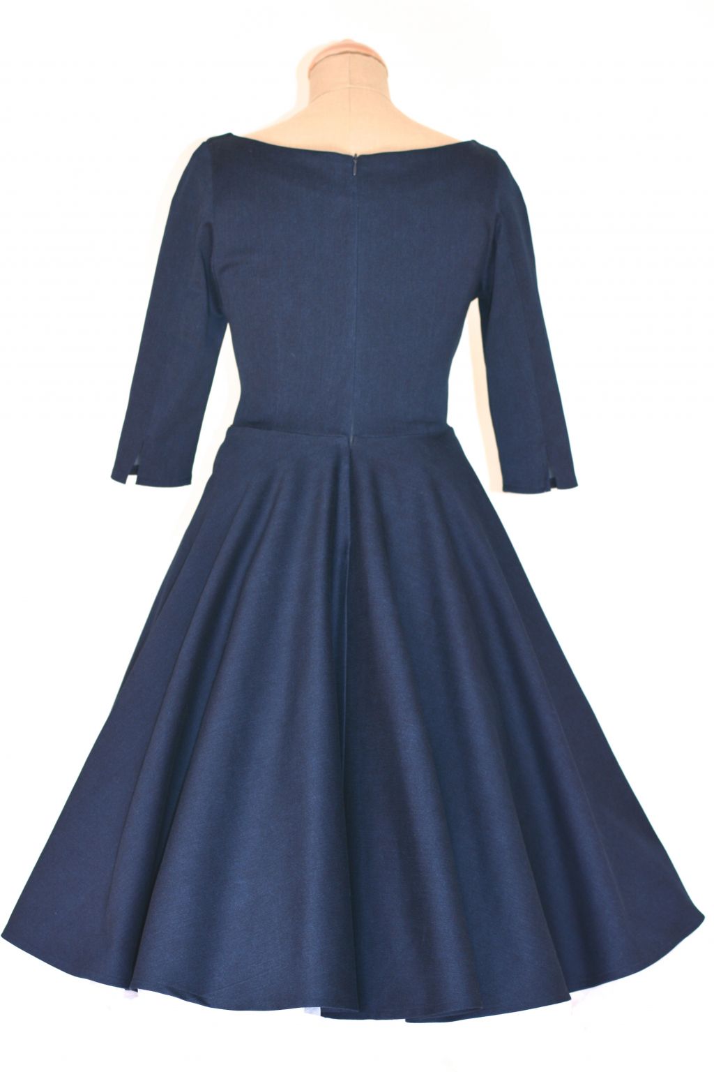 Tyto retro šaty jsou ušité z džínové látky modré barvy a jsou inspirované módou 50. let. Díky použité džínové látce působí šaty neformálním dojmem a proto jsou vhodné na méně významné splečenské události, ale si je můžete klidně vzít i do práce, nebo do školy. Model ADELE má širokou bohatou kolovou sukni a rovný lodičkový výstřih a 3/4 rukáv ukončený rozparkem. Díky svému střihu šaty svědčí všem typům postav. Doplnit je můžete make-upem v retro stylu. Šaty lze zakoupit v konfekčních velikostech, nebo je možné zadat vlastní rozměry a šaty ušít na zakázku. Součástí šatů je kvalitní pásek. Šaty jsou focené se spodničkou, která není součástí šatů, k dokoupení ji najdete v kategorii Oroginální výběr - spodničky.