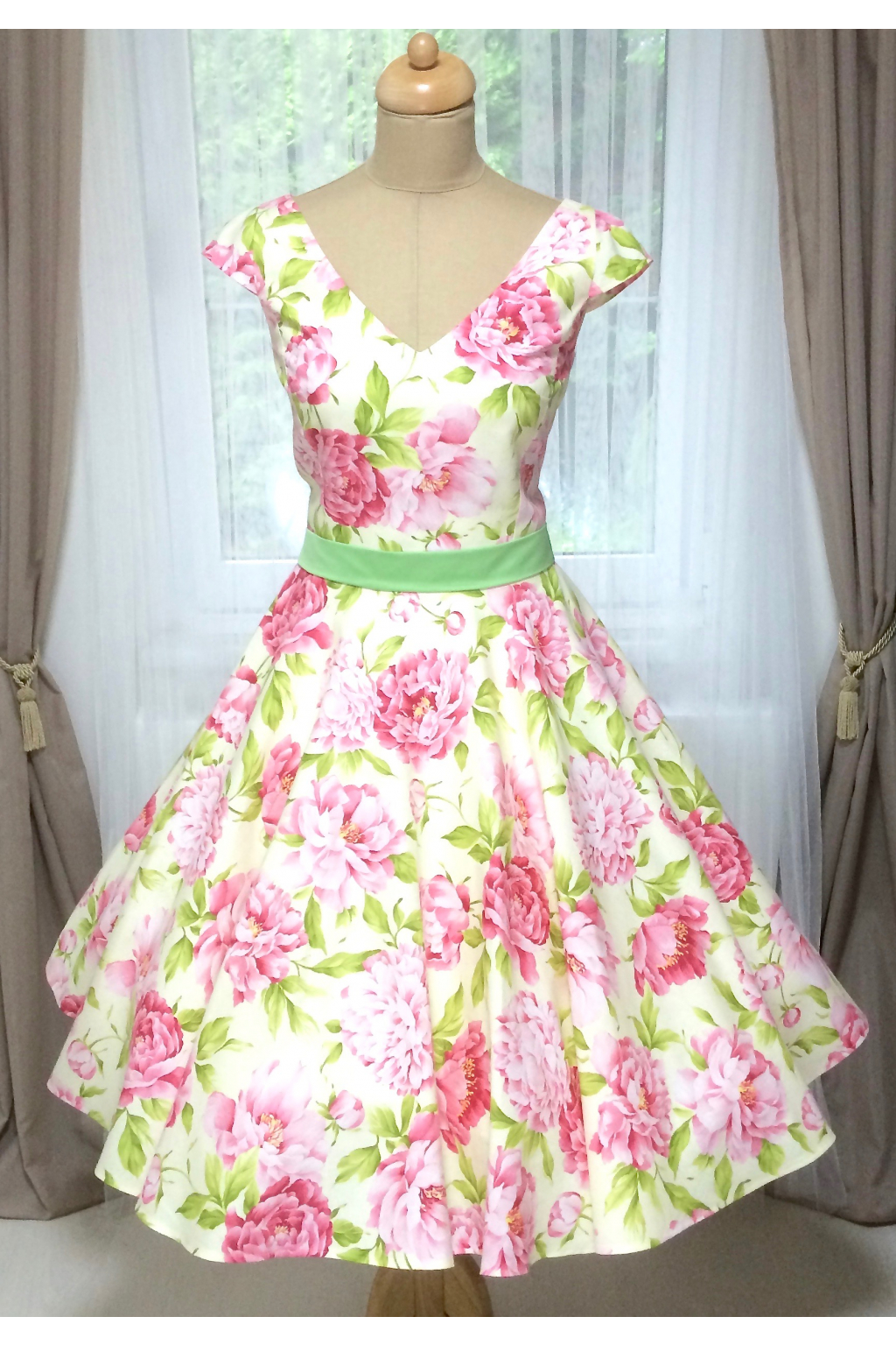 Jemné smetanové šaty s květinovým vzorem jsou určené pro romantickou dámu. Hodí se pro významné společenské události, ale můžete si je klidně vzít i na večeři s partnerem, nebo zahradní oslavu. Jsou inspirované kombinací 50. let a současnými trendy. Model LOREN má širokou kolovou sukni a V výstřih na předním i zadním dílu. Přední výstřih je trošku hlubší, aby hezky ale decentně ukázal dekolt. Šaty doplňuje kvalitní pásek, jehož barvu si můžete vybrat. Šaty lze zakoupit v konfekčních velikostech, nebo je možné zadat vlastní rozměry a šaty ušít na zakázku. Barvu látky je možné si vybrat podle vzorníku. Šaty jsou focené se spodničkou, která není součástí šatů, k dokoupení ji najdete v kategorii Originální výběr - spodničky.