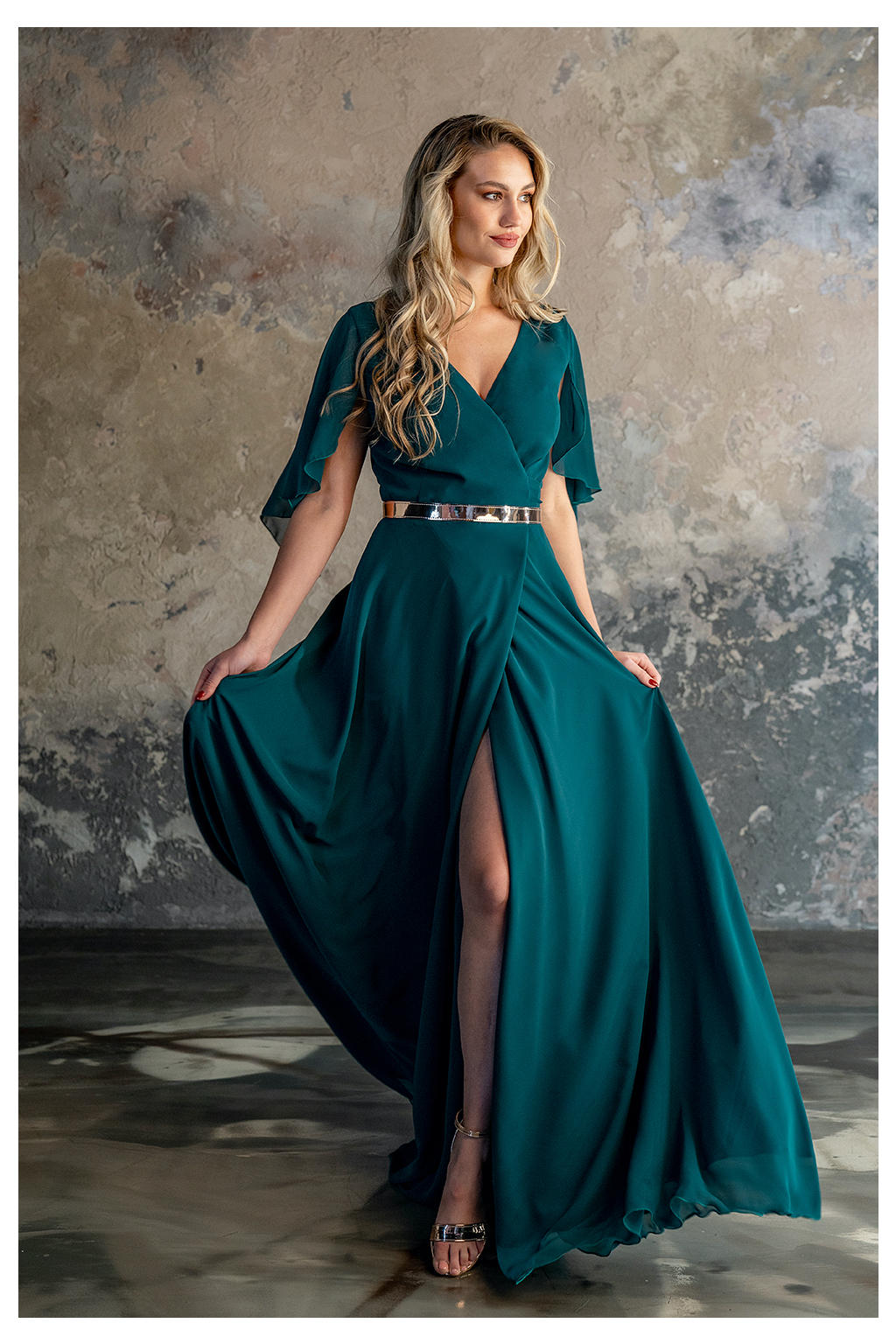Elegantní plesové šaty vhodné pro maturantky, nebo pokud se chystáte na formálnější ples. Šaty jsou ušité z lehkého splývavého šifonu. Materiál se vyznačuje tím, že je matný, nemačká se a měkce splývá. Šifon je částečně průhledný a proto jsou šaty celé podšité. Šaty mají přední i zadní V výstřih a originálně řešené volné rukávy. Délku rukávů je možné přizpůsobit. Pod šaty je možné si vzít vlastní podprsenku. Splývavá sukně je prodloužená do 20cm dlouhé vlečky. Na přání je možné ušít vlečku delší, případně ušít šaty bez vlečky.