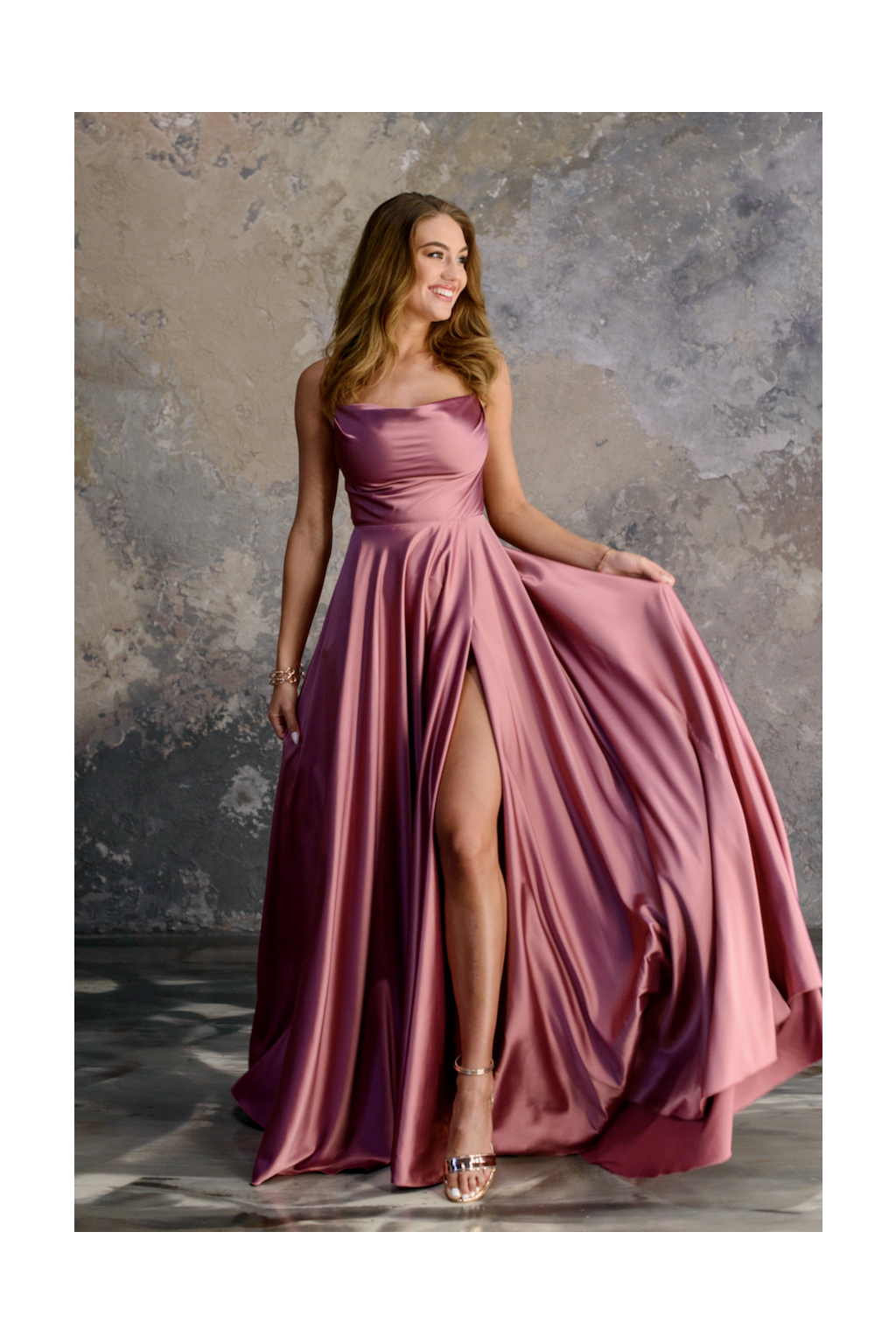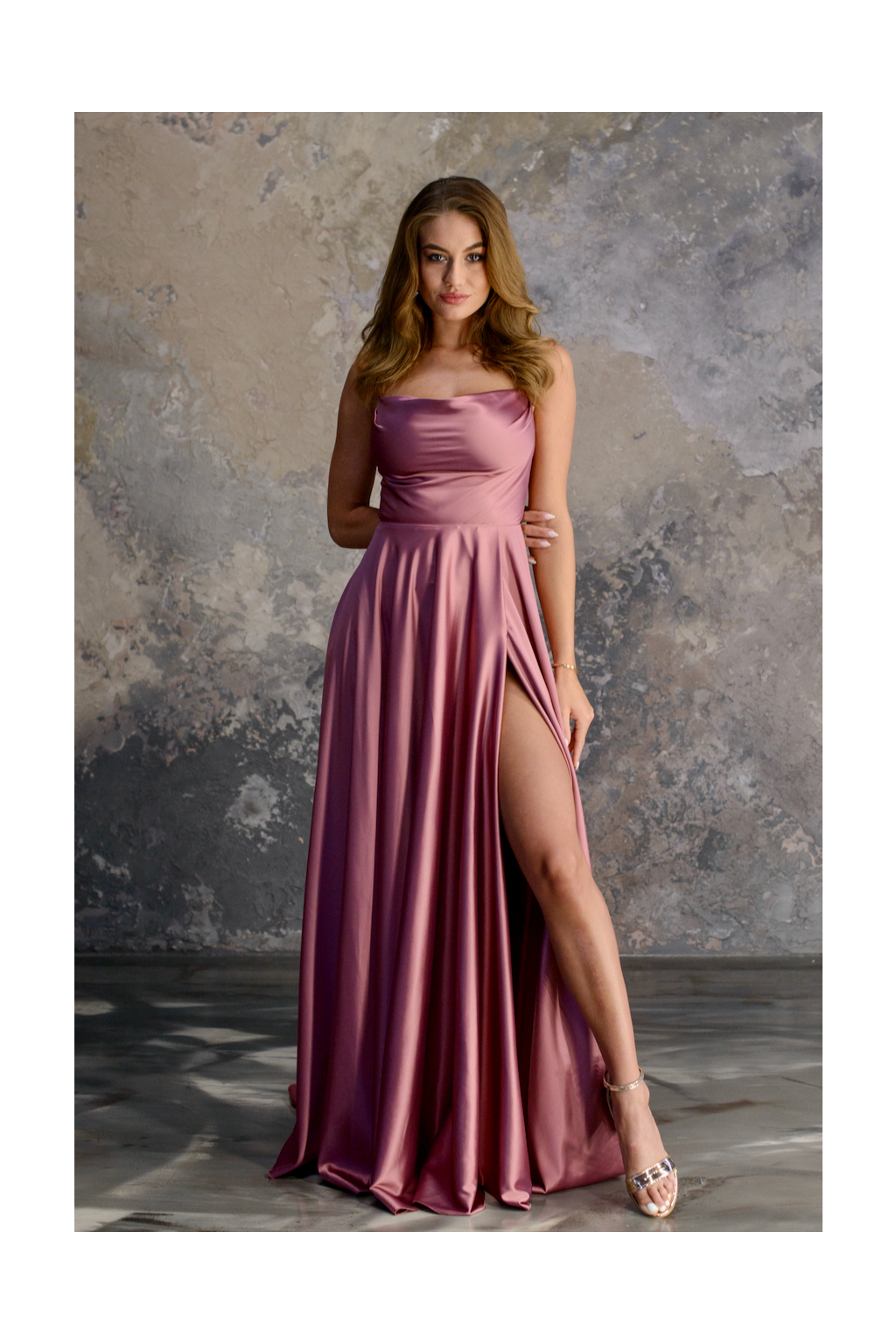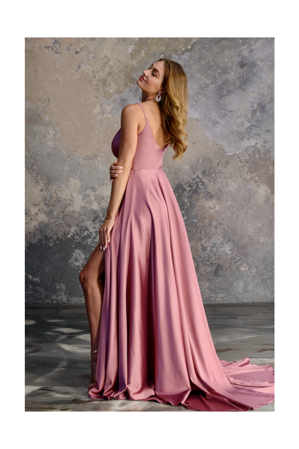 Nádherné jednoduché plesové šaty vhodné pro maturantky, nebo pokud se chystáte na formálnější ples. Živůtek je mírně nařasený ve stylu "voda", na zádech je menší V výstřih. Materiál se vyznačuje decentním sametovým leskem.Šaty jsou ušité z lehkého splývavého saténu v barvě DUSTY ROSE. Na sukni je vysoký rozparek, který je možné na přání zmenšit, nebo je možné ušít sukni bez rozparku. Splývavá sukně je prodloužená do 20cm dlouhé vlečky. Na přání je možné ušít vlečku delší, případně ušít šaty bez vlečky.