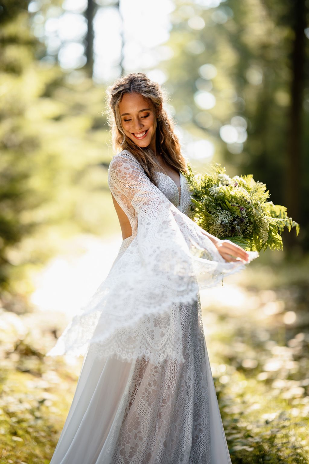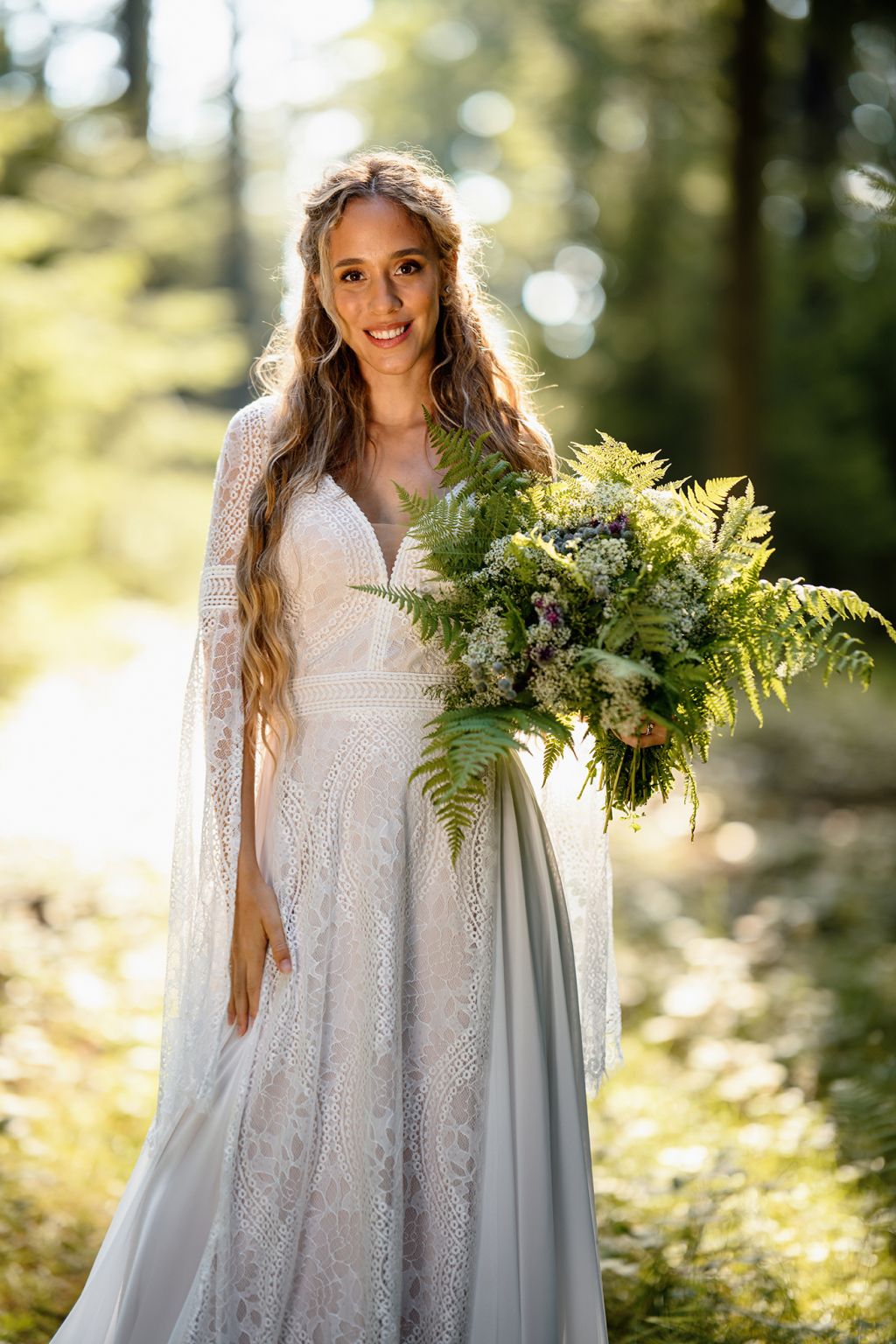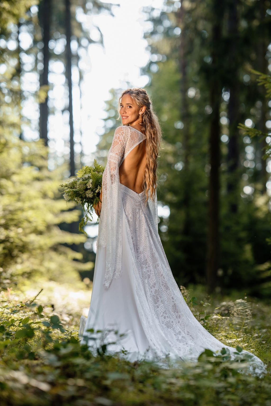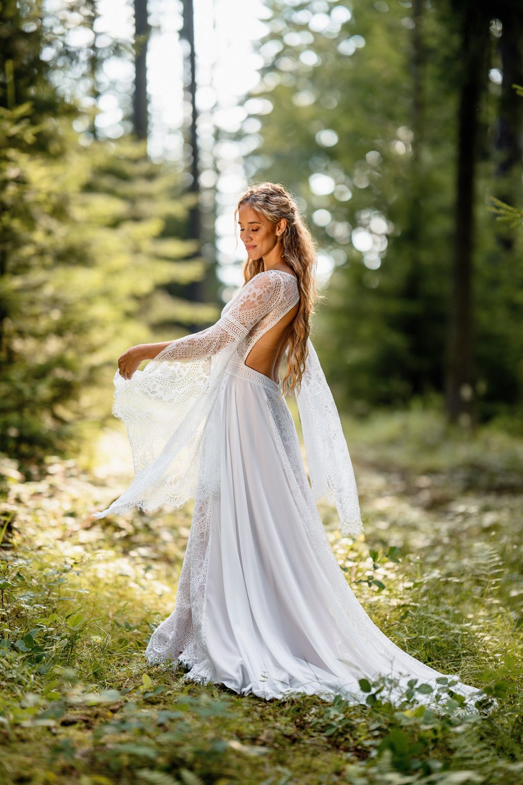 Model Aluna jsou šaty, které propojují kouzlo přírody s jemností krajkové tradice. Bohatá strukturovaná krajka na živůtku i sukni vytváří dojem magického vintage stylu, zatímco dlouhé rozevláté rukávy s jemným lemem dodávají šatům éterickou vznešenost. Střih krásně zvýrazní pas a zároveň poskytuje volnost pohybu. Aluna jsou šaty pro nevěstu, která miluje romantiku s nádechem mystiky a touží po šatech, jež vyprávějí příběh o svobodě a ženské síle.