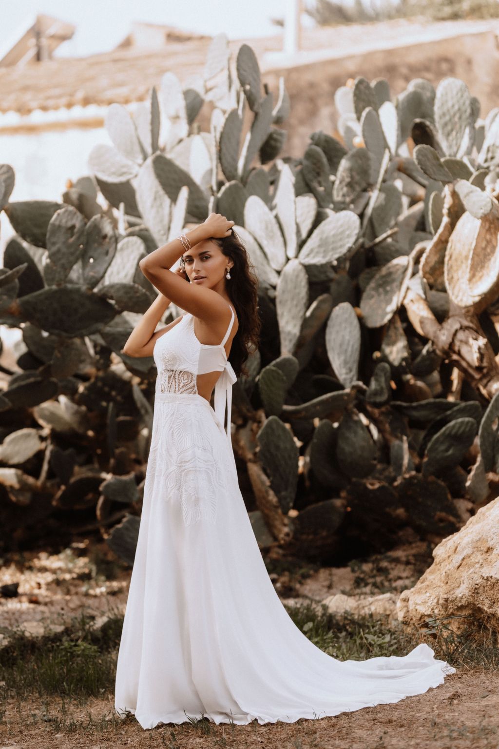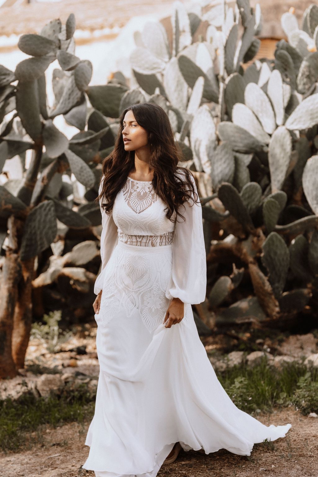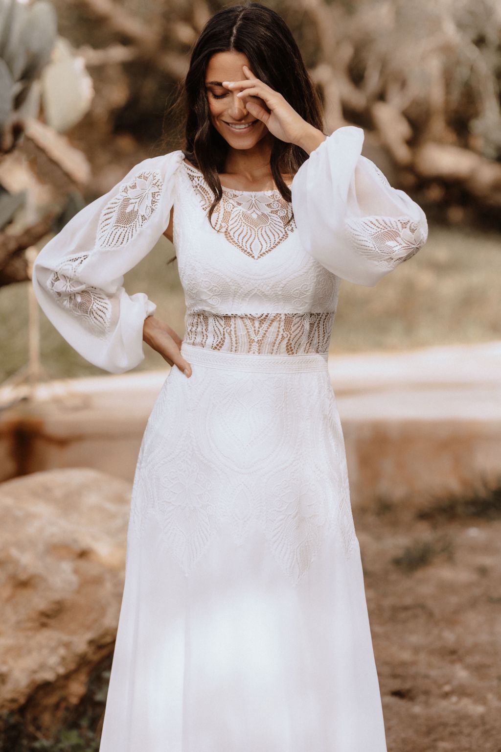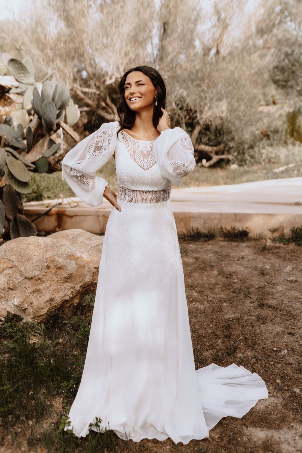 Svatební šaty "Amara" představují kvintesenci bohémské elegance. Tyto originální šaty jsou zhotoveny z lehké ornamentální krajky a šifonu, což jim dodává vzdušný a etéři vzor. Zadní díl šatů je zdoben unikátním zapínáním na mašličku, které dodává osobitý charakter a půvab. Průhledný výstřih a zjemněný prostřih v pase podtrhují ženskou siluetu, zatímco možnost doplnění dlouhými nařasenými rukávy do gumičky přináší další vrstvu adaptability a stylu. Tyto šaty nejsou pouze módním prohlášením, ale také příslibem dokonalého padnutí, protože vám je ušijeme přesně na míru. Objevte svou bohémskou duši v šatech Amara a staněte se hvězdou svého svatebního dne.
