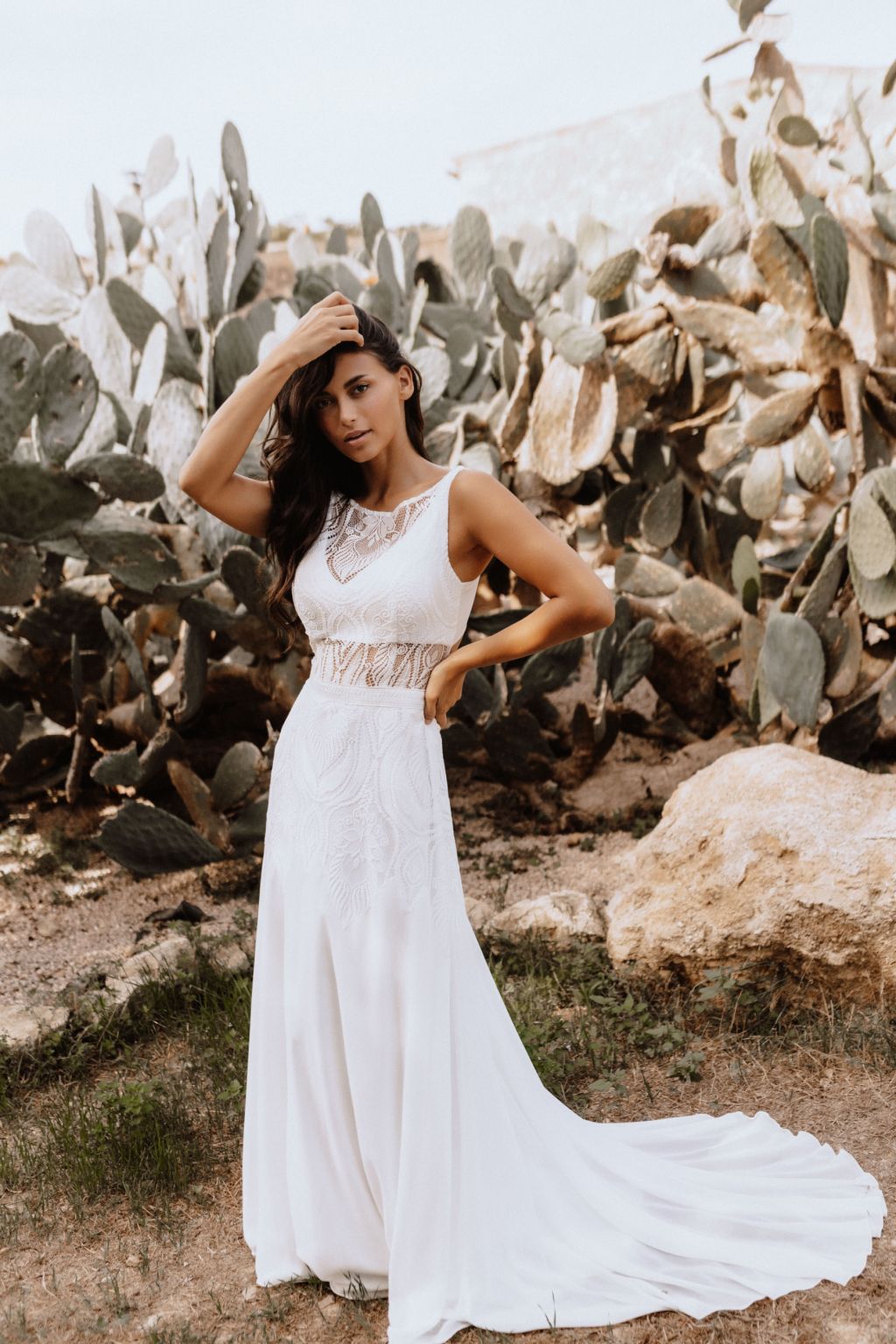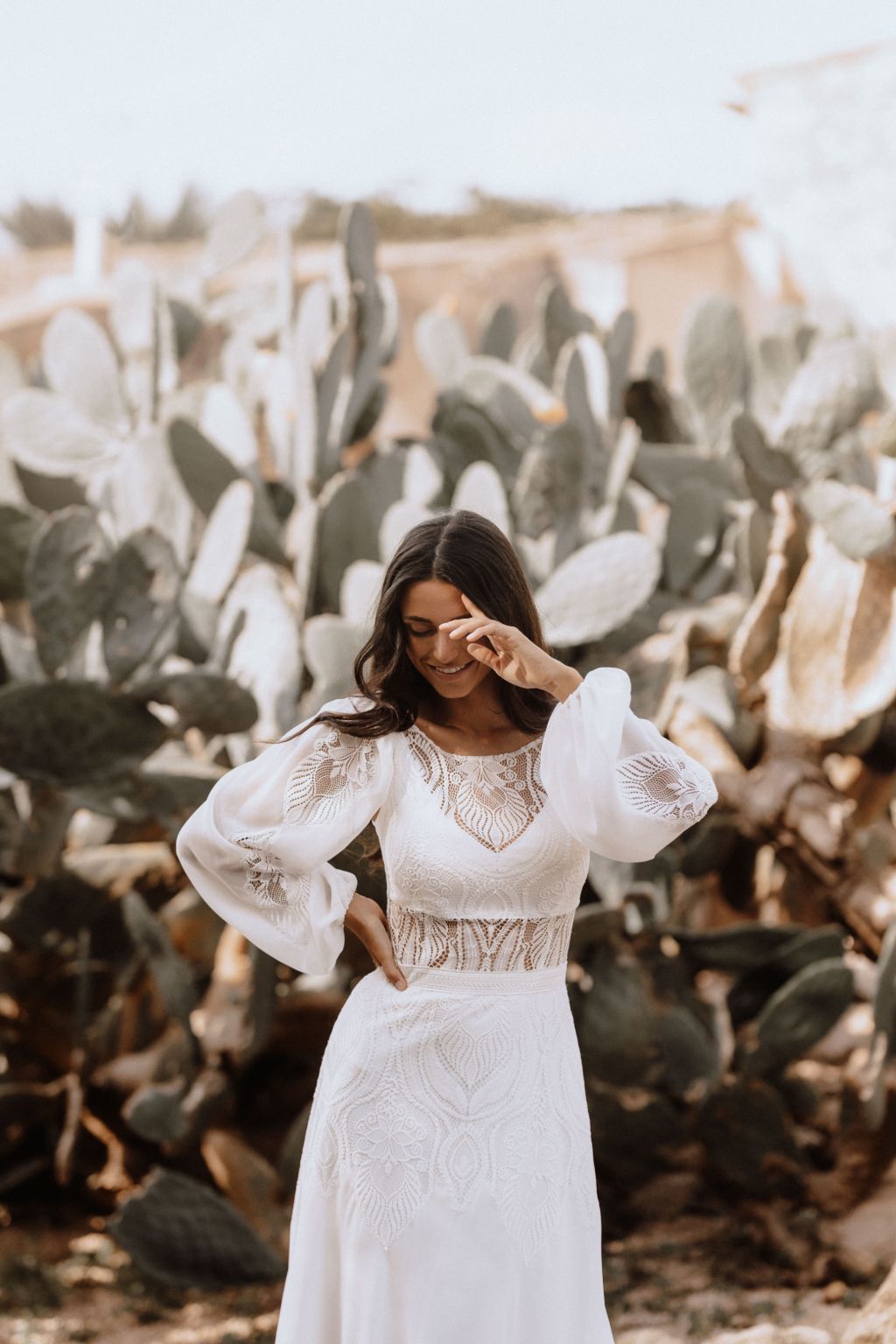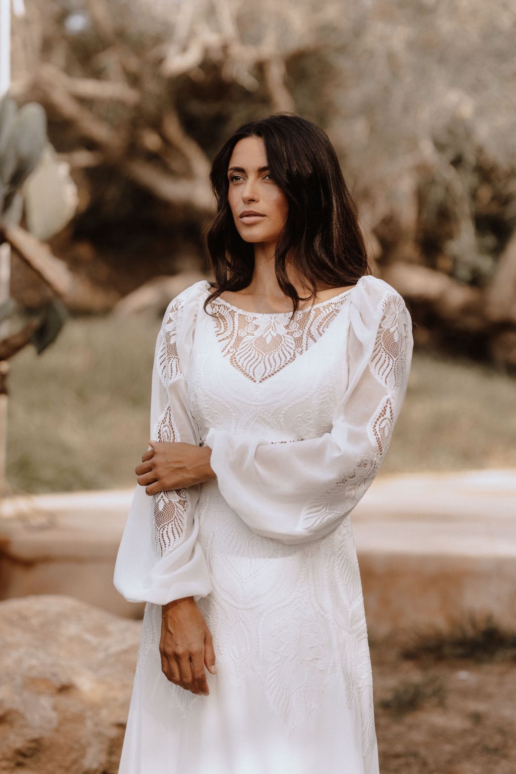 Svatební šaty "Amara" představují kvintesenci bohémské elegance. Tyto originální šaty jsou zhotoveny z lehké ornamentální krajky a šifonu, což jim dodává vzdušný a etéři vzor. Zadní díl šatů je zdoben unikátním zapínáním na mašličku, které dodává osobitý charakter a půvab. Průhledný výstřih a zjemněný prostřih v pase podtrhují ženskou siluetu, zatímco možnost doplnění dlouhými nařasenými rukávy do gumičky přináší další vrstvu adaptability a stylu. Tyto šaty nejsou pouze módním prohlášením, ale také příslibem dokonalého padnutí, protože vám je ušijeme přesně na míru. Objevte svou bohémskou duši v šatech Amara a staněte se hvězdou svého svatebního dne.