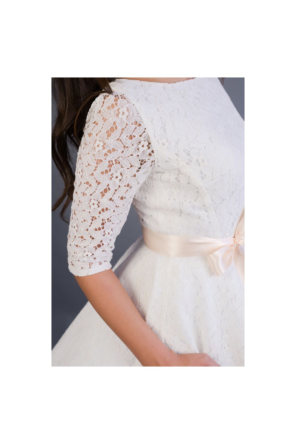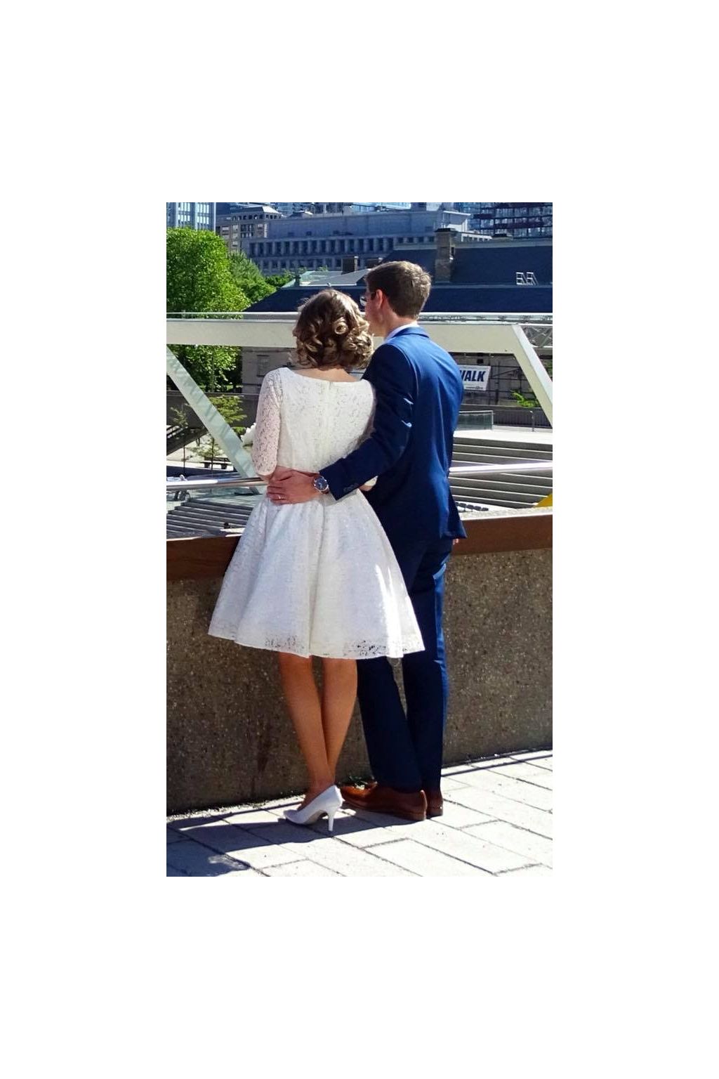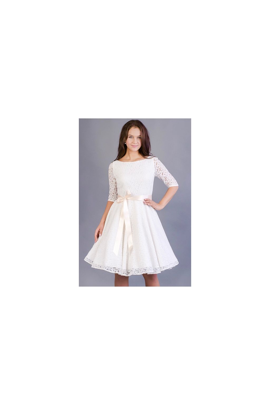 Elegantní svatební šaty jsou zajímavé kombinací vintage krajky, krémové barvy a matného svatebního saténu. Šaty mají mírně kulatý výstřih a 3/4 rukávy po loket. Na obrázku mají šaty prodloužený. Na živůtek navazuje 3/4 kolová sukně, která je focená se spodničkou. Spodnička není součástí šatů, k dokoupení ji najdete v kategorii spodničky. Svatební šaty obvykle šijeme na jednu zkoušku v průběhu šití. Střih šatů je možné mírně přizpůsobit tak, aby vám šaty co nejlépe pasovaly.