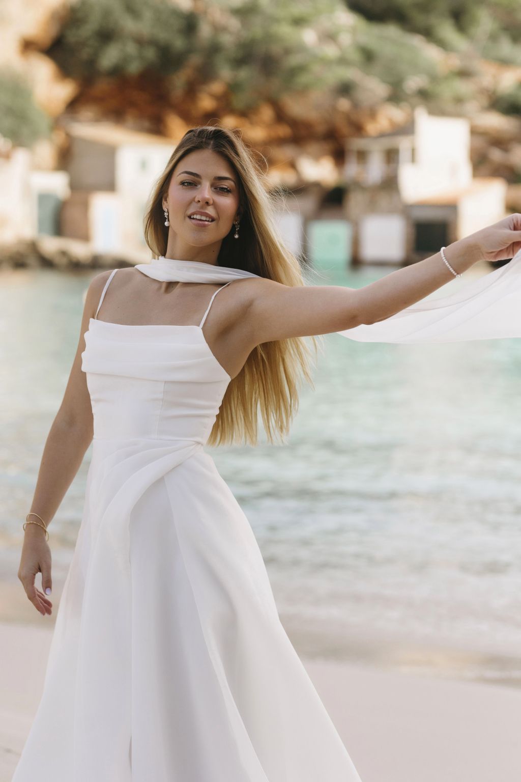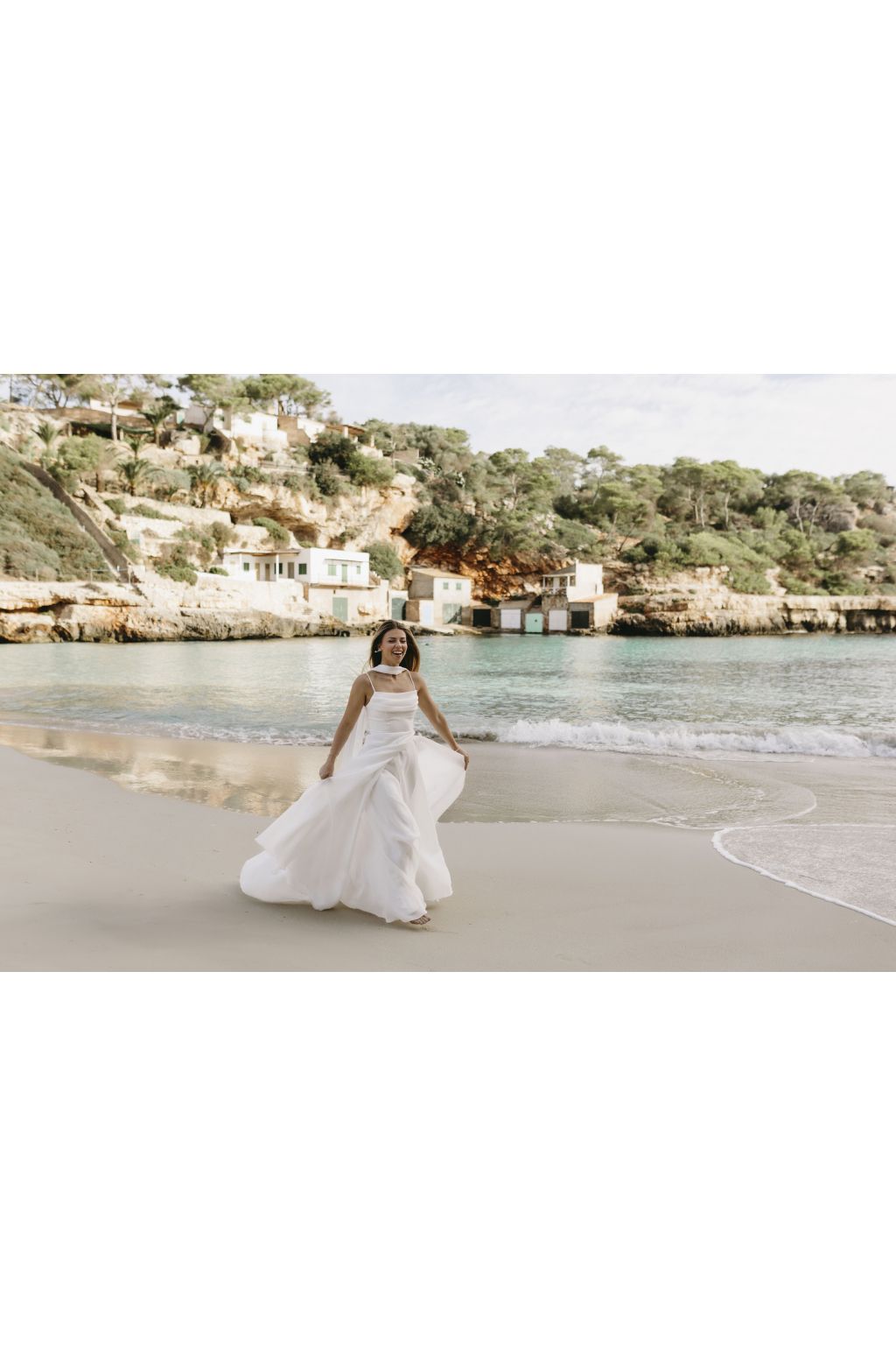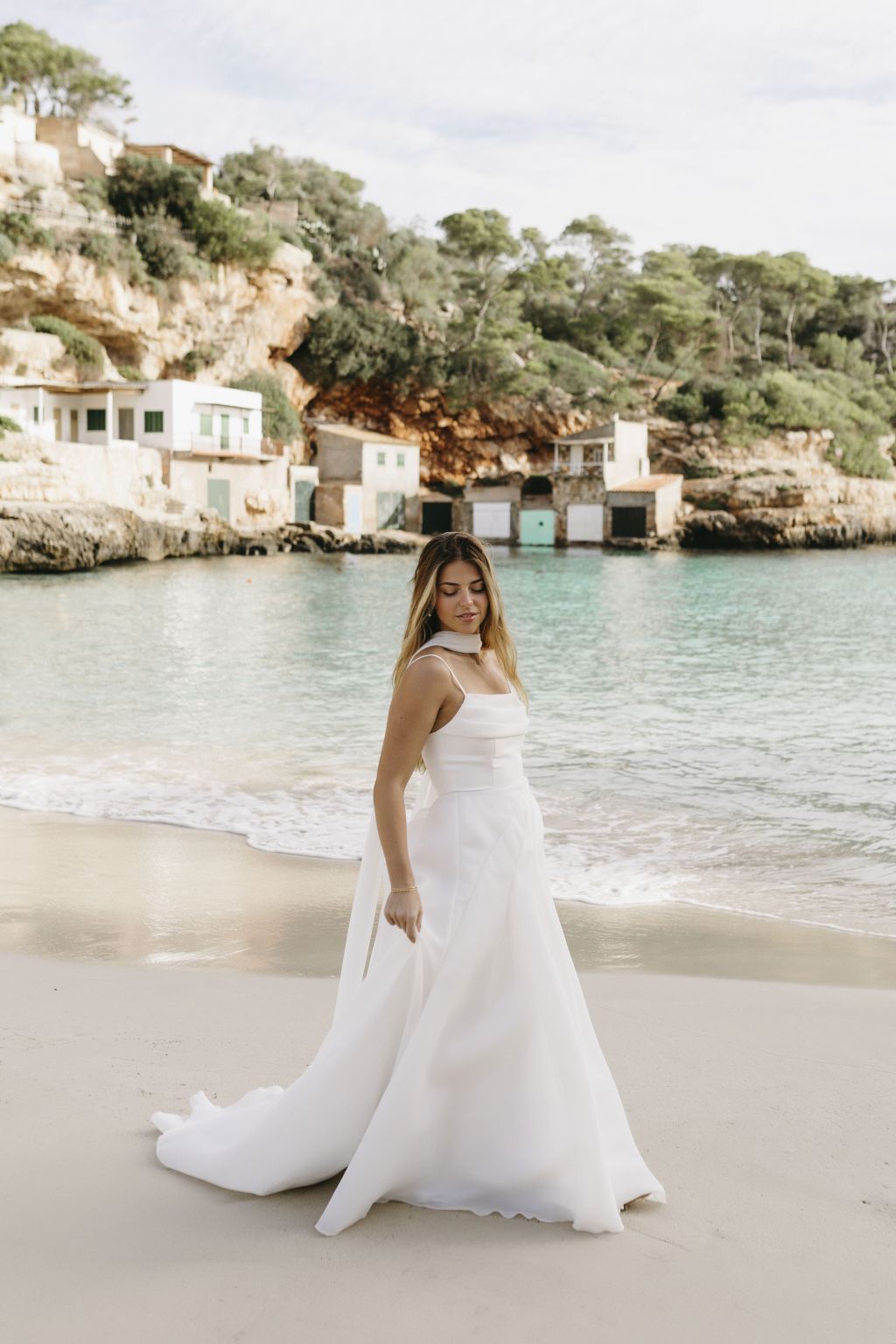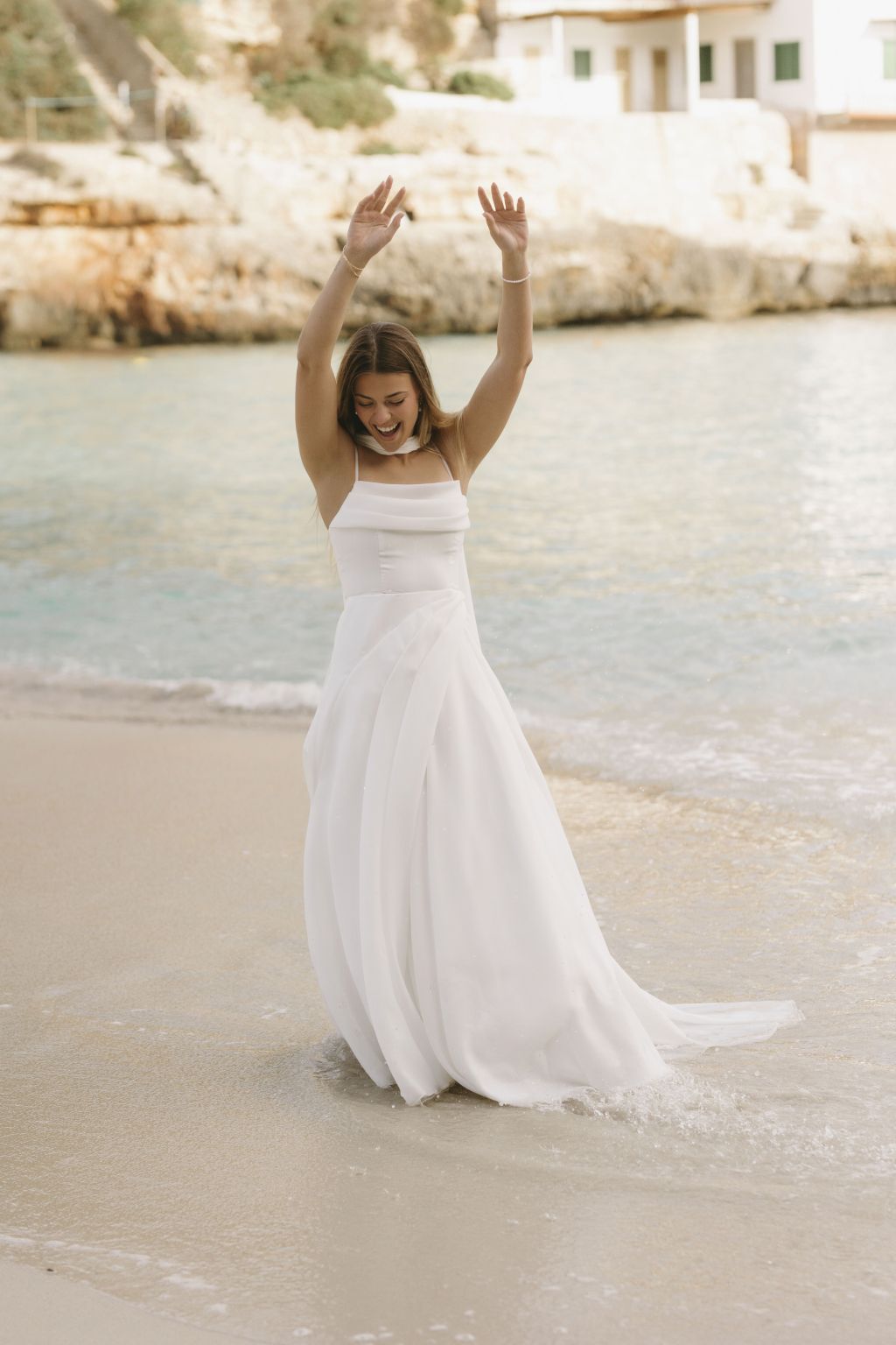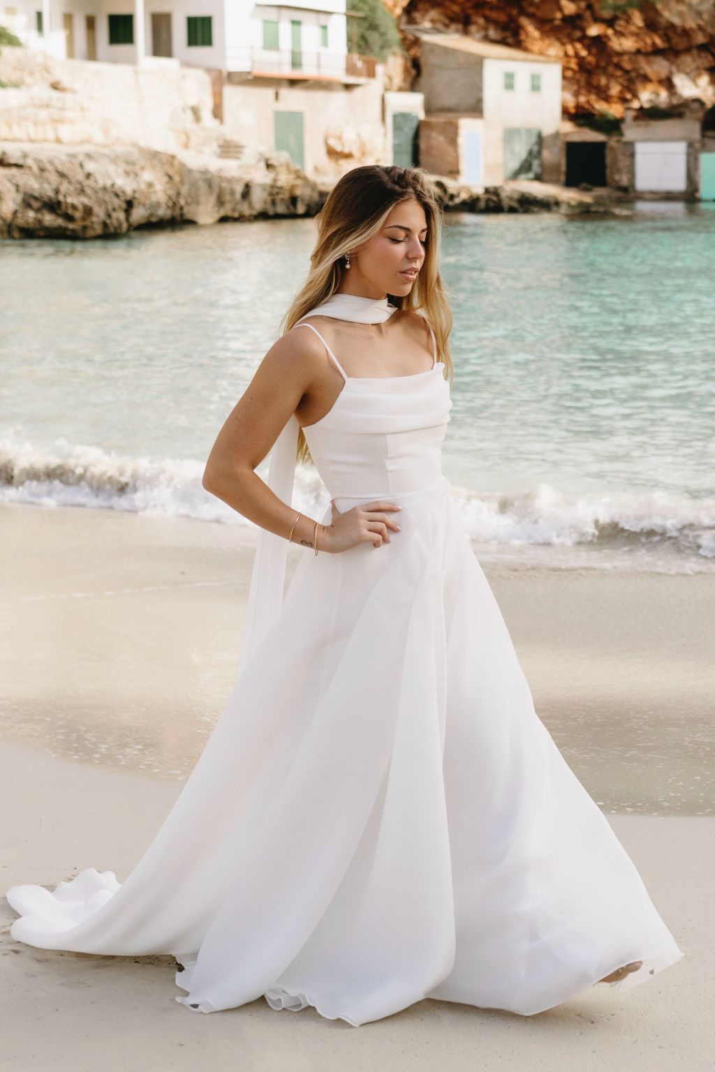 Tyto minimalistické svatební šaty jsou dokonalým ztělesněním elegance a nadčasového stylu. Jemné linie a splývavý střih působí lehce a vzdušně, což dodává nevěstě smyslný a přitom sofistikovaný vzhled. Tenká ramínka a otevřená záda podtrhují ženskost a zajišťují maximální pohodlí po celý den. Splývavá látka jemně kopíruje siluetu, takže šaty přirozeně zdůrazňují postavu, aniž by byly těžké nebo nepohodlné. Dlouhá přídavná sukně z lehkého materiálu dodává modelu luxusní a dramatický prvek, díky kterému se stanete středem pozornosti. Tento model šatů je ideální volbou pro nevěsty, které hledají jednoduchost, eleganci a moderní přístup v jednom.