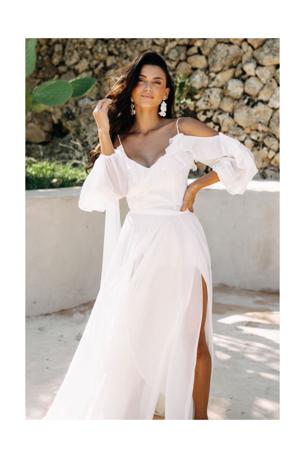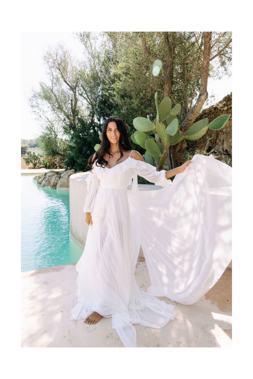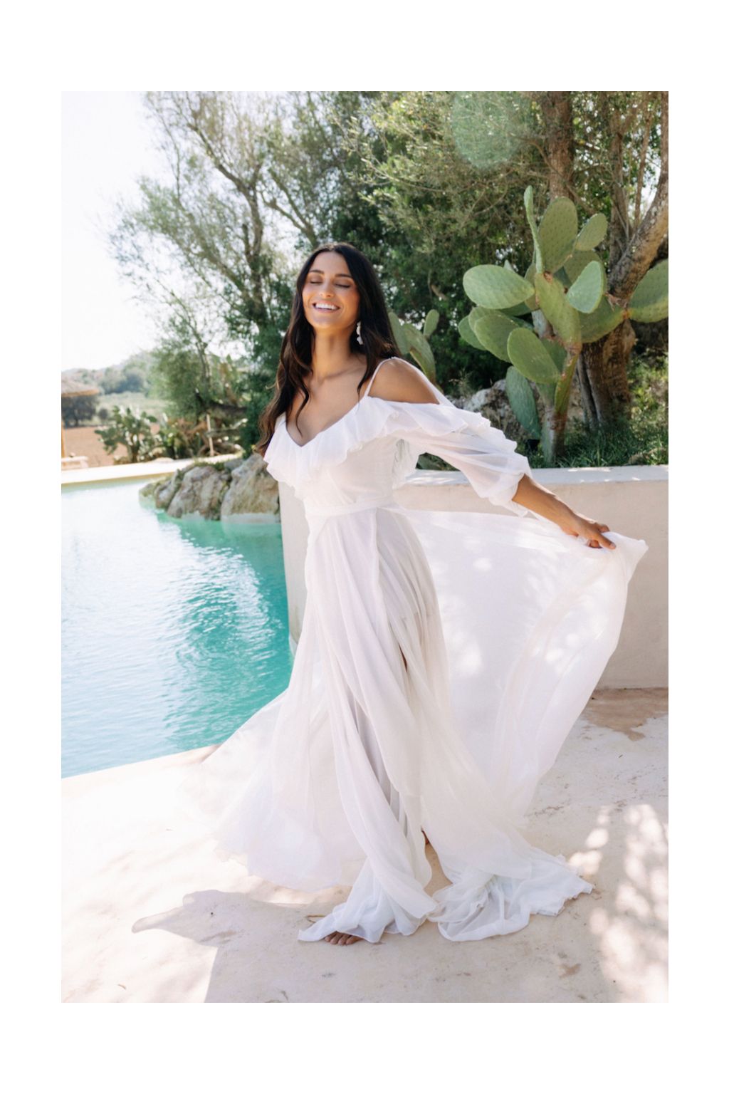Svatební šaty "Daya" nabízí osvěžující a netradiční přístup k svatebnímu stylu, který je ideální pro moderní nevěstu, jež hledá něco odlišného. Tato kouzelná kreace je vyrobena z lehkého šifonu, který vám při každém kroku poskytuje pocit, že se kolem vás vlní tanec tkaniny. Přední výstřih doplňují nádherné volánky, stejně jako dlouhé rukávy, které dodávají šatům poetický a romantický nádech. Unikátní design sukně vytváří vrstvený a éterický efekt. Díky krátké podšívce je sukně mírně průhledná, což dodává šatům smyslný dotek. Sukně je navíc ušitá z několika šifonových dílů, což jí dodává dynamiku a hru světel. Pro dokonalé nošení a aby šaty perfektně odrážely vaše křivky, ušijeme vám je na míru. S šaty Daya budete vyzařovat originalitu a kouzlo na svém speciálním dni.