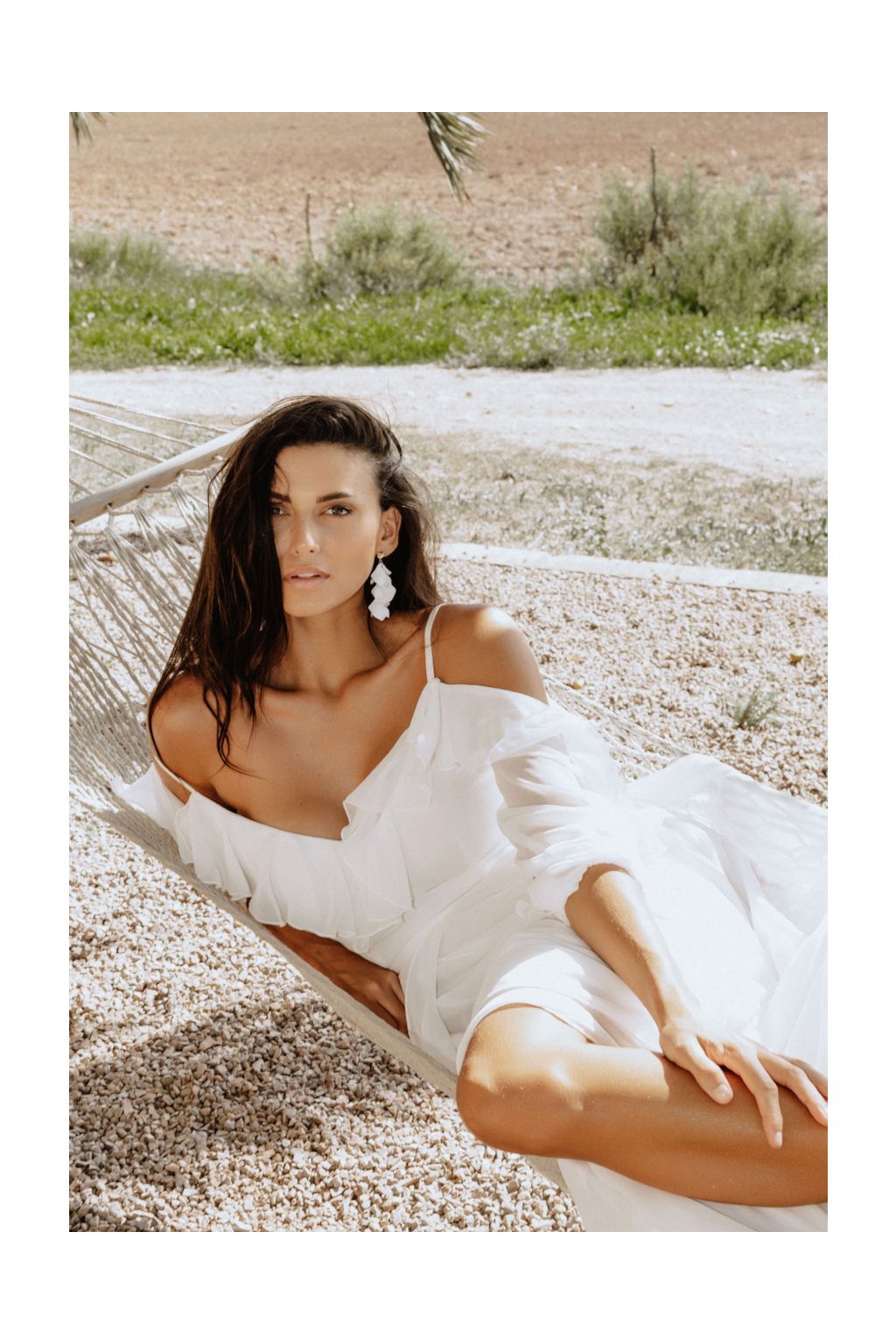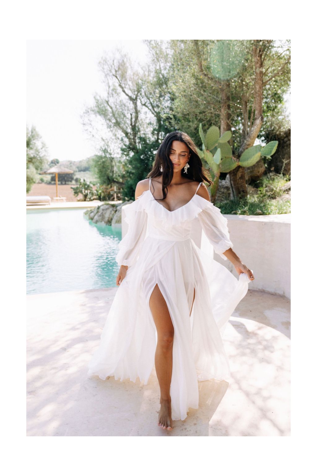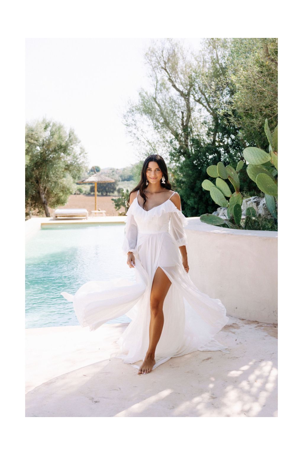 Svatební šaty "Daya" nabízí osvěžující a netradiční přístup k svatebnímu stylu, který je ideální pro moderní nevěstu, jež hledá něco odlišného. Tato kouzelná kreace je vyrobena z lehkého šifonu, který vám při každém kroku poskytuje pocit, že se kolem vás vlní tanec tkaniny. Přední výstřih doplňují nádherné volánky, stejně jako dlouhé rukávy, které dodávají šatům poetický a romantický nádech. Unikátní design sukně vytváří vrstvený a éterický efekt. Díky krátké podšívce je sukně mírně průhledná, což dodává šatům smyslný dotek. Sukně je navíc ušitá z několika šifonových dílů, což jí dodává dynamiku a hru světel. Pro dokonalé nošení a aby šaty perfektně odrážely vaše křivky, ušijeme vám je na míru. S šaty Daya budete vyzařovat originalitu a kouzlo na svém speciálním dni.
