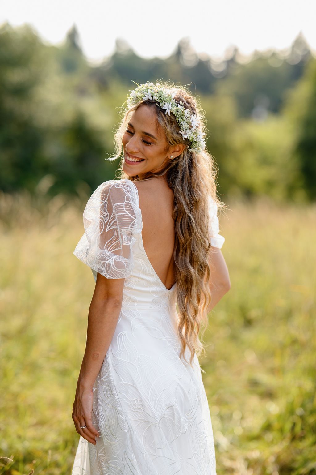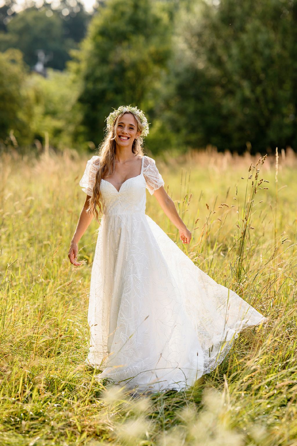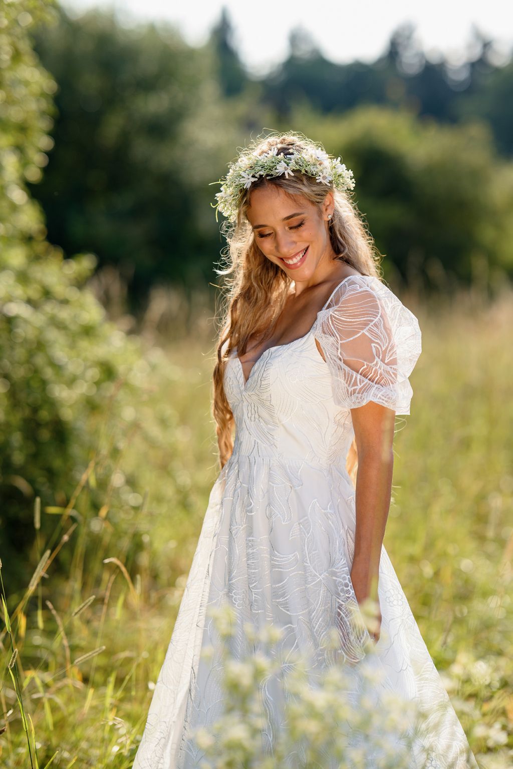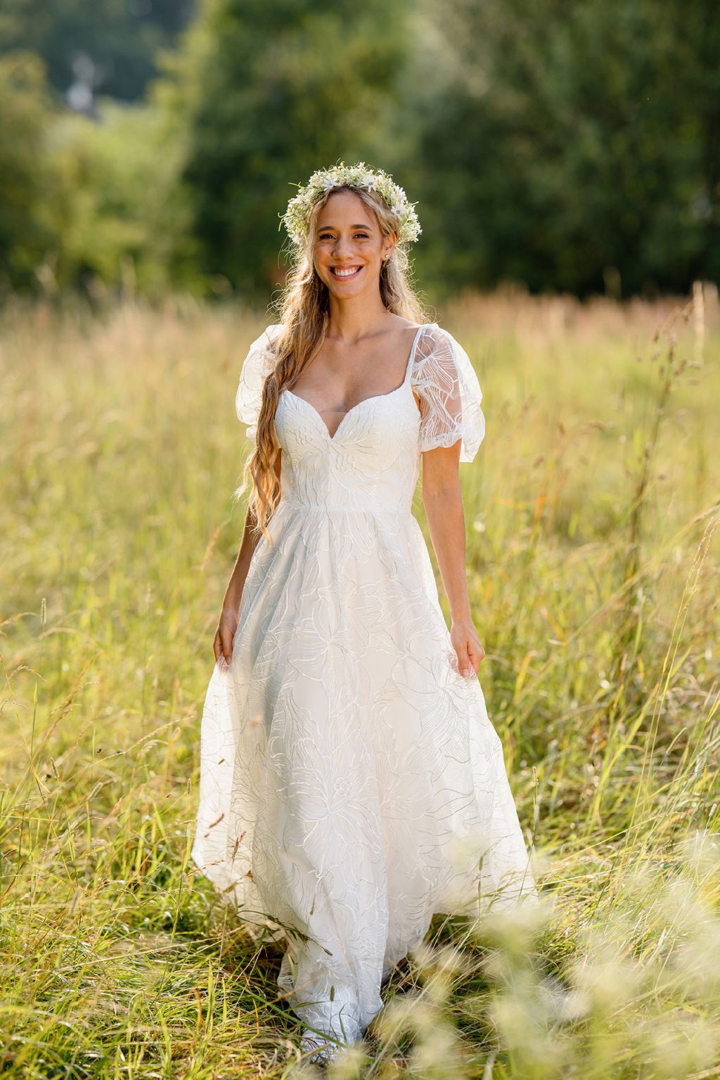Model Elly jsou šaty, které září lehkostí a jemnou romantikou. Bohatý květinový vzor na látce působí jako rozkvetlá zahrada a dodává šatům přirozený půvab. Nadýchané rukávky se vzdušnou strukturou přinášejí hravost, zatímco lehce projmutý živůtek s jemným výstřihem podtrhuje ženskou siluetu. Elly jsou šaty, ve kterých se nevěsta promění v éterickou vílu – jemnou, svobodnou a naprosto okouzlující.