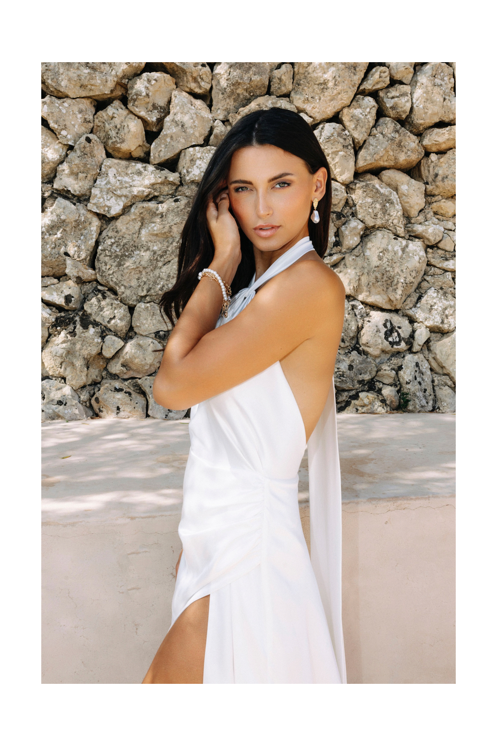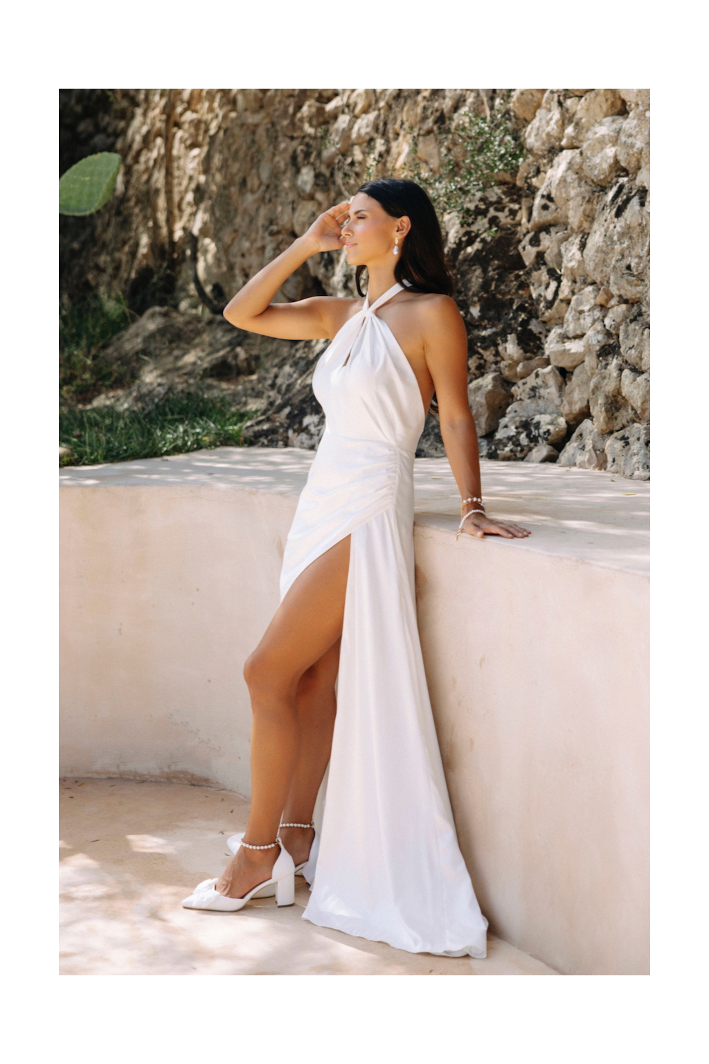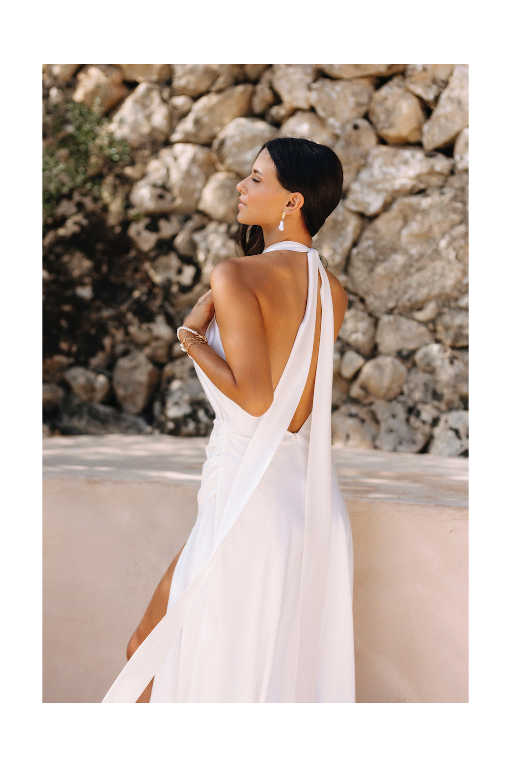 Svatební šaty "Kaira" jsou mistrovským dílem moderního minimalismu. Na první pohled zaujmou originálním vázaním za krk zakončeným dlouhou mašlí, což přidává špetku osobitosti. Elegantní užší sukně, doplněná rafinovaným řasením a provokativním rozparkem, podtrhuje ženskou siluetu a elegance těchto šatů. Materiál lehkého svatebního saténu působí vzdušně a nádherně se mění s každým pohybem nevěsty. Abychom zajistili, že šaty budou perfektní extenzí vašeho stylu a osobnosti, ušijeme je speciálně na míru.