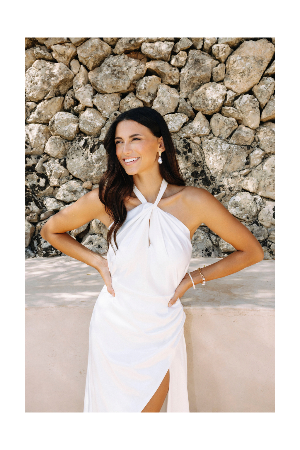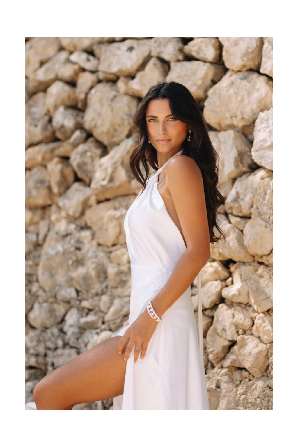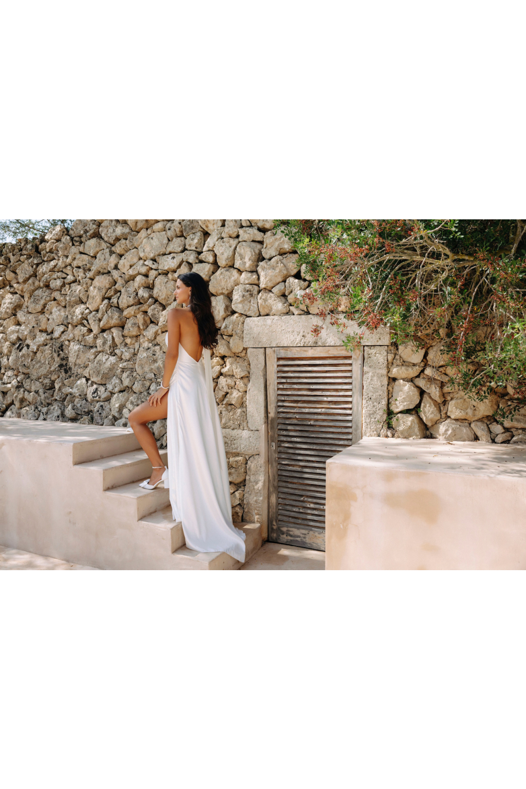 Svatební šaty "Kaira" jsou mistrovským dílem moderního minimalismu. Na první pohled zaujmou originálním vázaním za krk zakončeným dlouhou mašlí, což přidává špetku osobitosti. Elegantní užší sukně, doplněná rafinovaným řasením a provokativním rozparkem, podtrhuje ženskou siluetu a elegance těchto šatů. Materiál lehkého svatebního saténu působí vzdušně a nádherně se mění s každým pohybem nevěsty. Abychom zajistili, že šaty budou perfektní extenzí vašeho stylu a osobnosti, ušijeme je speciálně na míru.