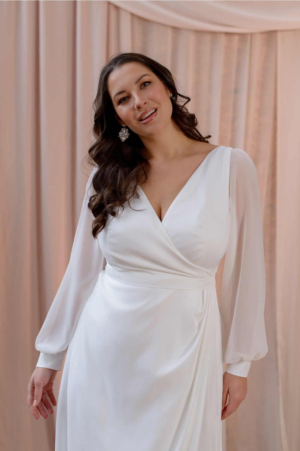 Model Laura jsou šaty, které v sobě spojují čistotu, eleganci a přirozenou krásu. Jemně projmutý živůtek s hlubším výstřihem působí ženským a sebevědomým dojmem, zatímco dlouhé šifonové rukávy zakončené manžetou dodávají šatům jemnou noblesu. Splývavá saténová sukně s bočním řasením a rozparkem podtrhuje lehkost celého modelu a umožňuje nevěstě volný pohyb. Laura jsou šaty, které jako by v sobě nesly klid a harmonii přírody – ideální volba pro romantický svatební den v srdci krajiny.