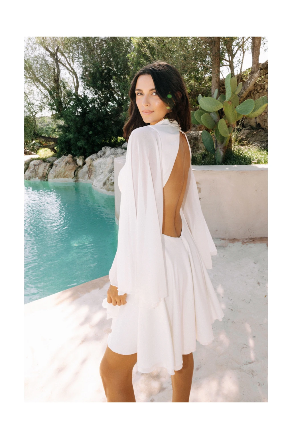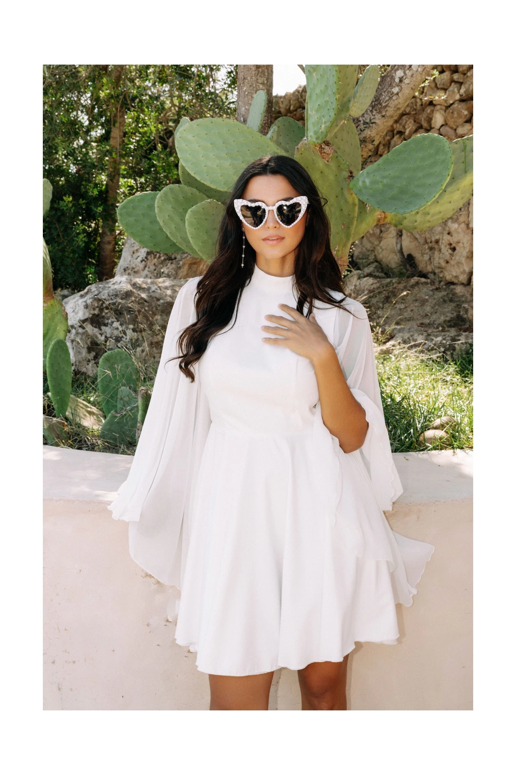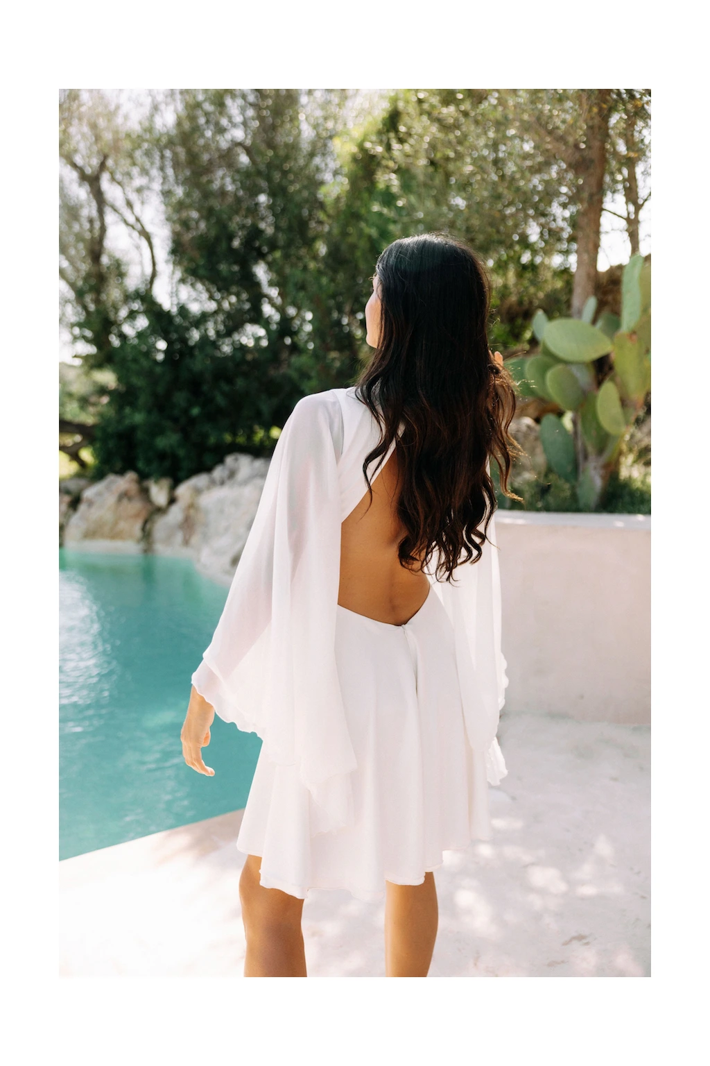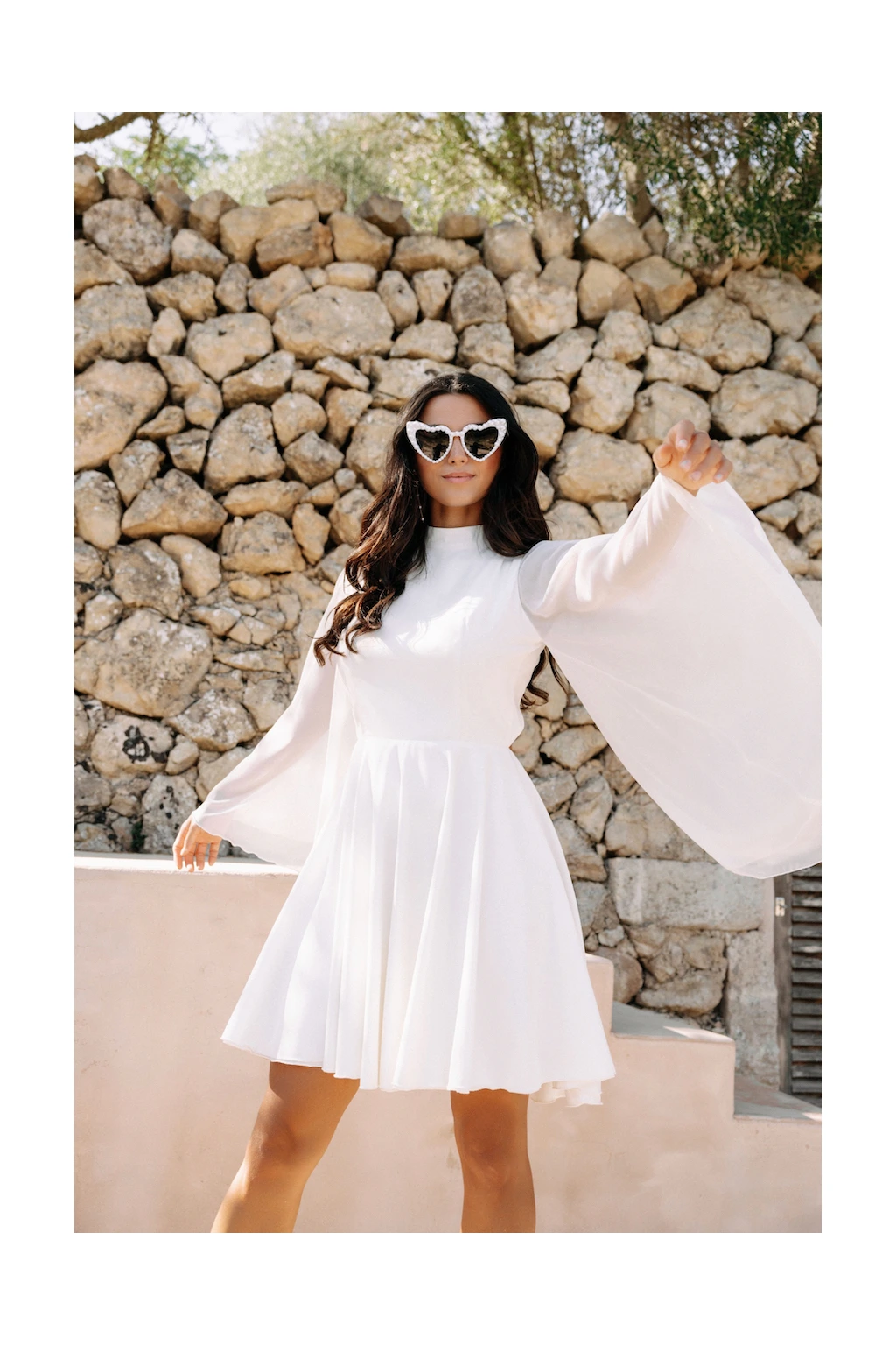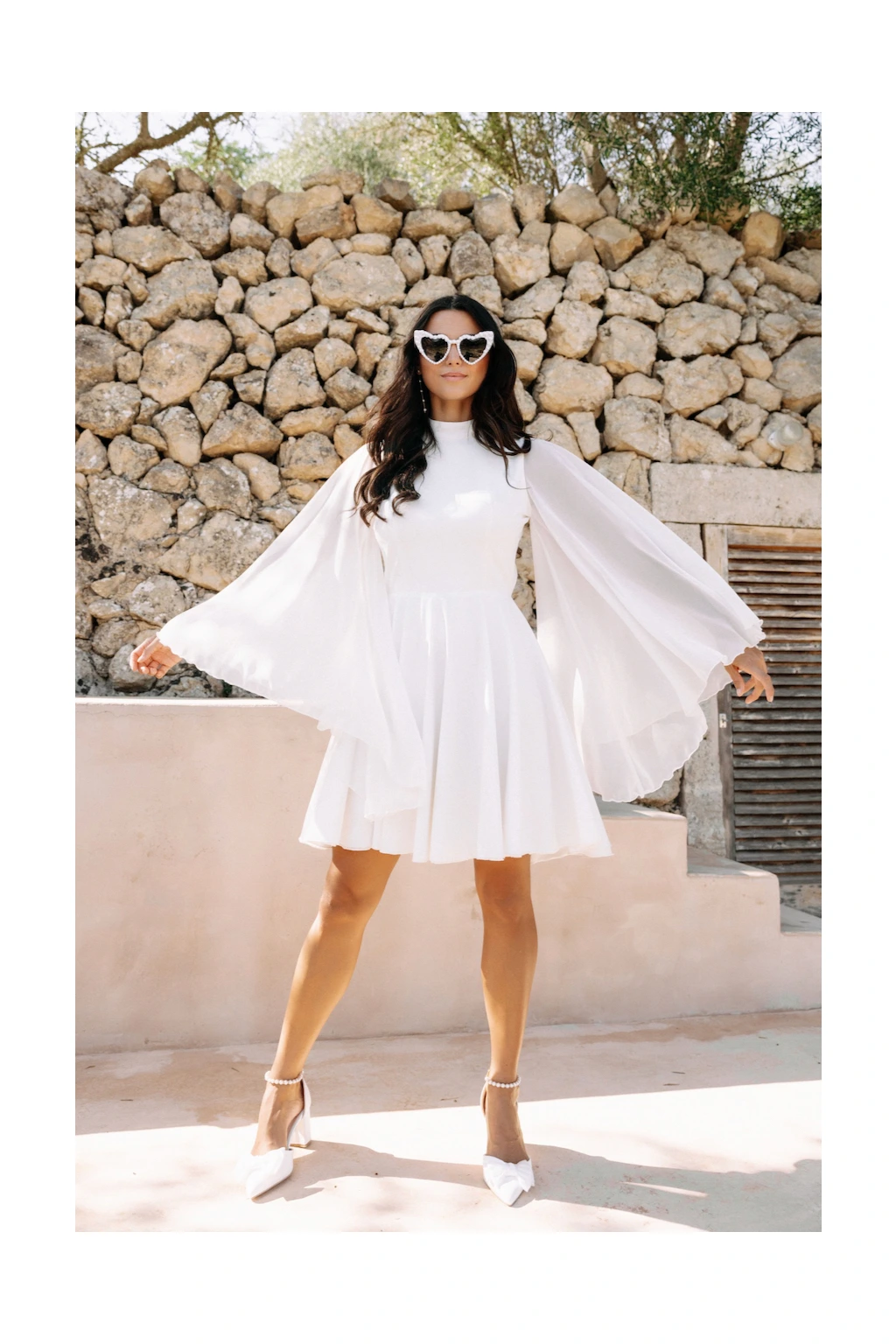 Svatební šaty "Leila-mini" jsou ztělesněním snu každé nevěsty, která touží po kombinaci jedinečnosti a elegance. Na první pohled vás zaujmou výrazné široké rukávy z lehkého šifonu, které plynule přechází do něžné siluety šatů. Tento detail nejen dodává šatům vzdušný a poetický charakter, ale také vytváří harmonický kontrast s krátkou kolovou sukénkou, což umožňuje nevěstě volně se pohybovat a tančit. Přední stojáček elegantně rámující krk dodává šatům nádech sofistikovanosti a klidné elegance. Kontrastně otevřená záda však přináší prvky odvážnosti a smyslnosti, což zaručeně upoutá pozornost každého hosta. A protože každá nevěsta si zaslouží, aby se cítila jako v pohádce, ušijeme šaty "Leila-mini" přesně na míru. Díky tomu budou dokonale kopírovat linie vašeho těla a zdůrazní vše, co na vás je kouzelné. V těchto šatech nejen oslníte všechny přítomné, ale také si užijete každý okamžik svého svatebního dne v naprostém pohodlí.
