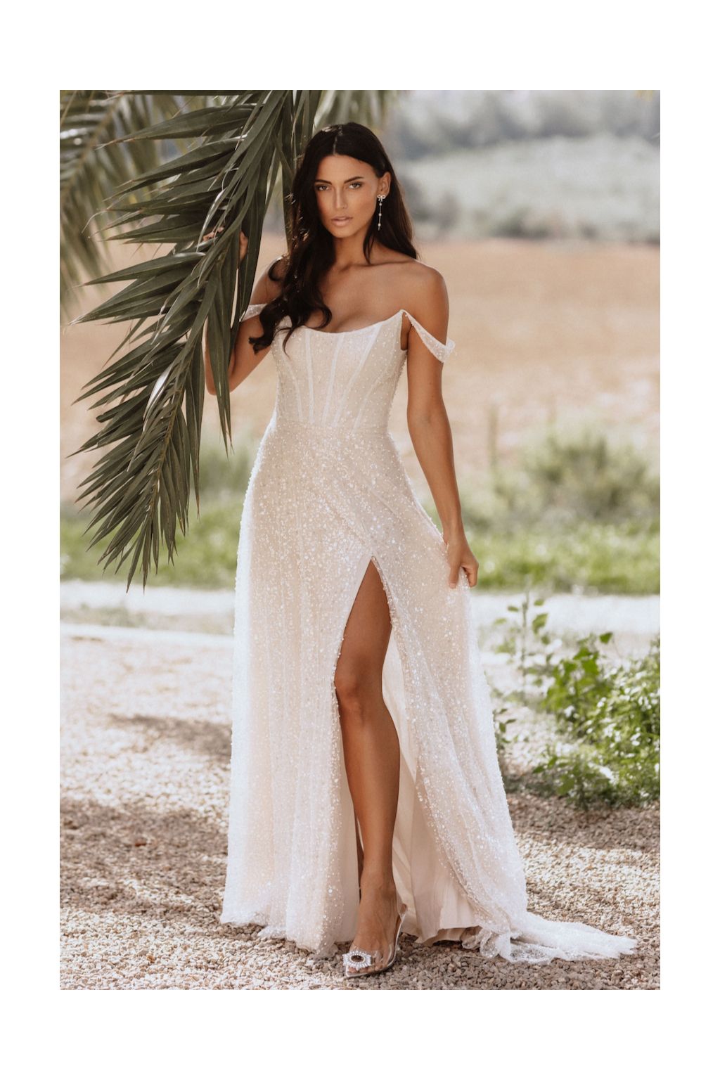 Svatební šaty Luna vám přinesou pocit skutečného luxusu a elegance. Jejich oslňující třpytivý povrch okamžitě přitahuje pozornost a dodává svůdný nádech vašemu velkému dni. Korzetový živůtek na šňerování dokonale zvýrazní vaše křivky, zatímco spadlá ramínka dodávají jemný a ženský dotek. Dlouhá splývavá sukně, která něžně padá k zemi, je doplněna odvážným rozparkem a elegantní vlečkou, což vytváří dokonalou kombinaci smyslnosti a tradičního vzhledu. Barva tylu je křídově bílá a kontrastuje s něžnou světle krémovou podšívkou. Aby šaty skutečně reflektovaly vaši jedinečnost, ušijeme je na míru, takže budou perfektně sedět a zdůrazní vaši krásu.