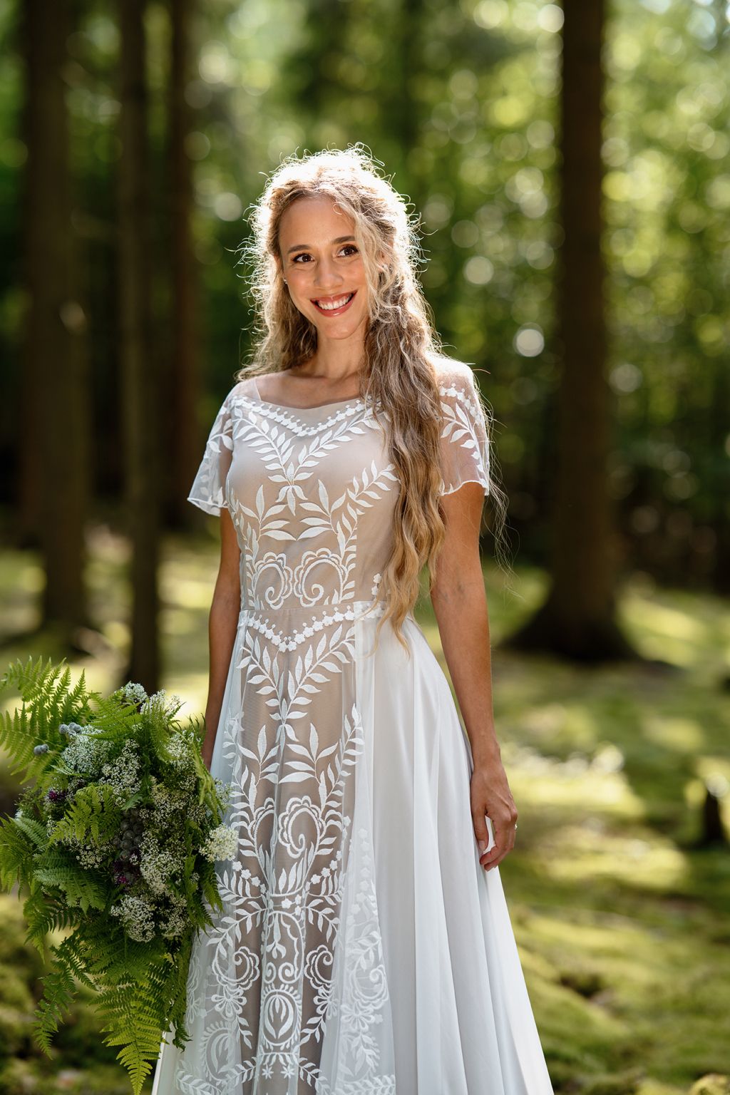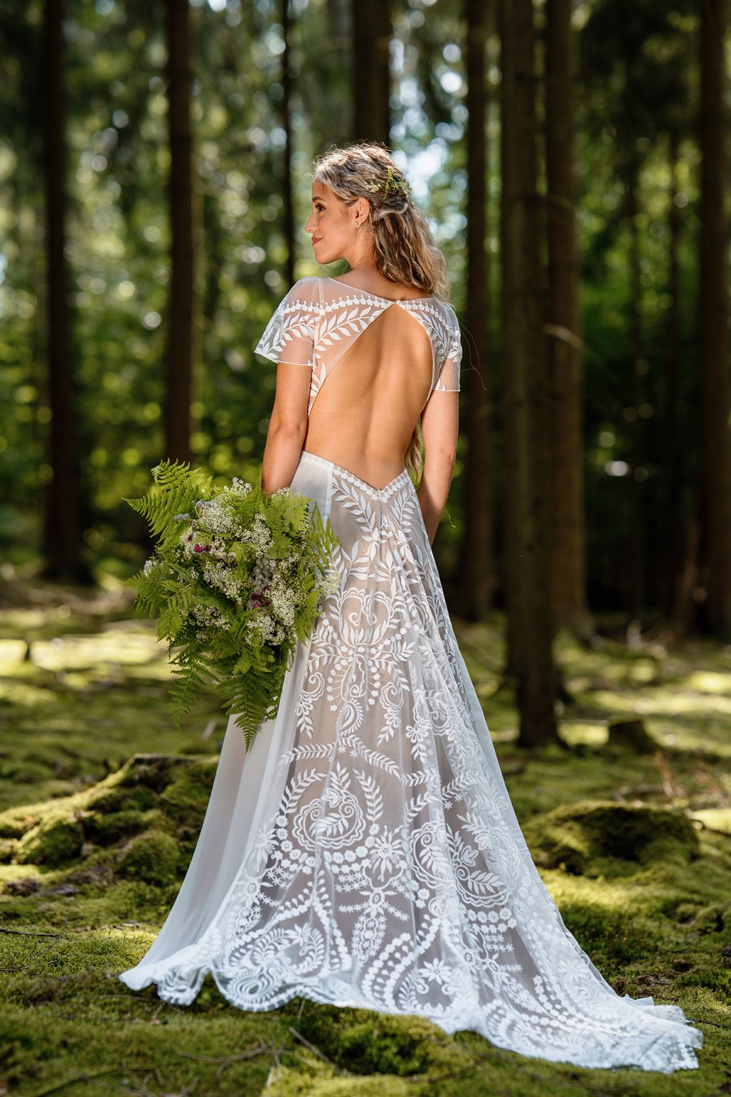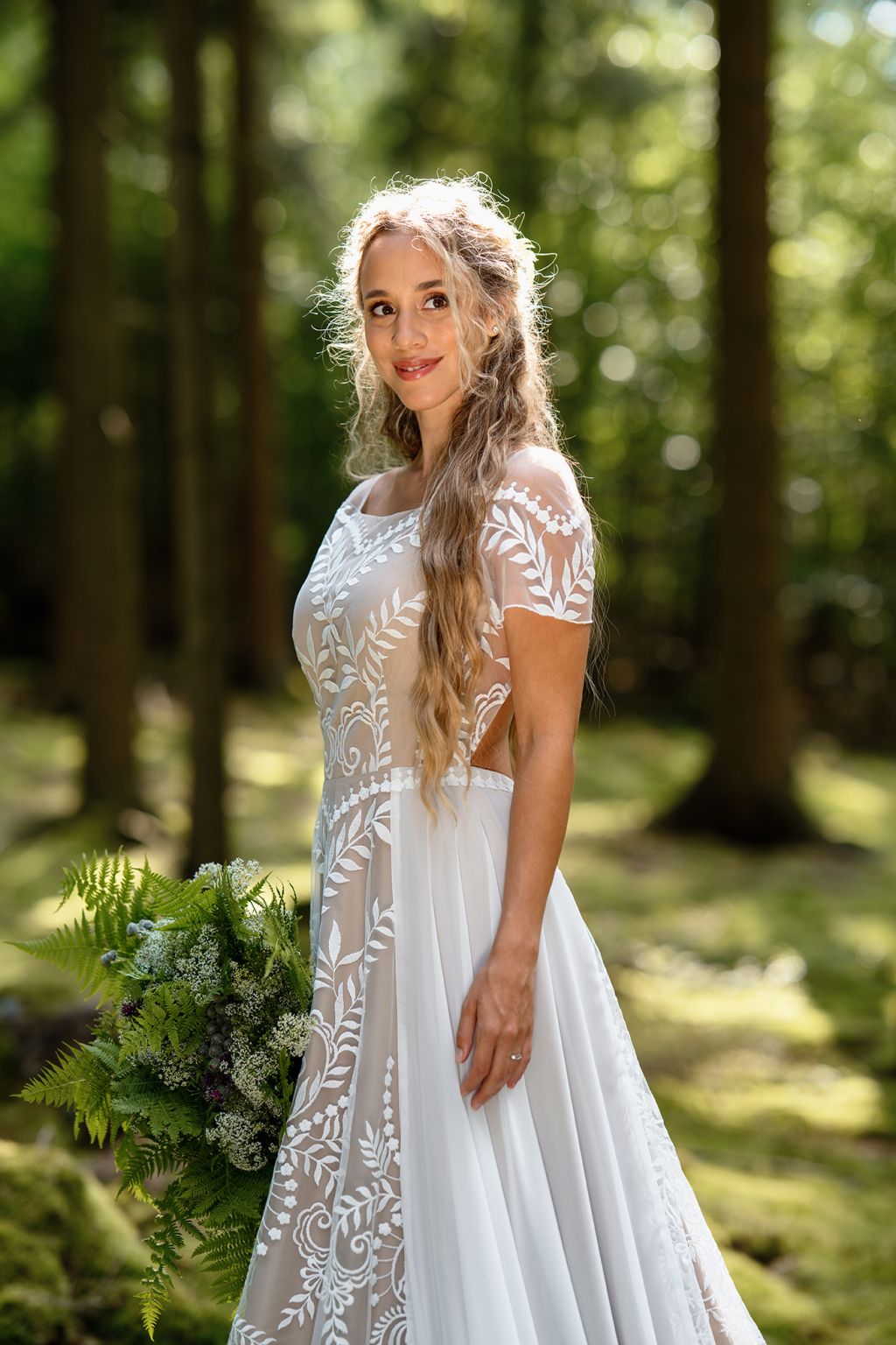 Model Lyra je jemným ztělesněním lesní poezie. Bohatá výšivka na jemném tylu podšitá tělovou barvou vytváří iluzi, že je látka součástí přírody sama. Hravý ornament připomíná zpěv ptáků a šum listů, zatímco lehce rozšířená sukně volně splývá kolem postavy a působí vzdušně a elegantně. Tento model dokonale zvýrazní ženskou siluetu a zároveň si uchovává lehkost a nenucenou přirozenost. Lyra jsou šaty, které promění každý krok nevěsty v ladný tanec se světlem a přírodou.