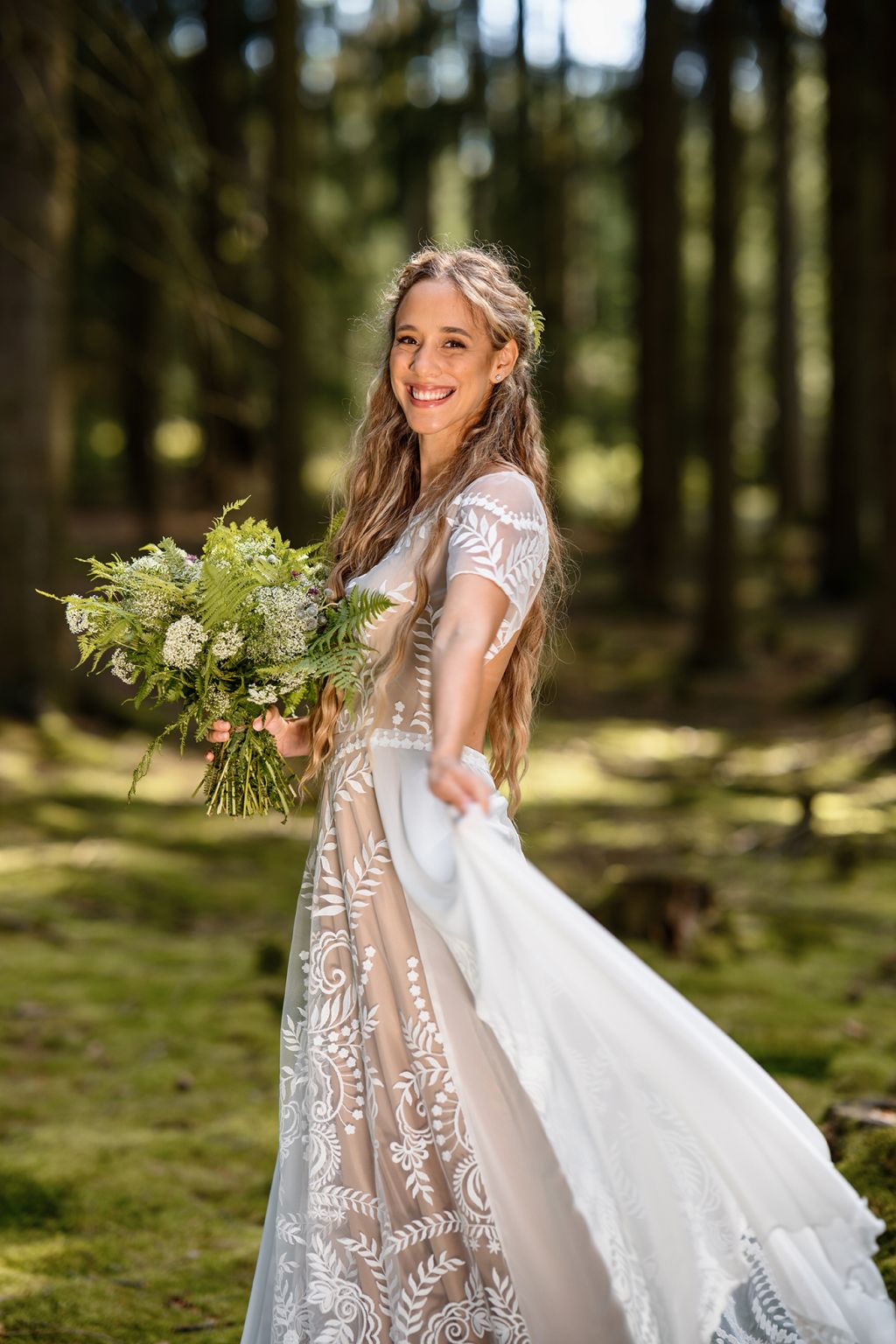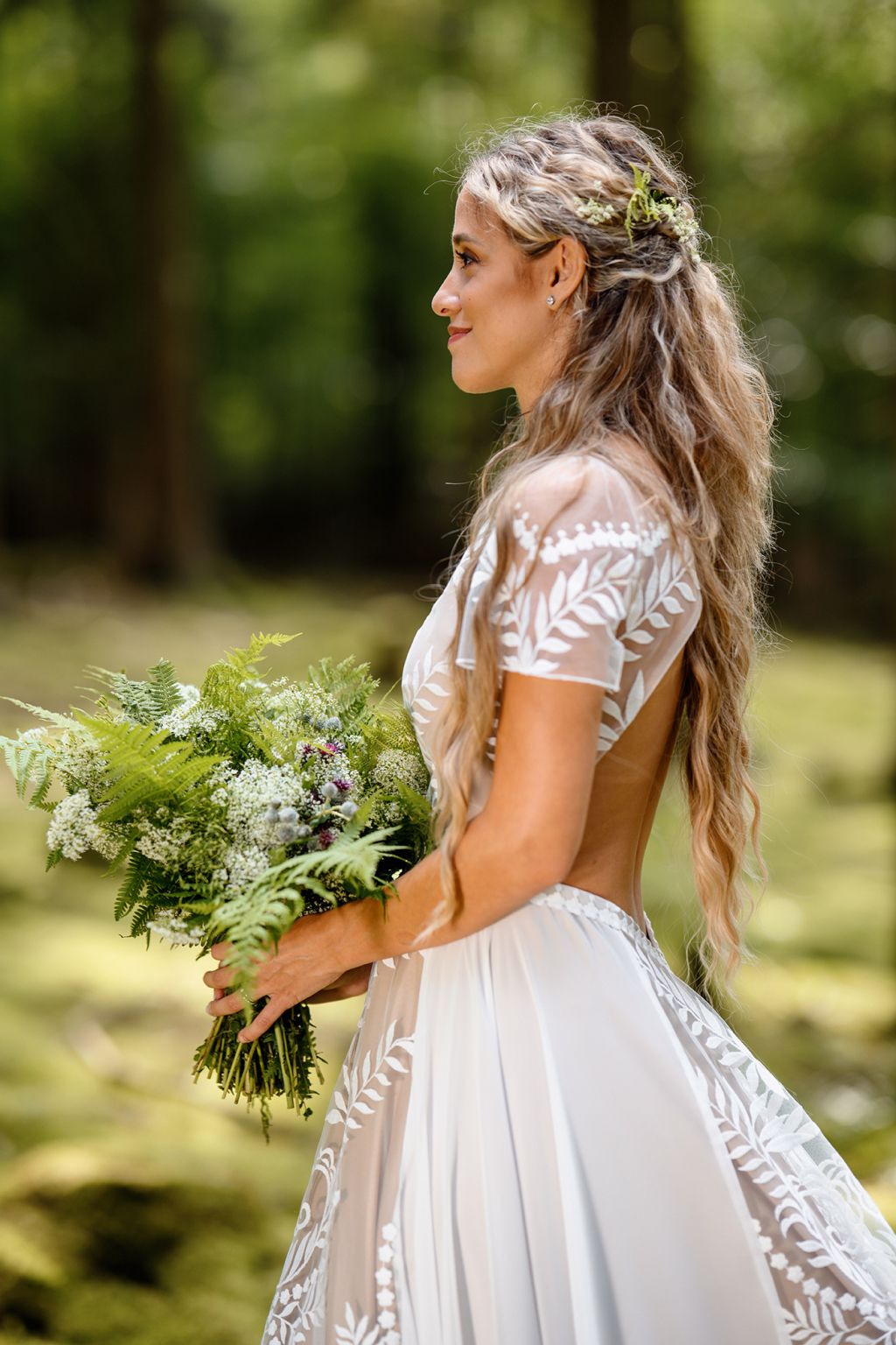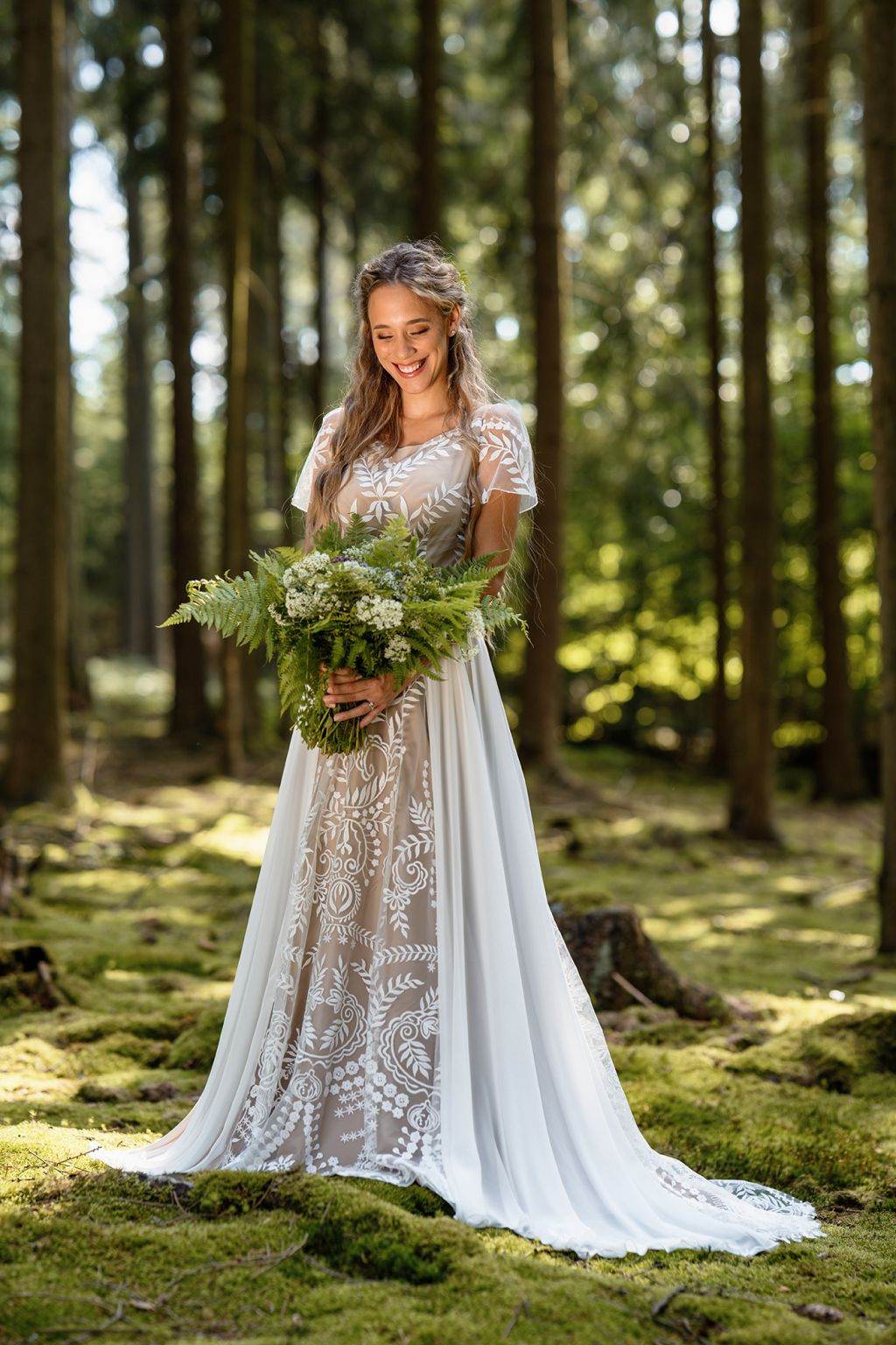 Model Lyra je jemným ztělesněním lesní poezie. Bohatá výšivka na jemném tylu podšitá tělovou barvou vytváří iluzi, že je látka součástí přírody sama. Hravý ornament připomíná zpěv ptáků a šum listů, zatímco lehce rozšířená sukně volně splývá kolem postavy a působí vzdušně a elegantně. Tento model dokonale zvýrazní ženskou siluetu a zároveň si uchovává lehkost a nenucenou přirozenost. Lyra jsou šaty, které promění každý krok nevěsty v ladný tanec se světlem a přírodou.