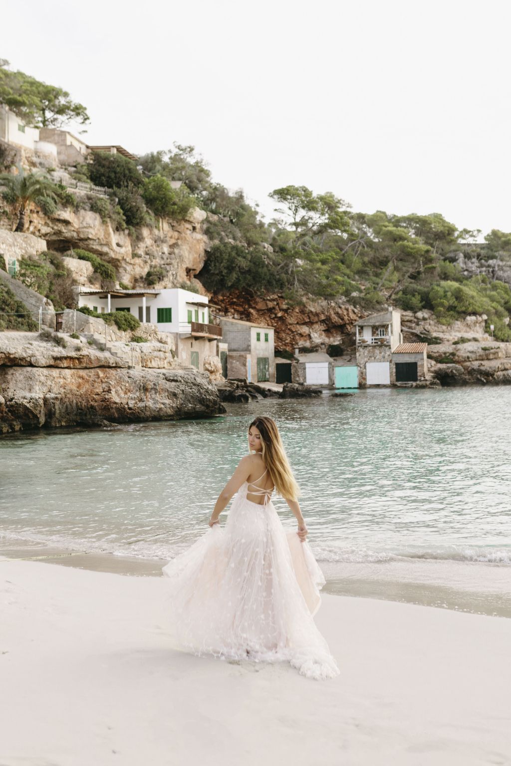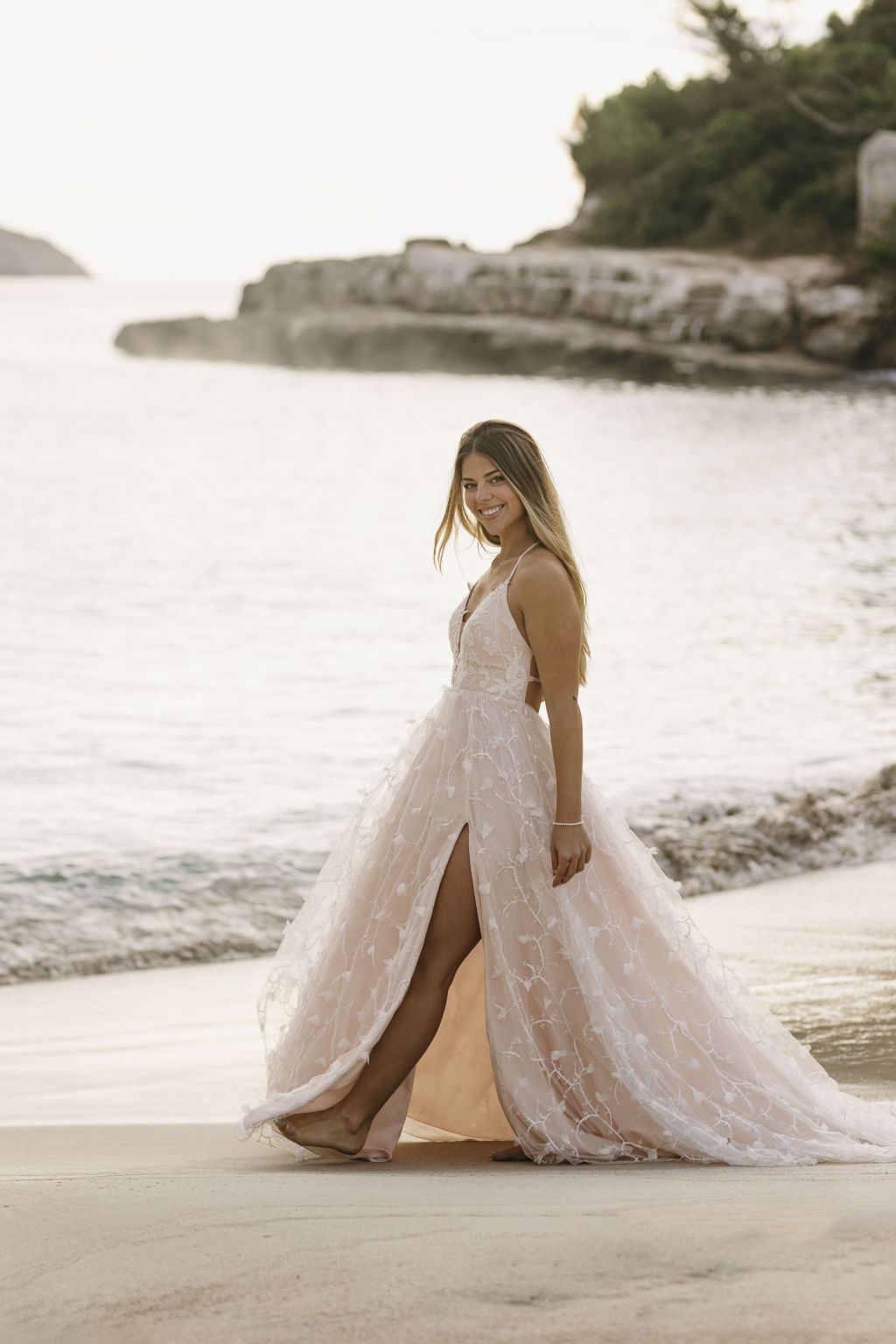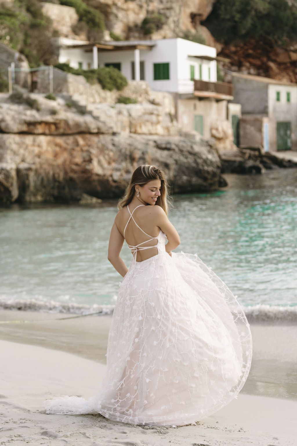 Svatební šaty NEREA jsou dokonalou volbou pro plážovou svatbu. S jemnými květinovými výšivkami a vzdušnou tylovou sukní působí lehce a étericky, což je ideální pro svatební den na slunci a písku. Tenká ramínka a otevřená záda přidávají šatům smyslnost a současně poskytují volnost pohybu, zatímco živůtek bohatě zdobený květinovými detaily zdůrazňuje romantický charakter šatů. Lehký, splývavý materiál je stvořený pro plážovou atmosféru, kde se každá nevěsta bude cítit pohodlně a přirozeně krásně. Šaty jsou navrženy na míru, aby perfektně seděly, a dodají nevěstě uvolněnou eleganci, která je jako stvořená pro plážový svatební den plný lásky a pohody.