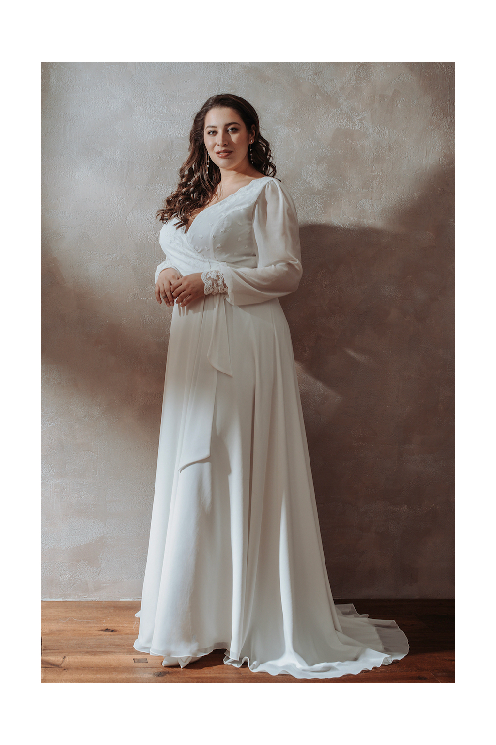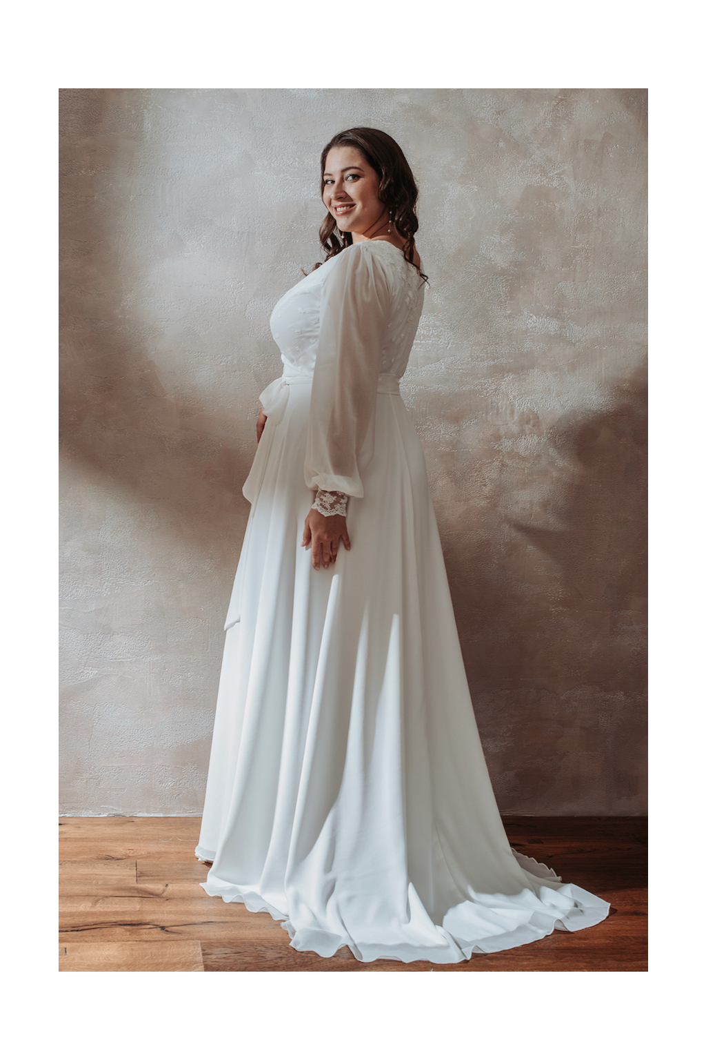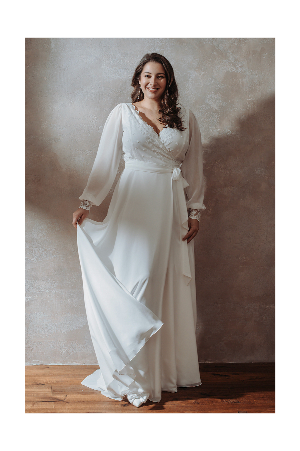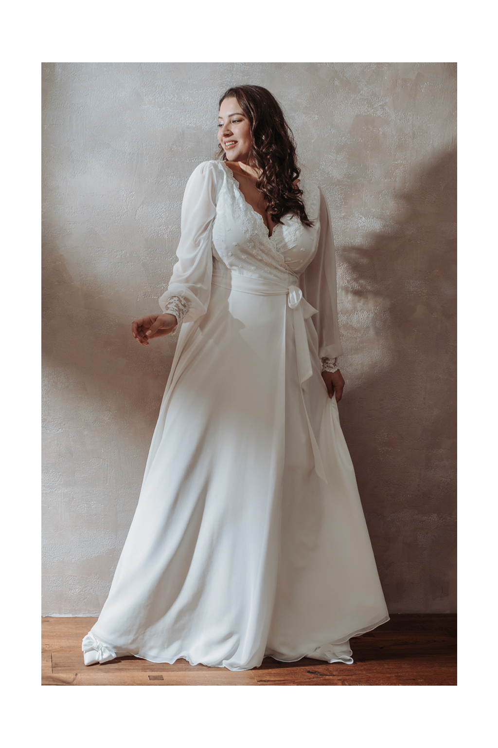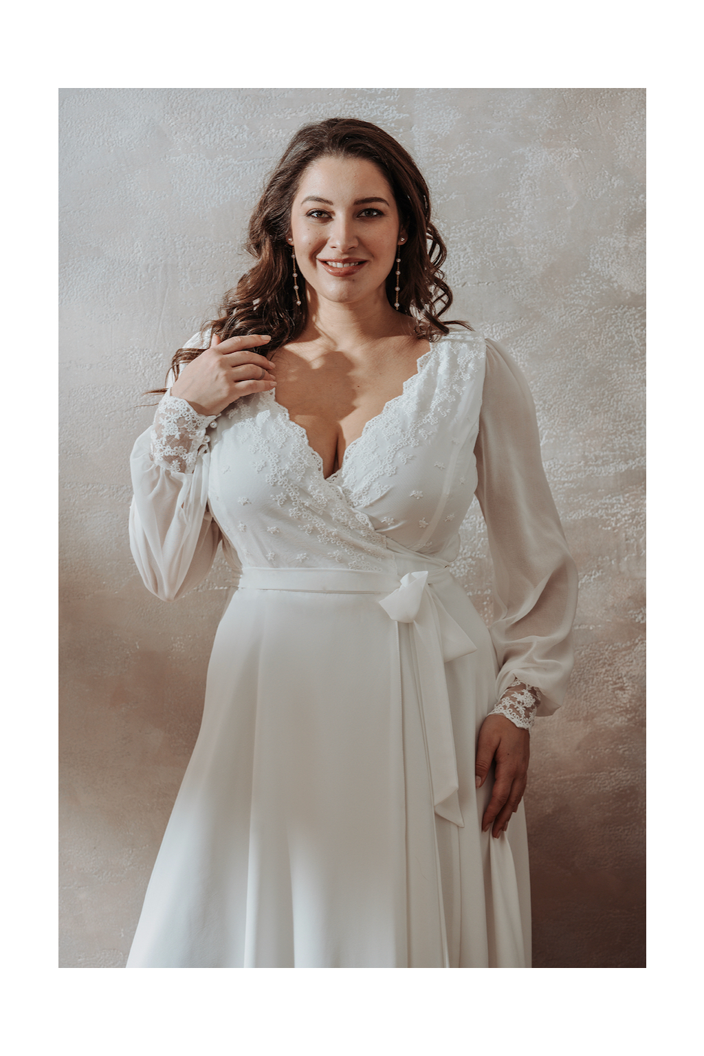 Svatební šaty "Nerida" představují samotnou esenci elegance a pohodlí, spojujíc obou těchto prvků do harmonického celku, který zaujme srdce každé nevěsty. Tyto šaty jsou mistrovským dílem řemesla, ušité z nejjemnější bavlněné krajky kombinované s lehkým šifonem, což vytváří luxusní a vzdušný vzhled. Detailně propracovaný živůtek a manžety rukávů zdobené nádhernou krajkou dodávají šatům rafinovaný a romantický touch. Zadní díl šatů nás překvapuje kouzelným spojením krajky a šifonu kabátku, což vytváří efekt závoje a zároveň dodává šatům vznešenost. Co činí šaty Nerida skutečně výjimečnými, je jejich zavinovací střih. Tento střih nabízí maximální flexibilitu, umožňuje přizpůsobení šatů různým postavám a dokonale lichotí i větším velikostem. Aby byla vaše svatební den opravdu dokonalý, ušijeme vám přímo na míru, takže v nich budete cítit nejen krásně, ale také pohodlně.