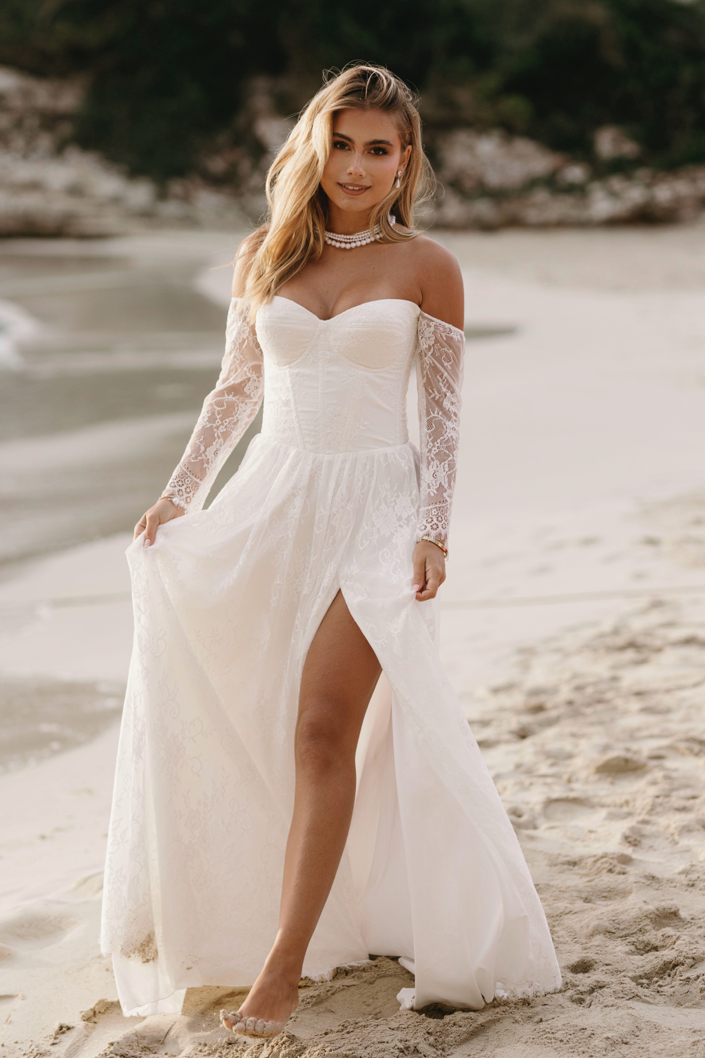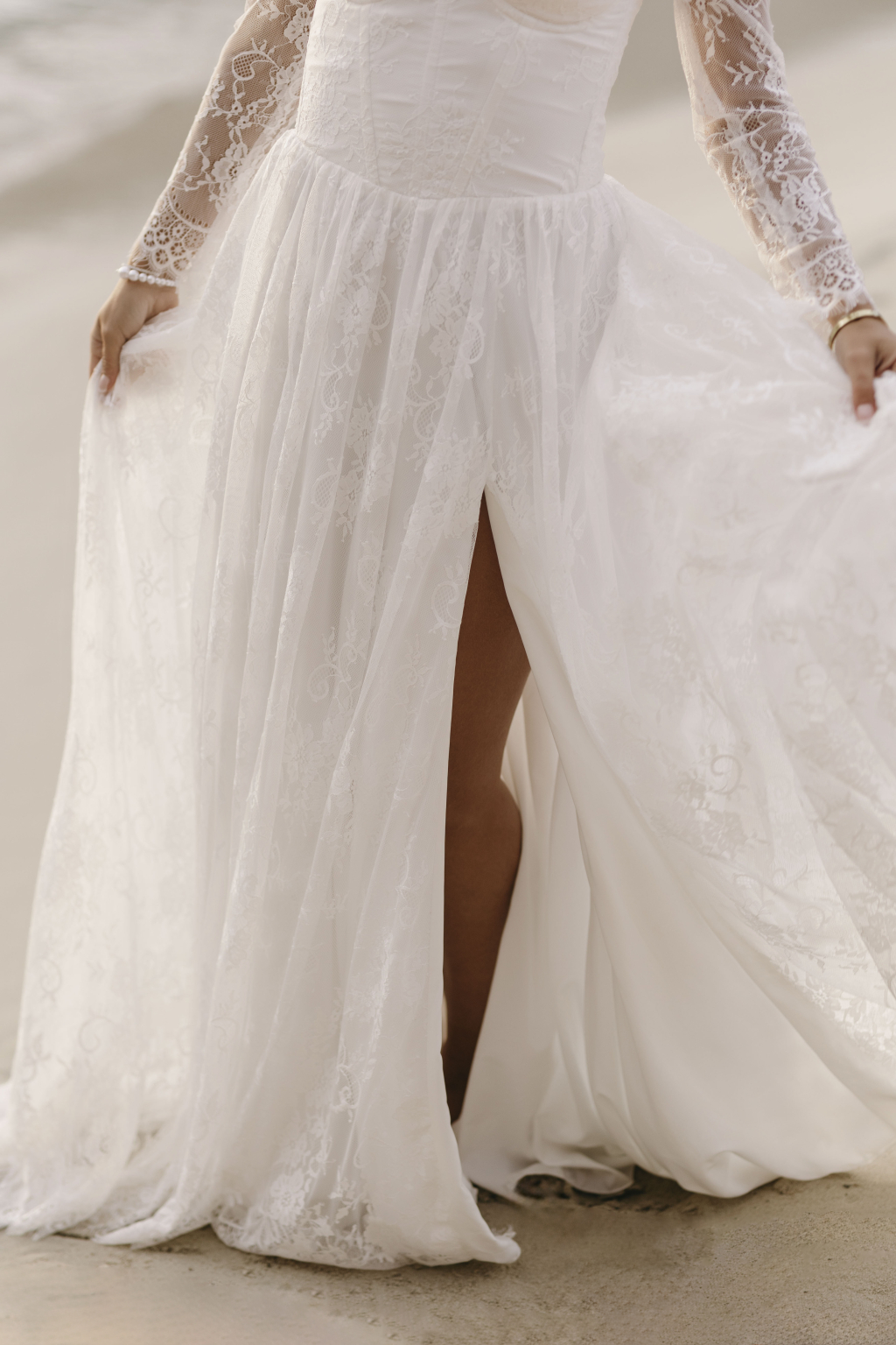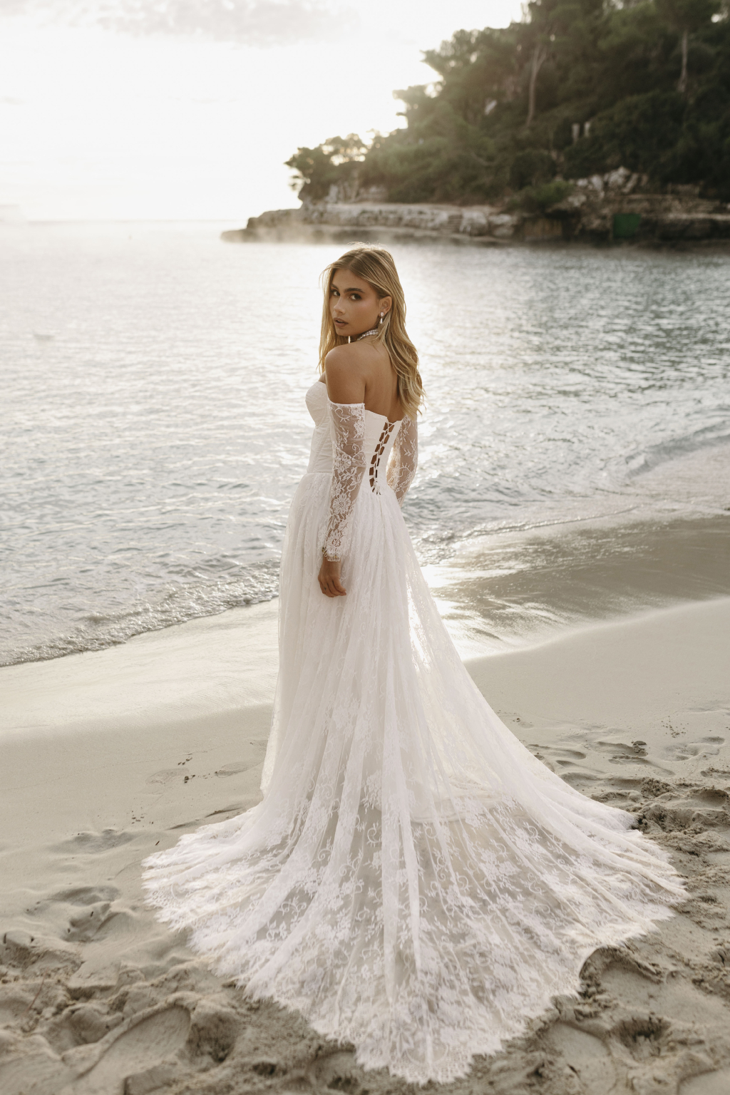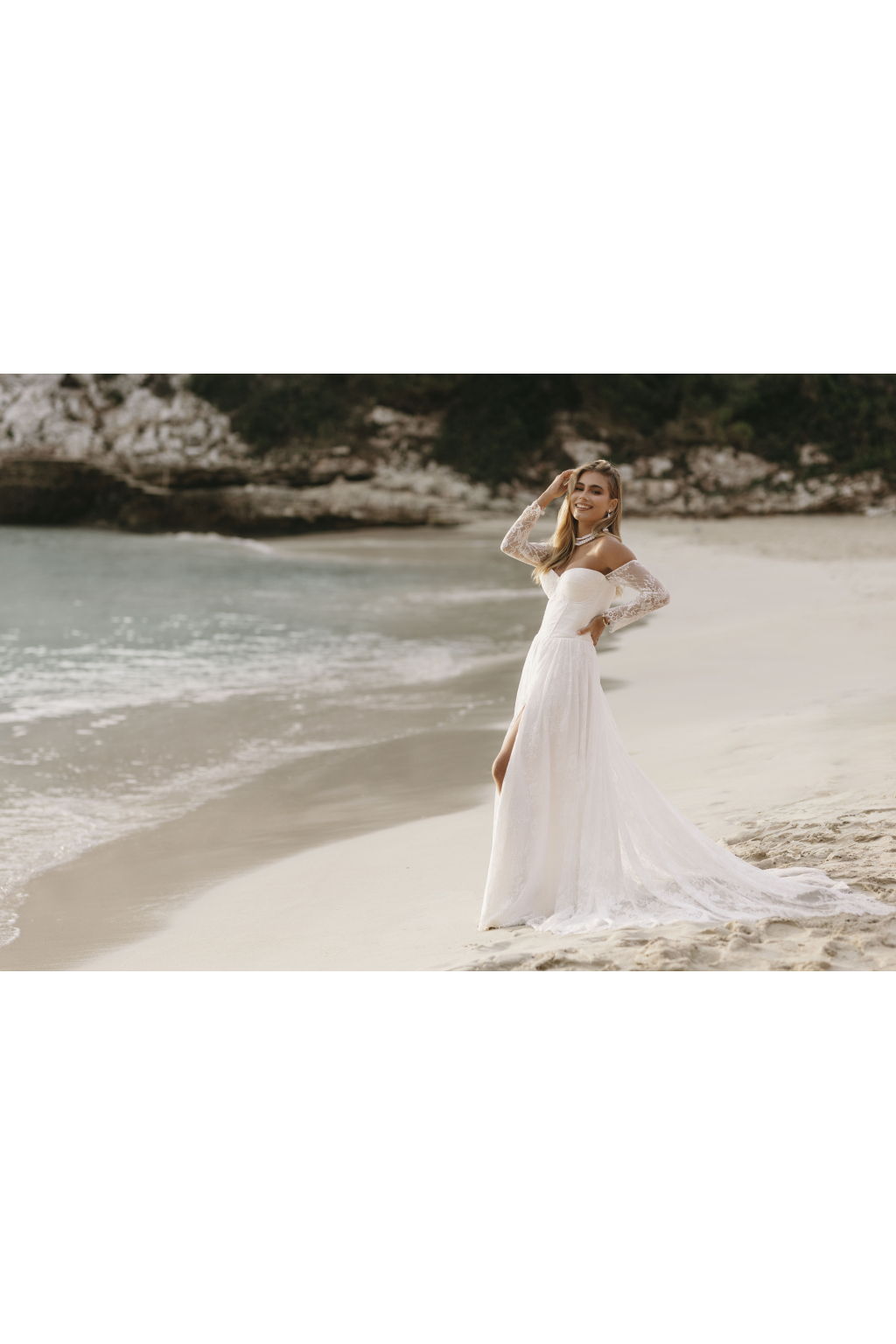 Tyto romantické svatební šaty s elegantním korzetem jsou stvořené pro nevěstu, která hledá jemnost a sofistikovanost. Krajkové rukávy dodávají šatům něžný dotek a přinášejí vyvážený kontrast k hlubokému výstřihu, který působí moderně a zároveň nadčasově. Smyslný rozparek v sukni umožňuje volnost pohybu a dodává šatům nádech odvážné elegance. Kombinace krajky a jemných materiálů vytváří lehkost, která vás bude provázet každým krokem. Každé šaty jsou šité na míru, aby perfektně seděly a zdůraznily vaši jedinečnou krásu na váš nezapomenutelný den.