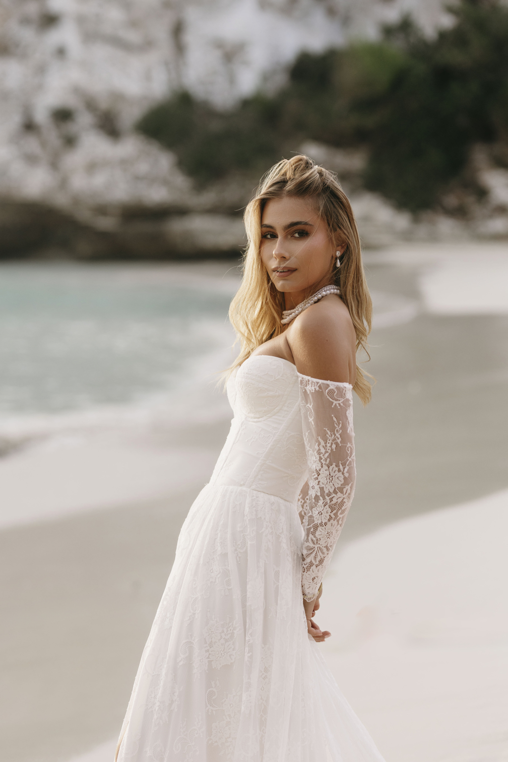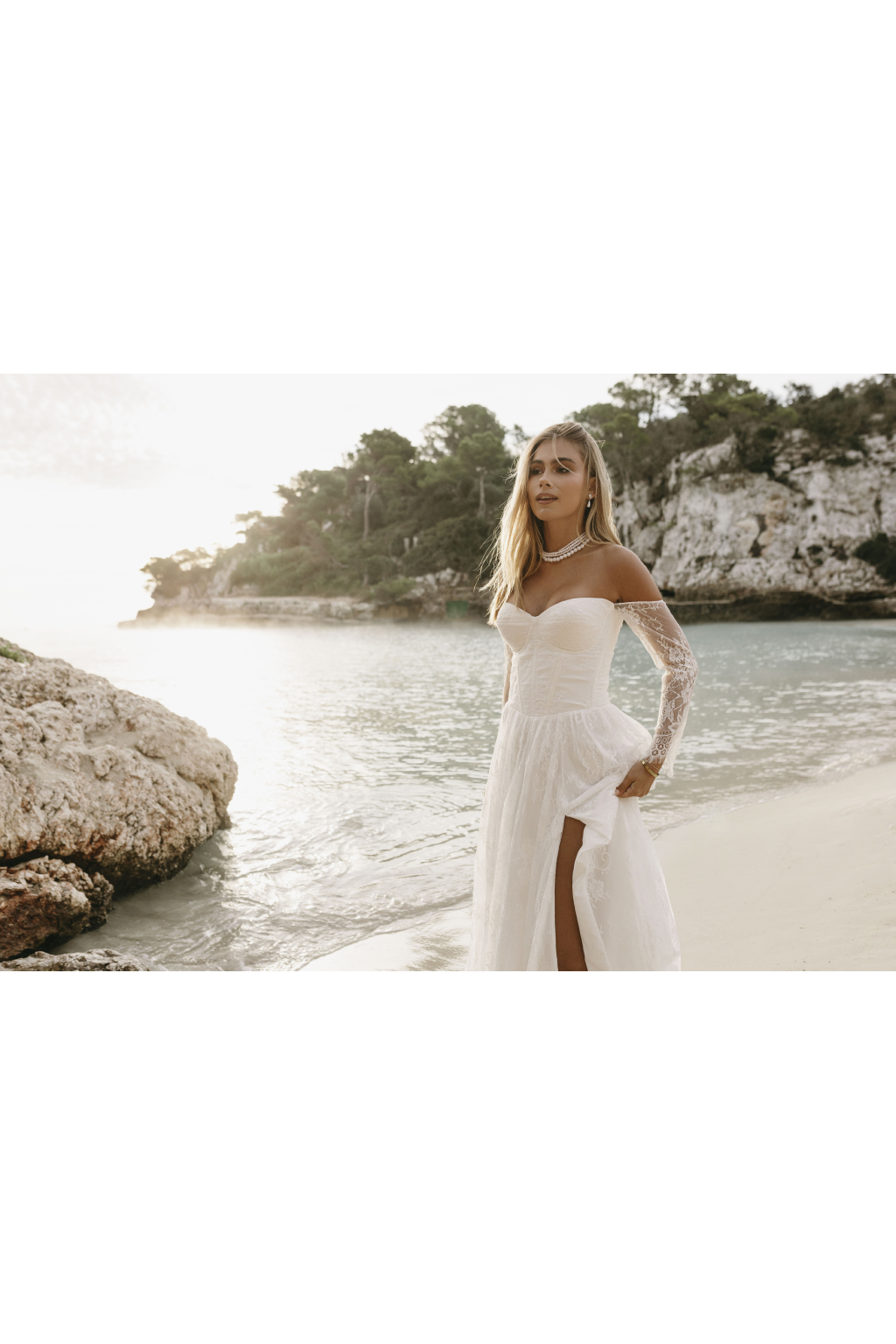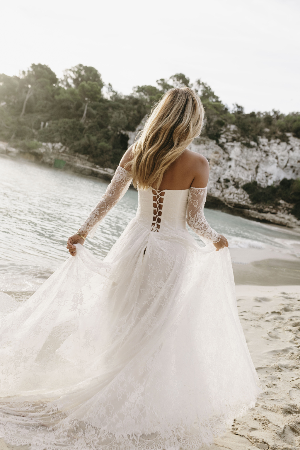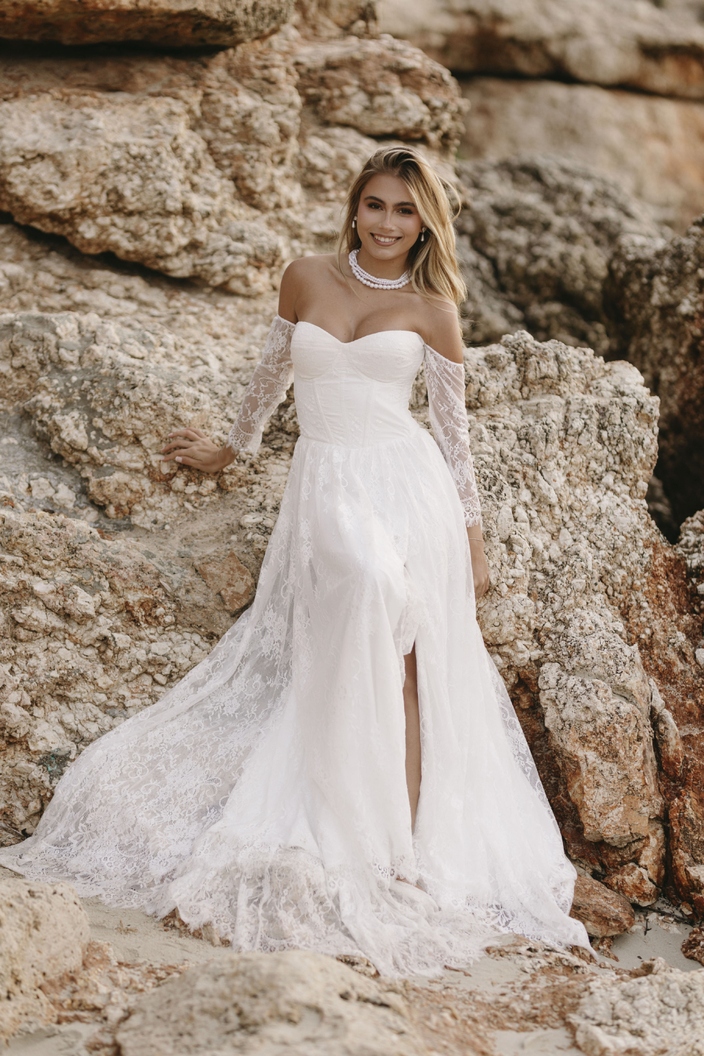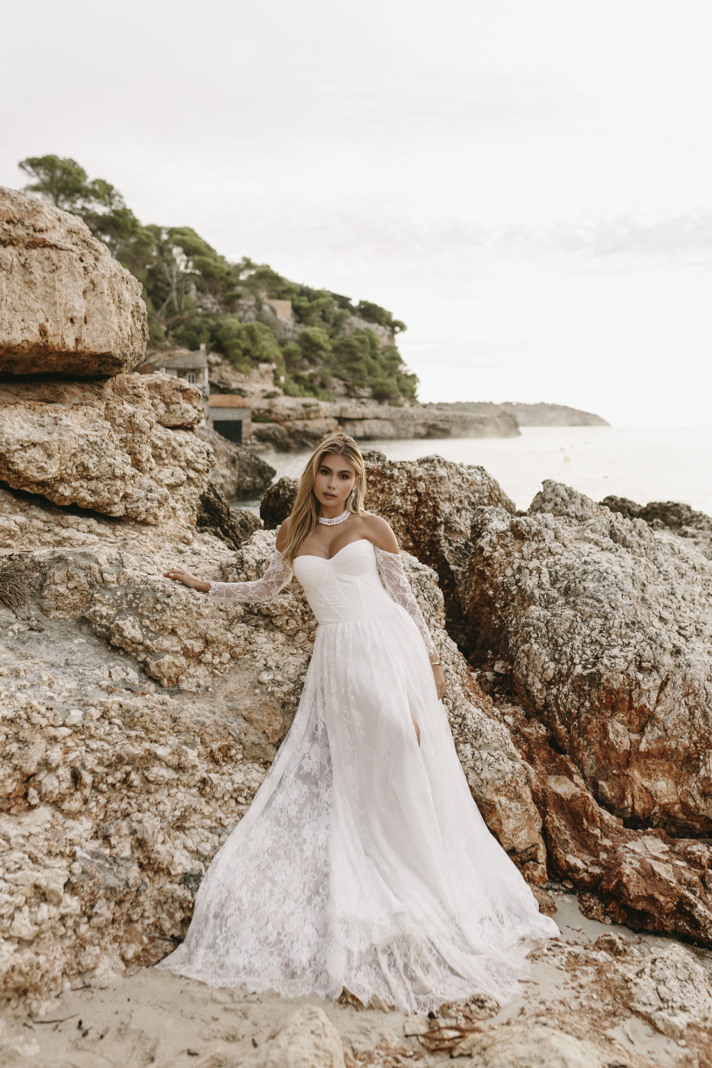 Tyto romantické svatební šaty s elegantním korzetem jsou stvořené pro nevěstu, která hledá jemnost a sofistikovanost. Krajkové rukávy dodávají šatům něžný dotek a přinášejí vyvážený kontrast k hlubokému výstřihu, který působí moderně a zároveň nadčasově. Smyslný rozparek v sukni umožňuje volnost pohybu a dodává šatům nádech odvážné elegance. Kombinace krajky a jemných materiálů vytváří lehkost, která vás bude provázet každým krokem. Každé šaty jsou šité na míru, aby perfektně seděly a zdůraznily vaši jedinečnou krásu na váš nezapomenutelný den.
