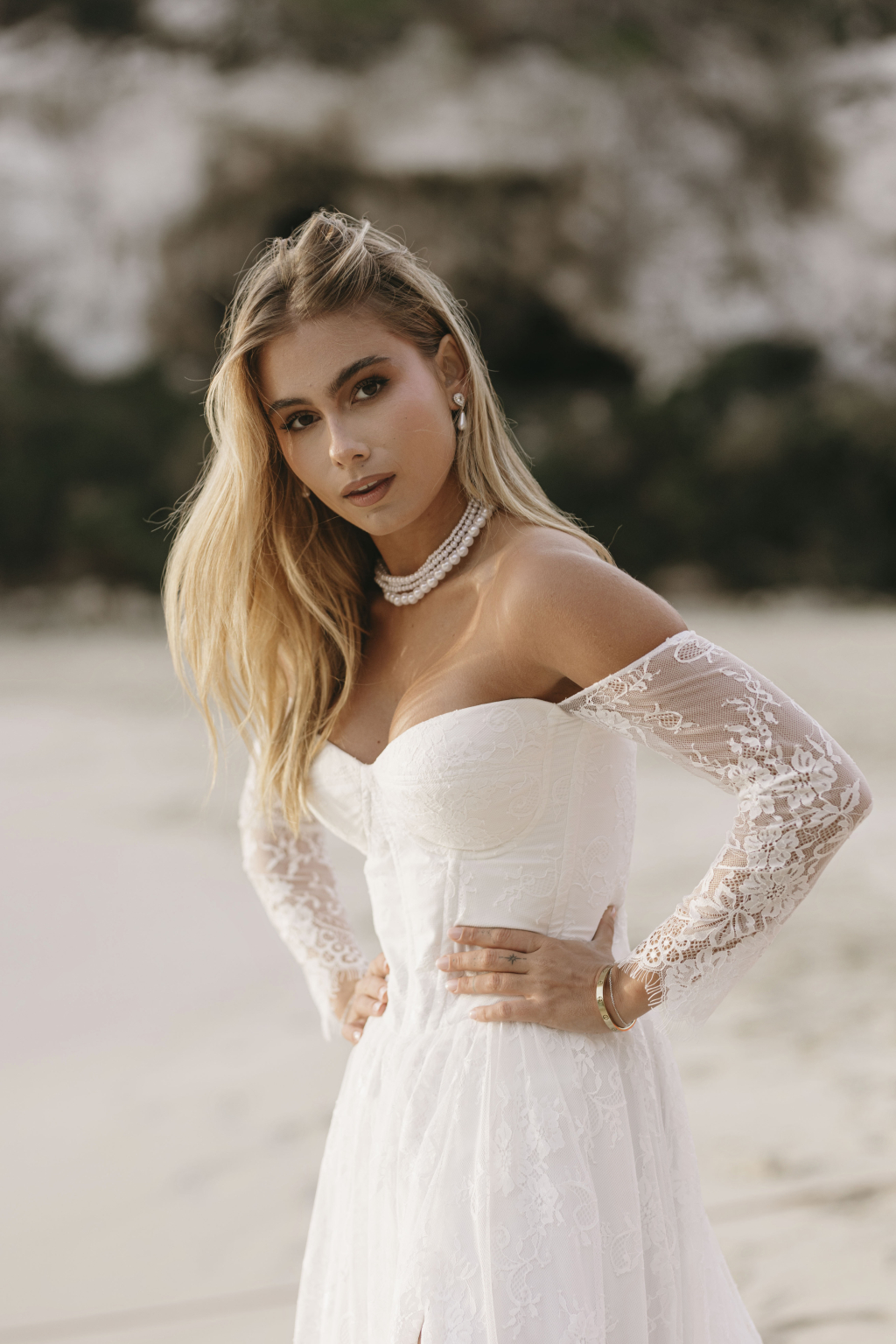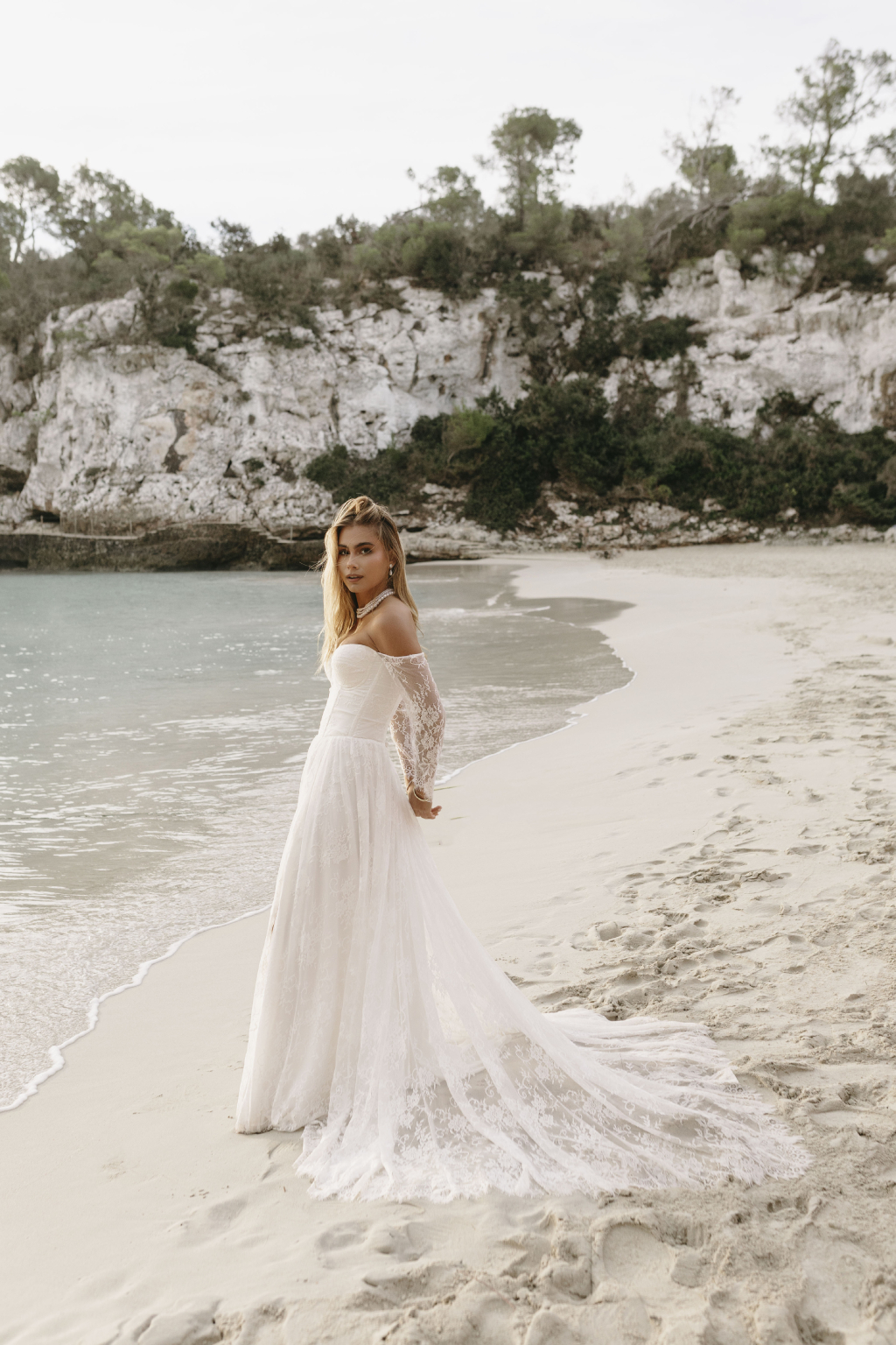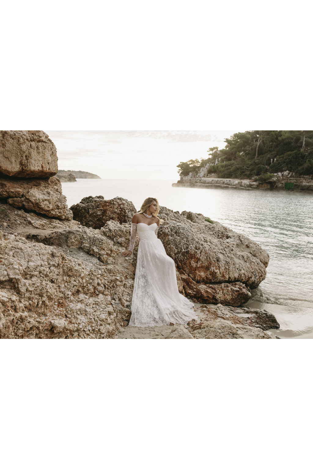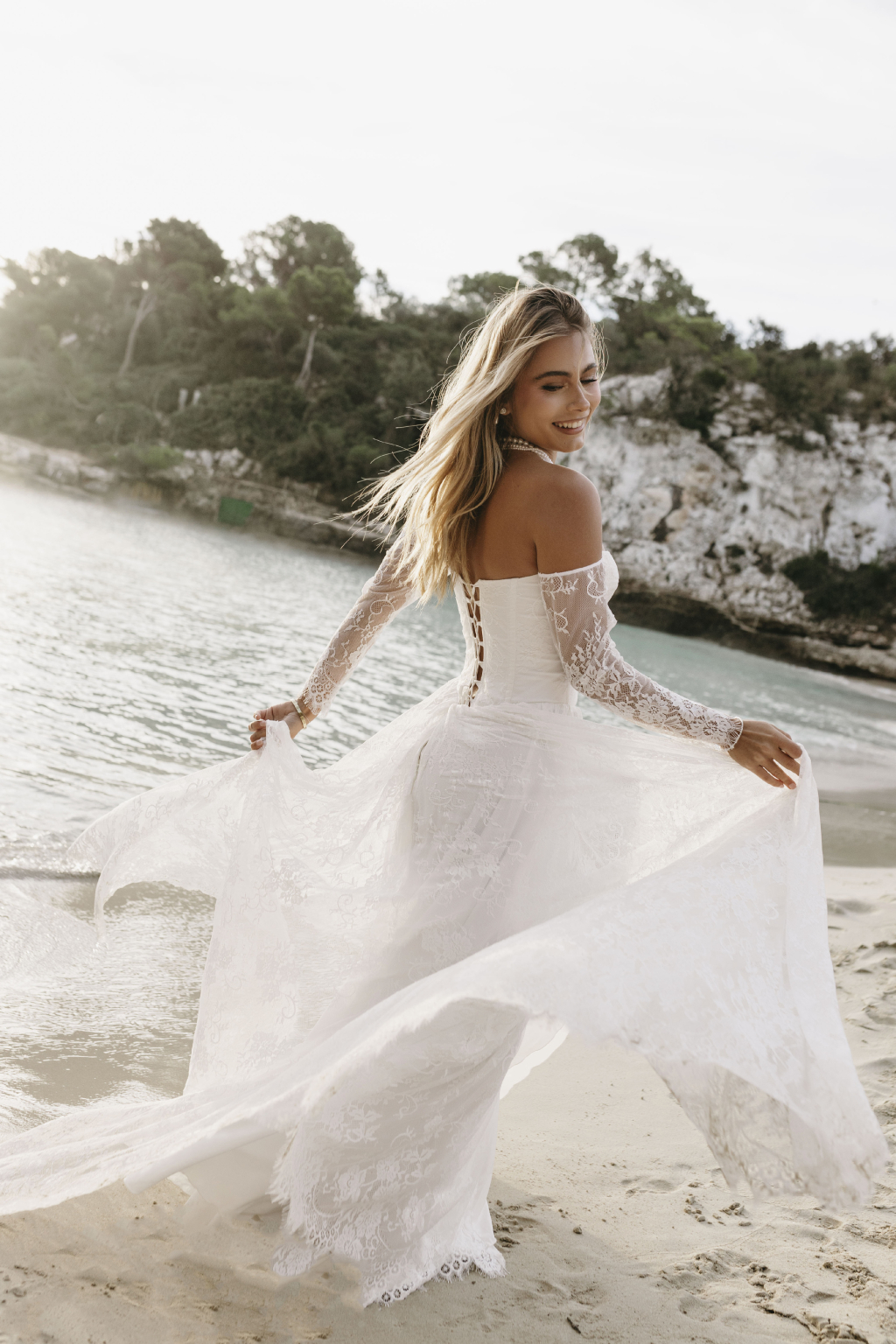Tyto romantické svatební šaty s elegantním korzetem jsou stvořené pro nevěstu, která hledá jemnost a sofistikovanost. Krajkové rukávy dodávají šatům něžný dotek a přinášejí vyvážený kontrast k hlubokému výstřihu, který působí moderně a zároveň nadčasově. Smyslný rozparek v sukni umožňuje volnost pohybu a dodává šatům nádech odvážné elegance. Kombinace krajky a jemných materiálů vytváří lehkost, která vás bude provázet každým krokem. Každé šaty jsou šité na míru, aby perfektně seděly a zdůraznily vaši jedinečnou krásu na váš nezapomenutelný den.