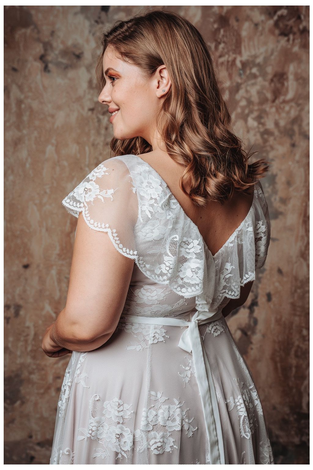 Na první pohled jsou prosté, dají tak vyniknout kráse nevěsty. Otevřený V výstřih sluší převážně nevěstám s plnějším dekoltem. Volný rukávek přechází do romantického volánku, který lemuje zadní výstřih.