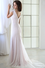 třpytivé krajky zdobené malými flitrami a perličkami - šaty mají přední lodičkový výstřih, zadní menší V výstřih a krátké rukávky