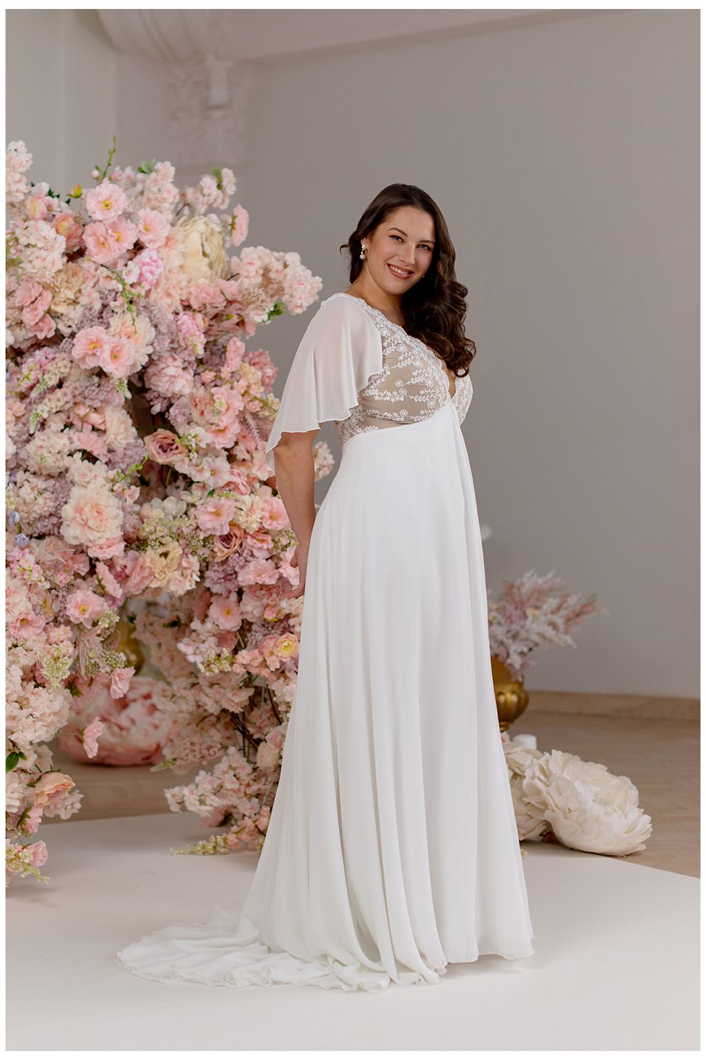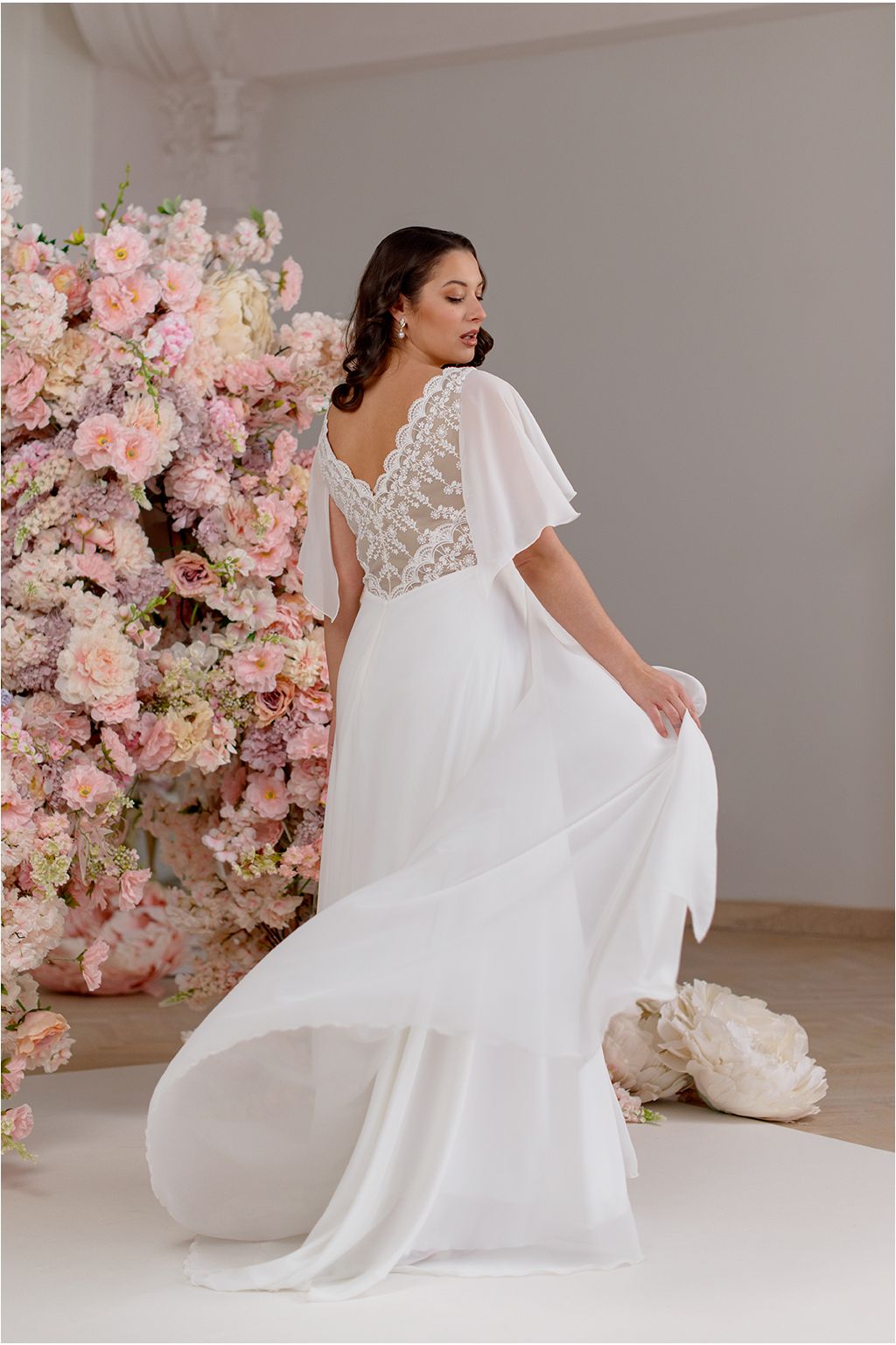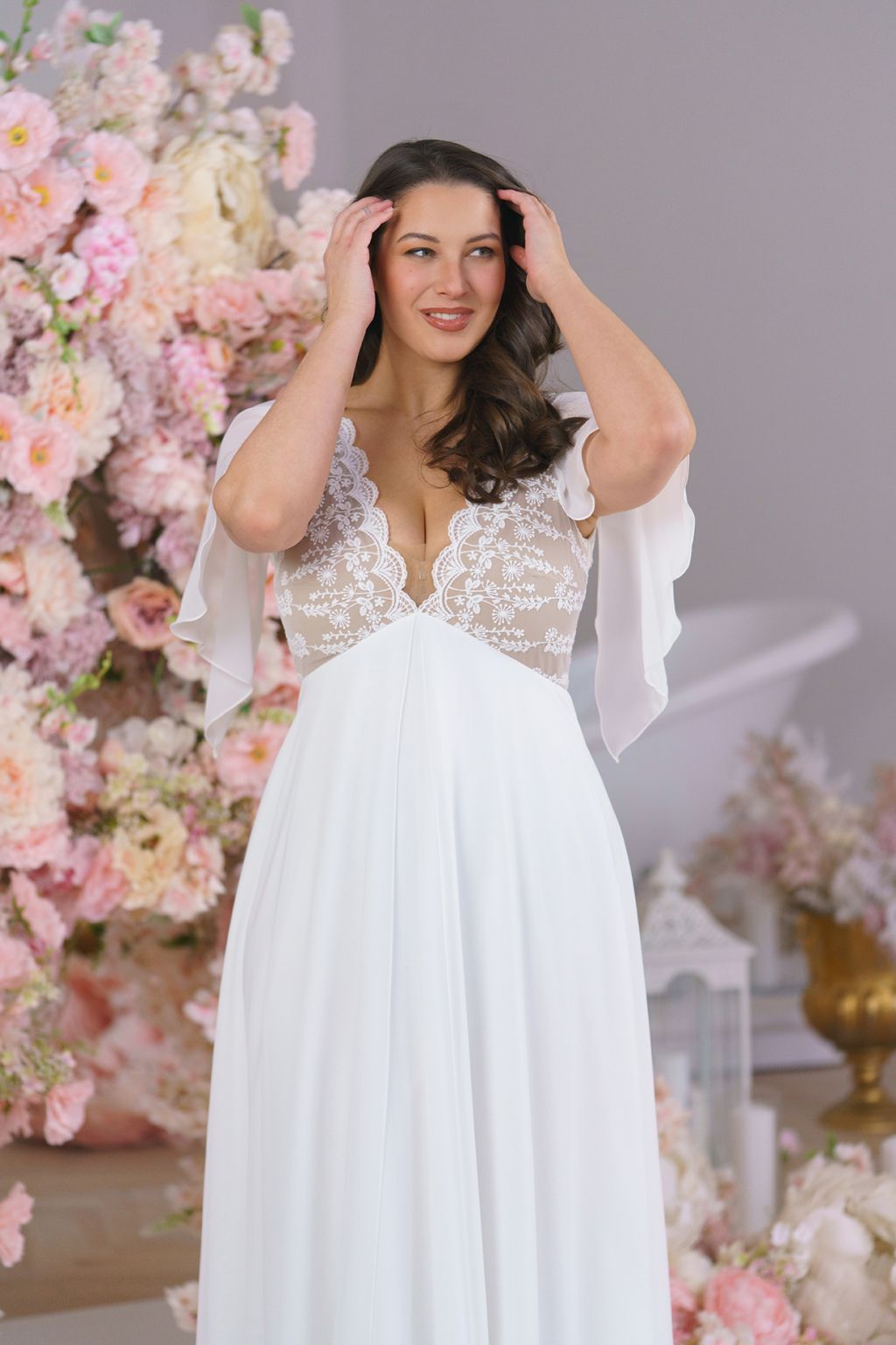 Model Simi vyniká svojí jemností a svobodou pohybu. Lehoučké motýlí rukávy se při každém kroku rozehrávají do éterického tance a dodávají šatům snovou lehkost. Jemná bavlněná krajka na živůtku s hlubokým výstřihem vytváří něžný kontrast k hladké, široce rozevláté sukni, která působí téměř jako závoj z mlhy. Simi jsou šaty pro nevěstu, která si přeje být obklopená lehkostí a cítit se svobodně, sebejistě a přirozeně krásně.