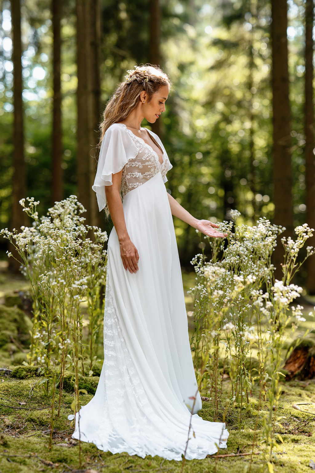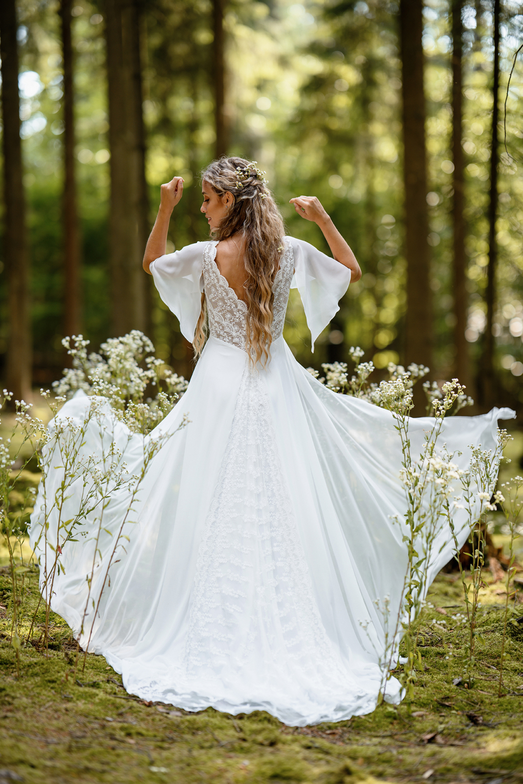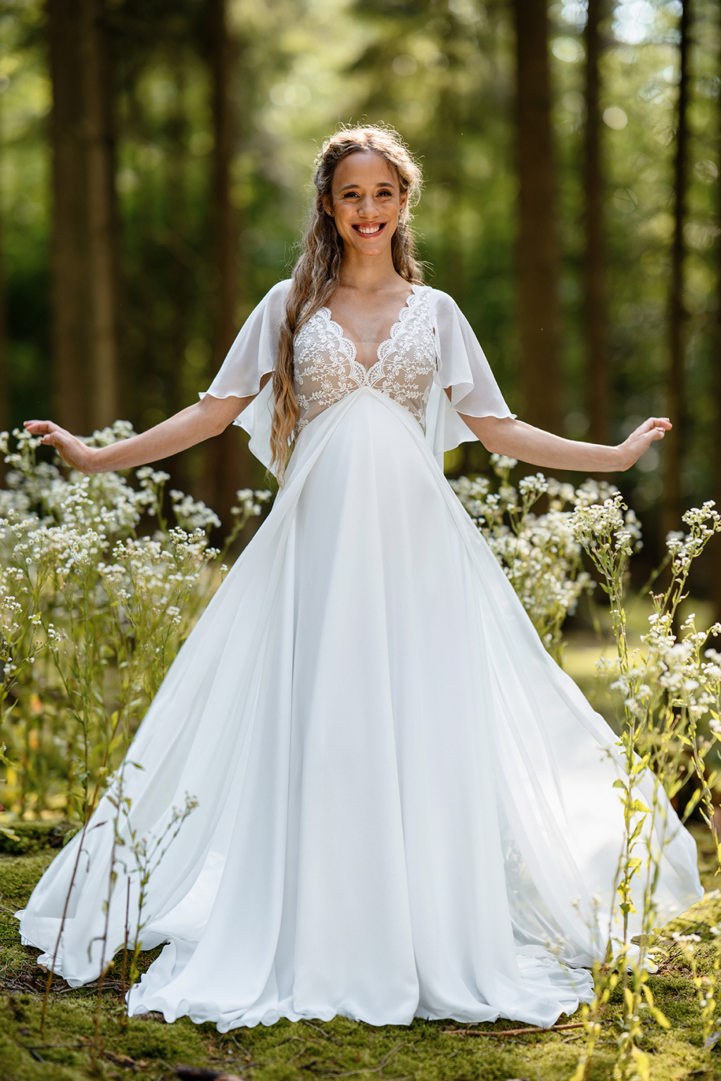 Model Simi vyniká svojí jemností a svobodou pohybu. Lehoučké motýlí rukávy se při každém kroku rozehrávají do éterického tance a dodávají šatům snovou lehkost. Jemná bavlněná krajka na živůtku s hlubokým výstřihem vytváří něžný kontrast k hladké, široce rozevláté sukni, která působí téměř jako závoj z mlhy. Simi jsou šaty pro nevěstu, která si přeje být obklopená lehkostí a cítit se svobodně, sebejistě a přirozeně krásně.