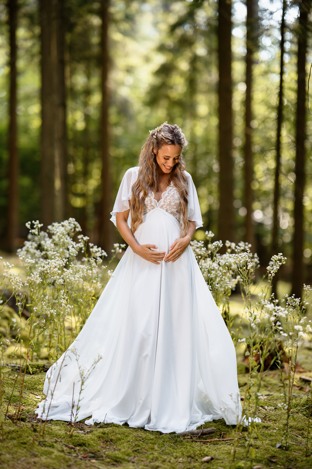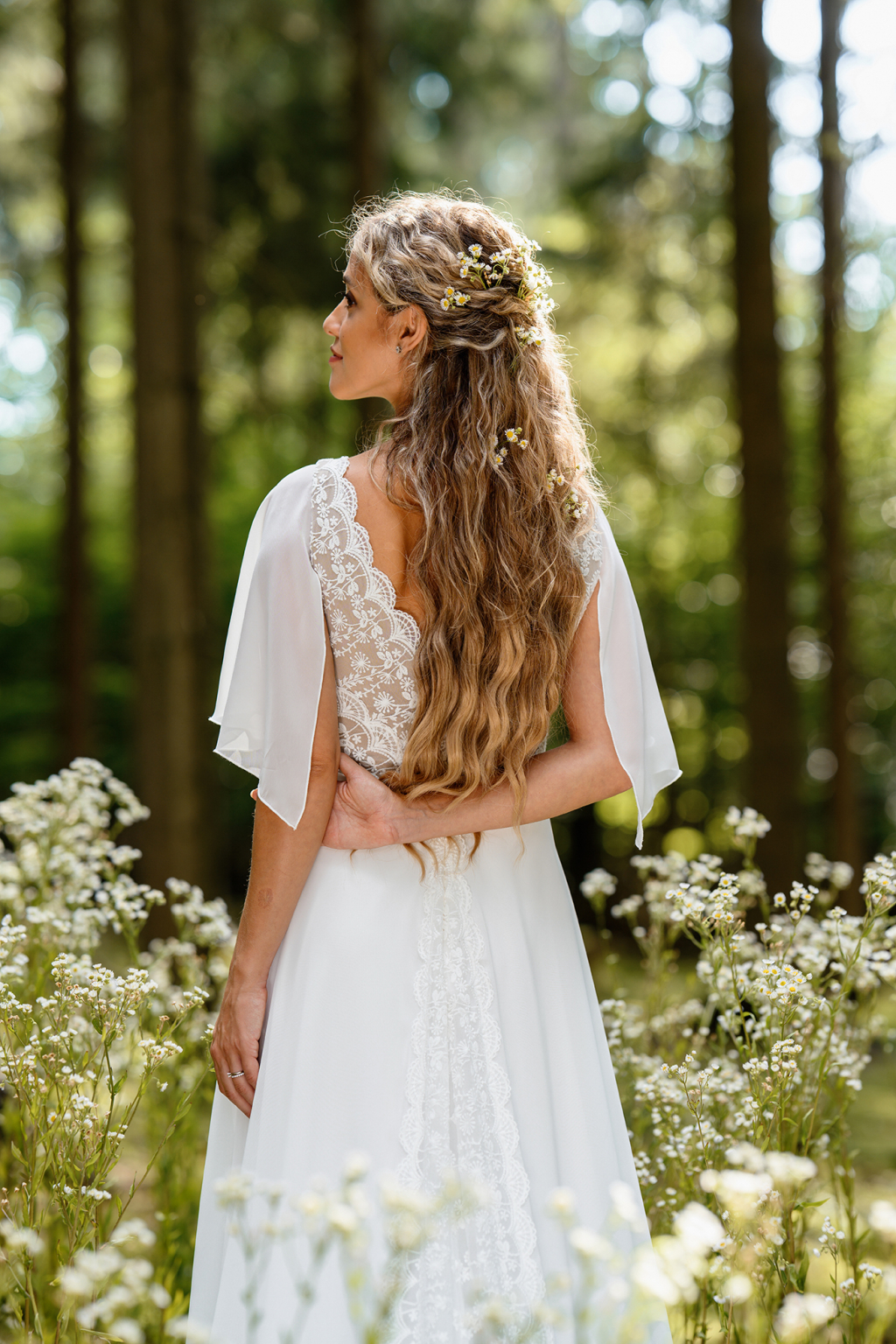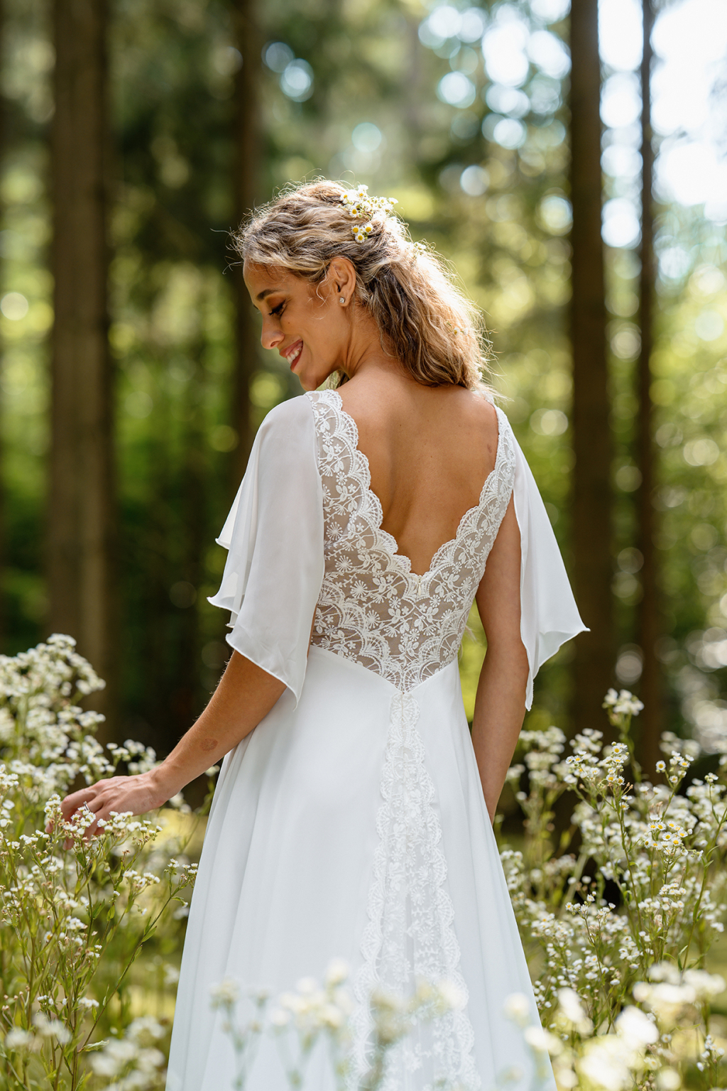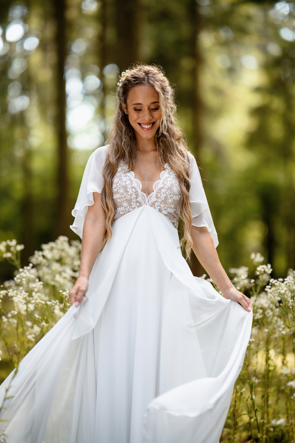Model Simi vyniká svojí jemností a svobodou pohybu. Lehoučké motýlí rukávy se při každém kroku rozehrávají do éterického tance a dodávají šatům snovou lehkost. Jemná bavlněná krajka na živůtku s hlubokým výstřihem vytváří něžný kontrast k hladké, široce rozevláté sukni, která působí téměř jako závoj z mlhy. Simi jsou šaty pro nevěstu, která si přeje být obklopená lehkostí a cítit se svobodně, sebejistě a přirozeně krásně.