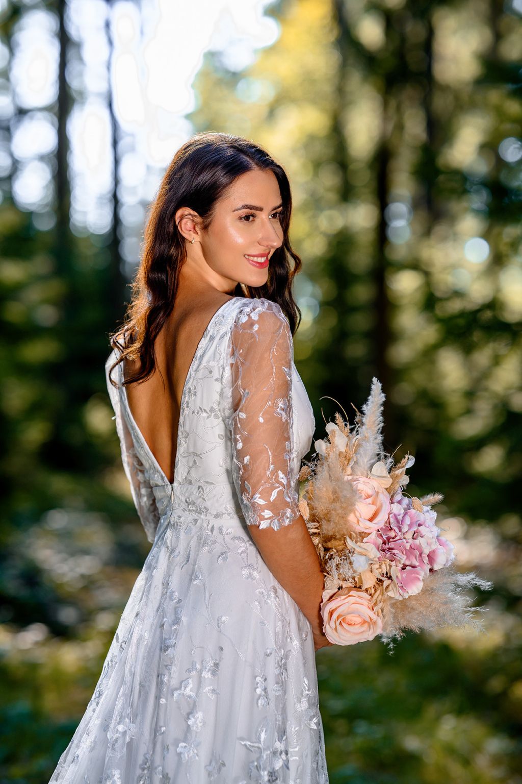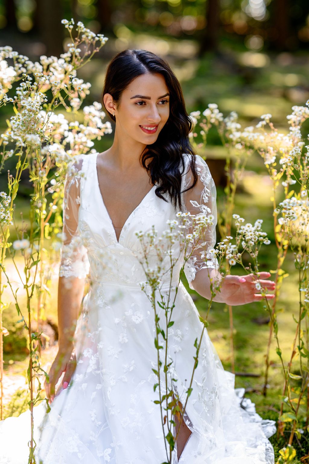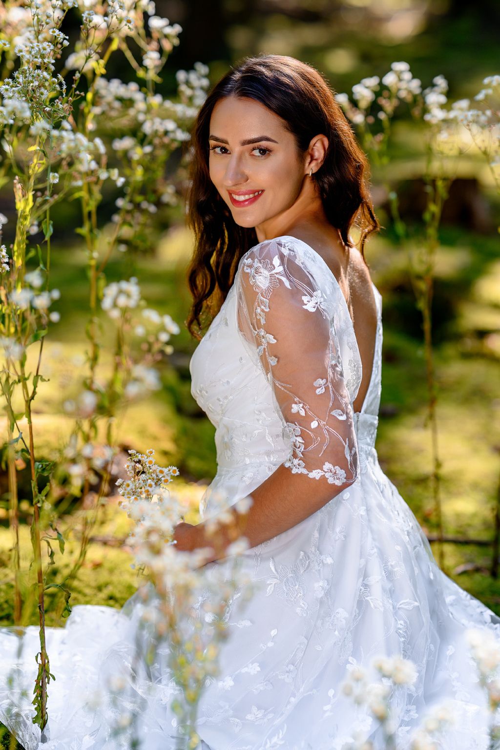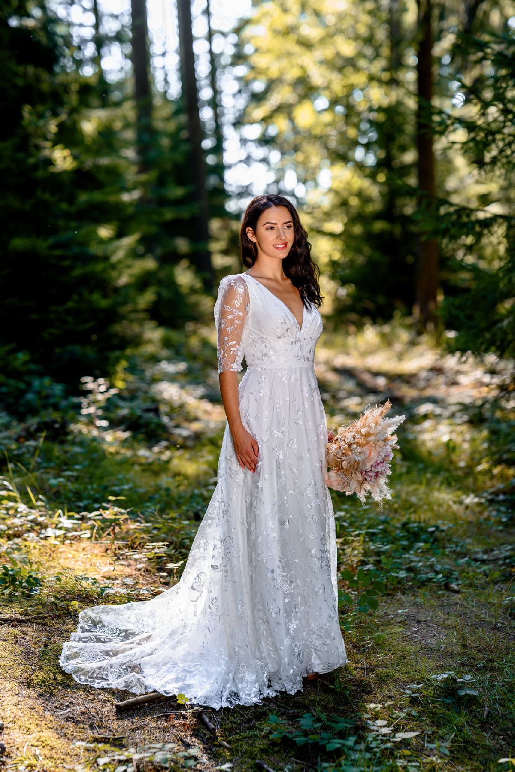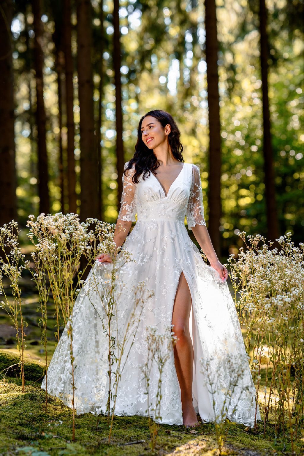 Model Veira jsou šaty, které působí jemně a přirozeně jako proud letního větru v rozkvetlé louce. Výrazná květinová výšivka na jemném tylu dodává šatům romantický a něžný charakter, zatímco lehce projmutý střih s hlubším výstřihem zvýrazňuje ženskou siluetu. Poloprůsvitné rukávy s květinovými detaily přidávají na vzdušnosti a eleganci. Veira jsou šaty pro nevěstu, která touží zazářit autentickou krásou a cítit se volně, sebevědomě a zároveň něžně.