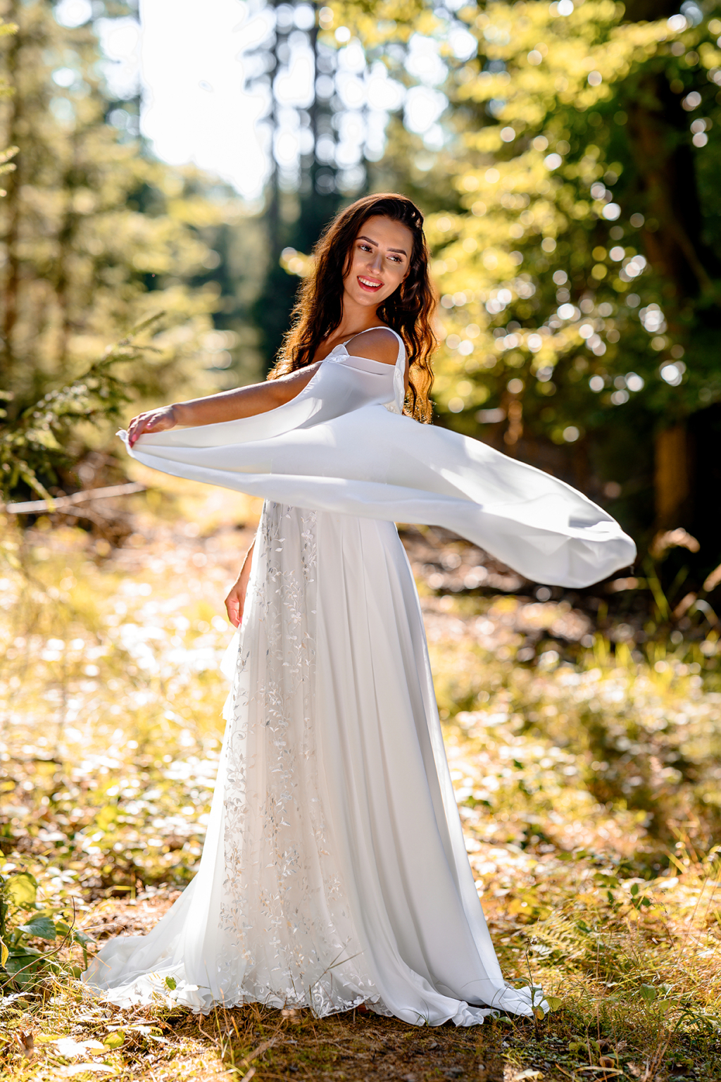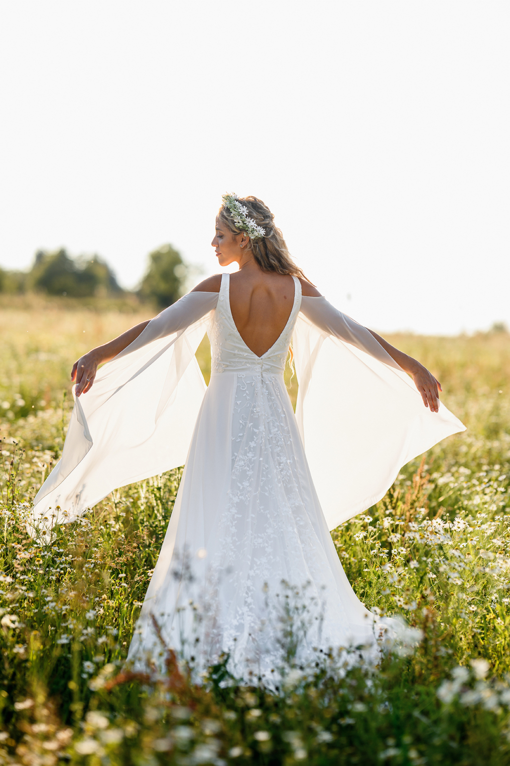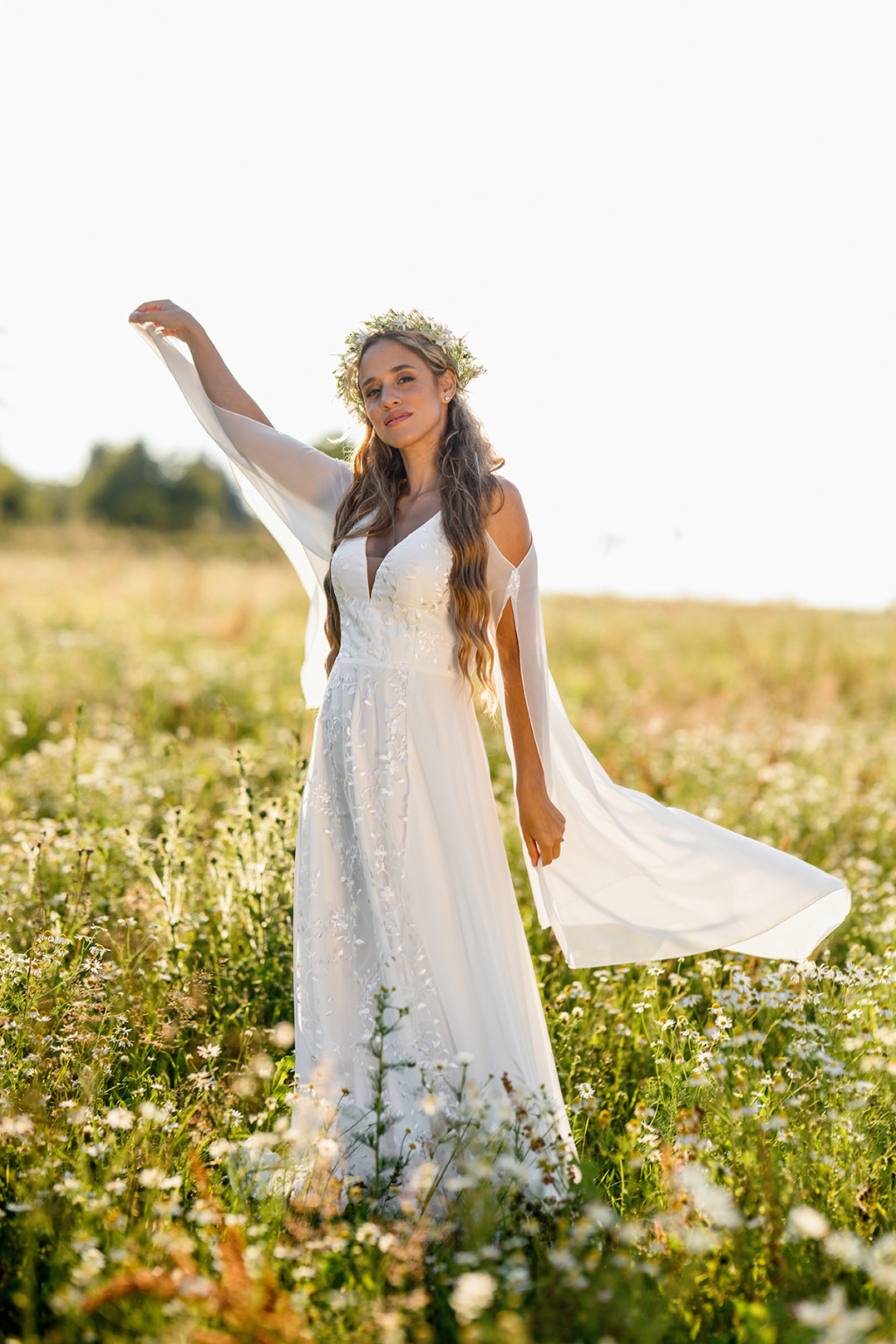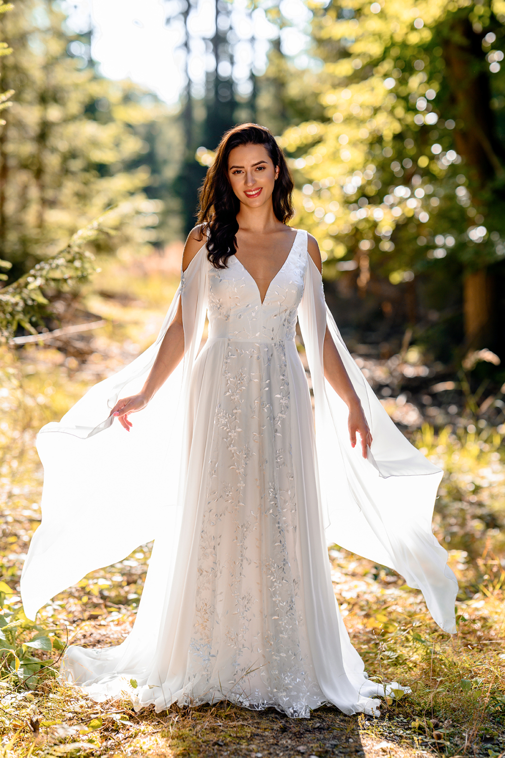 Model Vesna jsou šaty, které působí jako paprsky ranního slunce dopadající na rozkvetlou louku. Výrazný výstřih do V působí elegantně a ženský střih krásně tvaruje postavu. Největší ozdobou Sorayi jsou však dlouhé, rozevláté rukávy, které se při pohybu proměňují v éterické křídla a dodávají šatům slavnostní, téměř pohádkový charakter. Vesna jsou šaty, které v sobě spojují svobodu, jemnost a půvab – ideální volba pro nevěstu, která touží zazářit přirozeným kouzlem a lehkostí.