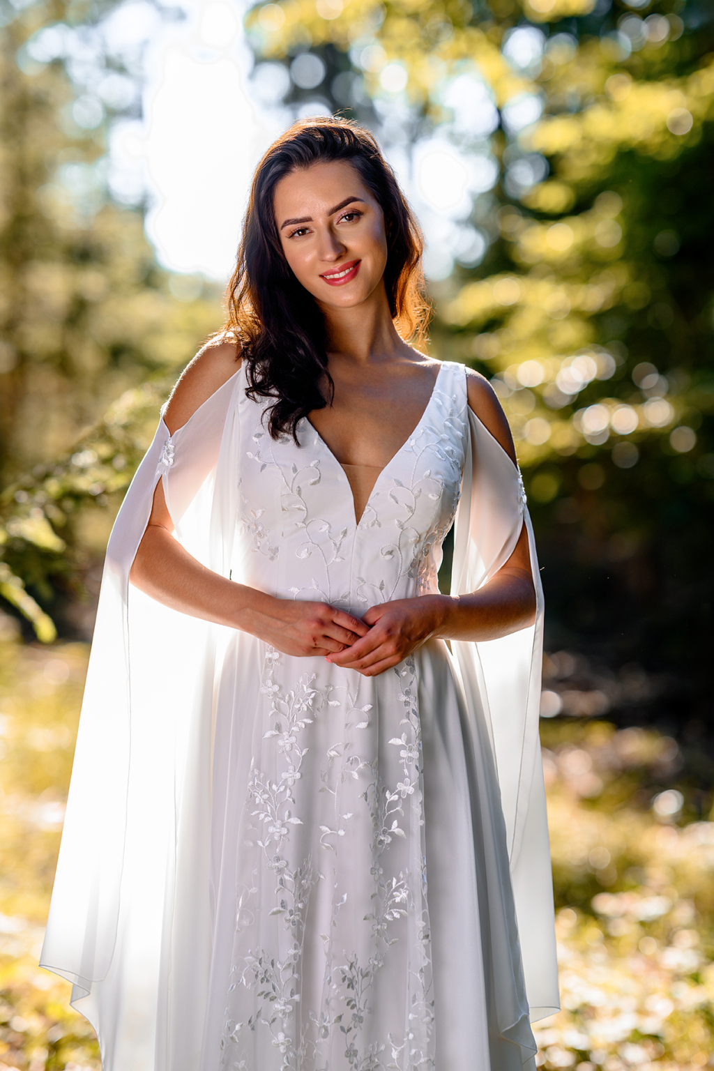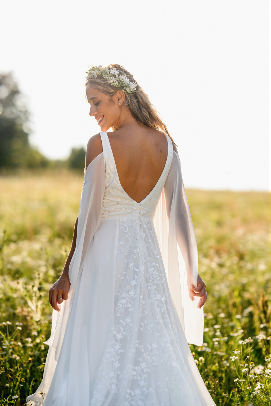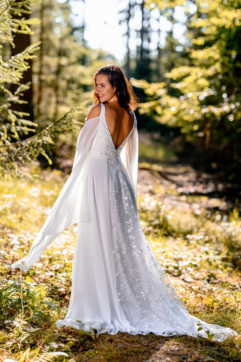 Model Vesna jsou šaty, které působí jako paprsky ranního slunce dopadající na rozkvetlou louku. Výrazný výstřih do V působí elegantně a ženský střih krásně tvaruje postavu. Největší ozdobou Sorayi jsou však dlouhé, rozevláté rukávy, které se při pohybu proměňují v éterické křídla a dodávají šatům slavnostní, téměř pohádkový charakter. Vesna jsou šaty, které v sobě spojují svobodu, jemnost a půvab – ideální volba pro nevěstu, která touží zazářit přirozeným kouzlem a lehkostí.