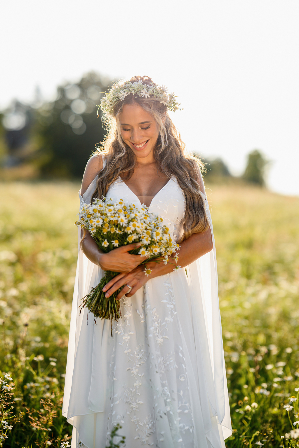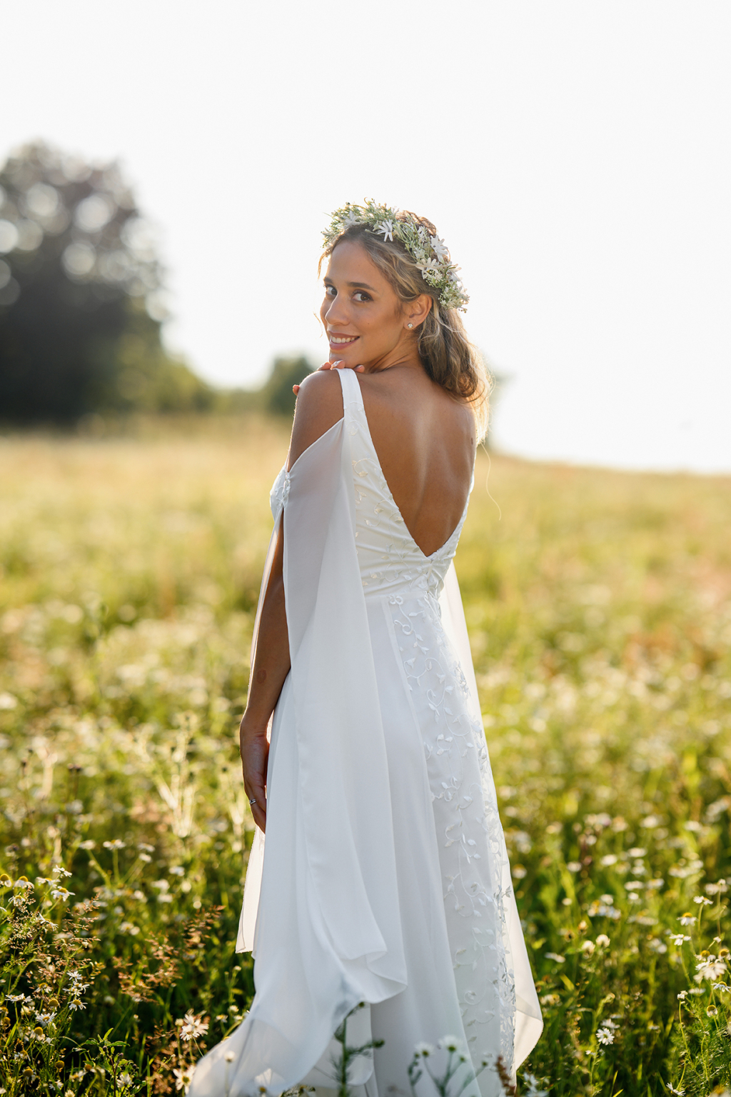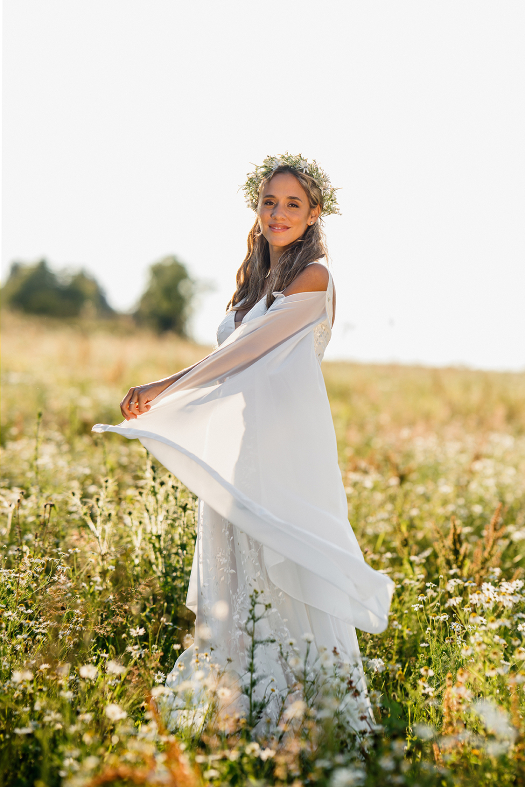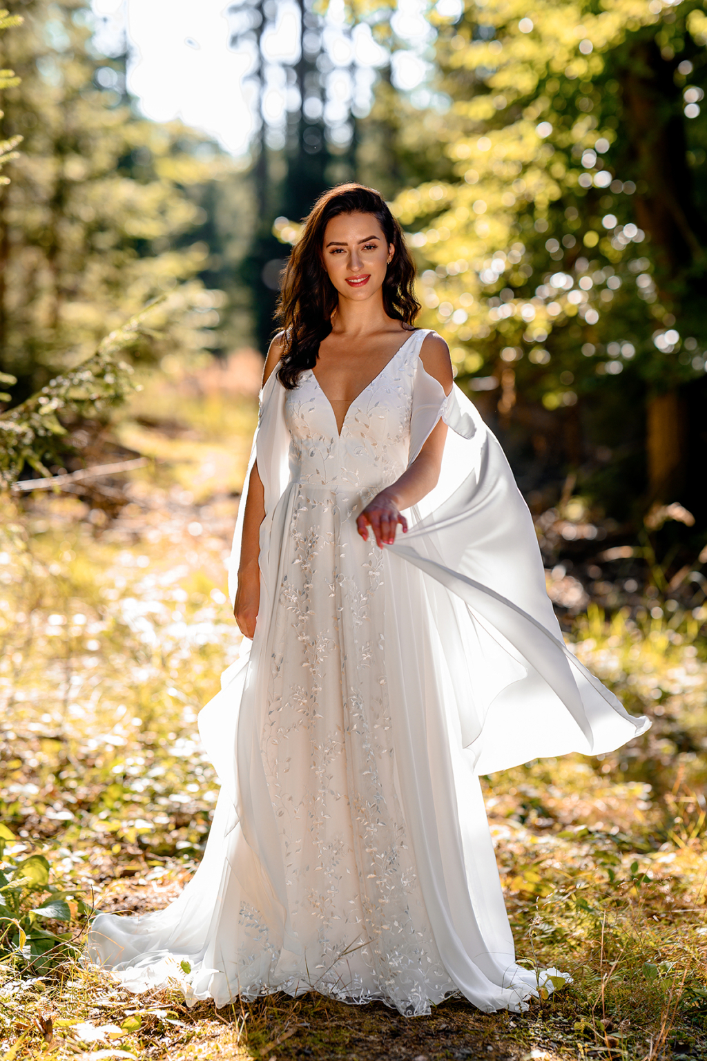 Model Vesna jsou šaty, které působí jako paprsky ranního slunce dopadající na rozkvetlou louku. Výrazný výstřih do V působí elegantně a ženský střih krásně tvaruje postavu. Největší ozdobou Sorayi jsou však dlouhé, rozevláté rukávy, které se při pohybu proměňují v éterické křídla a dodávají šatům slavnostní, téměř pohádkový charakter. Vesna jsou šaty, které v sobě spojují svobodu, jemnost a půvab – ideální volba pro nevěstu, která touží zazářit přirozeným kouzlem a lehkostí.