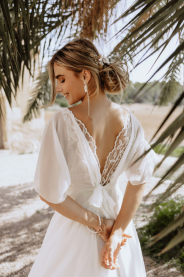 Svatební šaty "Vespera" reprezentují skvost v jednoduchosti a eleganci, ideální pro nevěstu, která touží po sofistikované a zároveň neformální eleganci. Hlavní šaty nabízejí krásně propracované linie, zatímco šifonový "kabátek" jim dodává nádech kouzla a tajemství. Lodičkový výstřih kabátku ladně doplňuje výstřih hlavních šatů, což vytváří nádhernou harmonii a podtrhuje ženskost. Zadní část šatů skrývá nádhernou krajkovou část, která je lehce skrytá pod šifonovým kabátkem, což přidává šatům vznešený a romantický touch. Vázaní šatů v pase na širší stuhu není jen praktickým detailem, ale také zvýrazňuje pas a dodává šatům jemný ženský vzhled s roztomilou mašličkou na zádech. Aby byla vaše svatební den dokonalý a vy jste se cítila naprosto skvěle, šaty Vespera vám ušijeme přesně na míru.