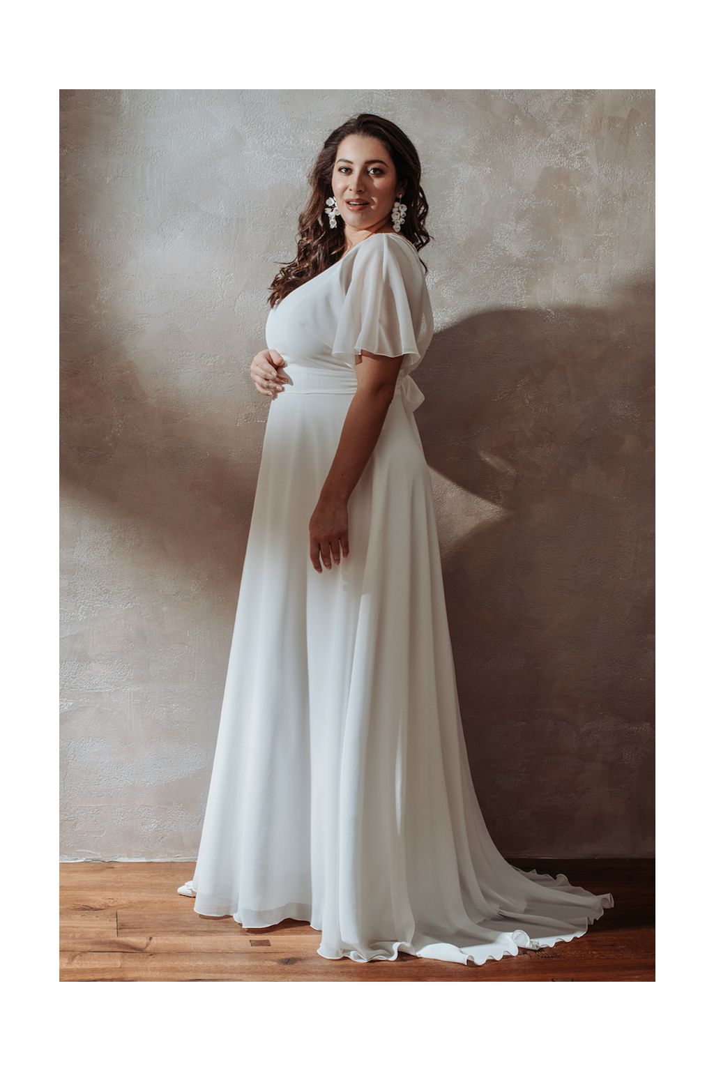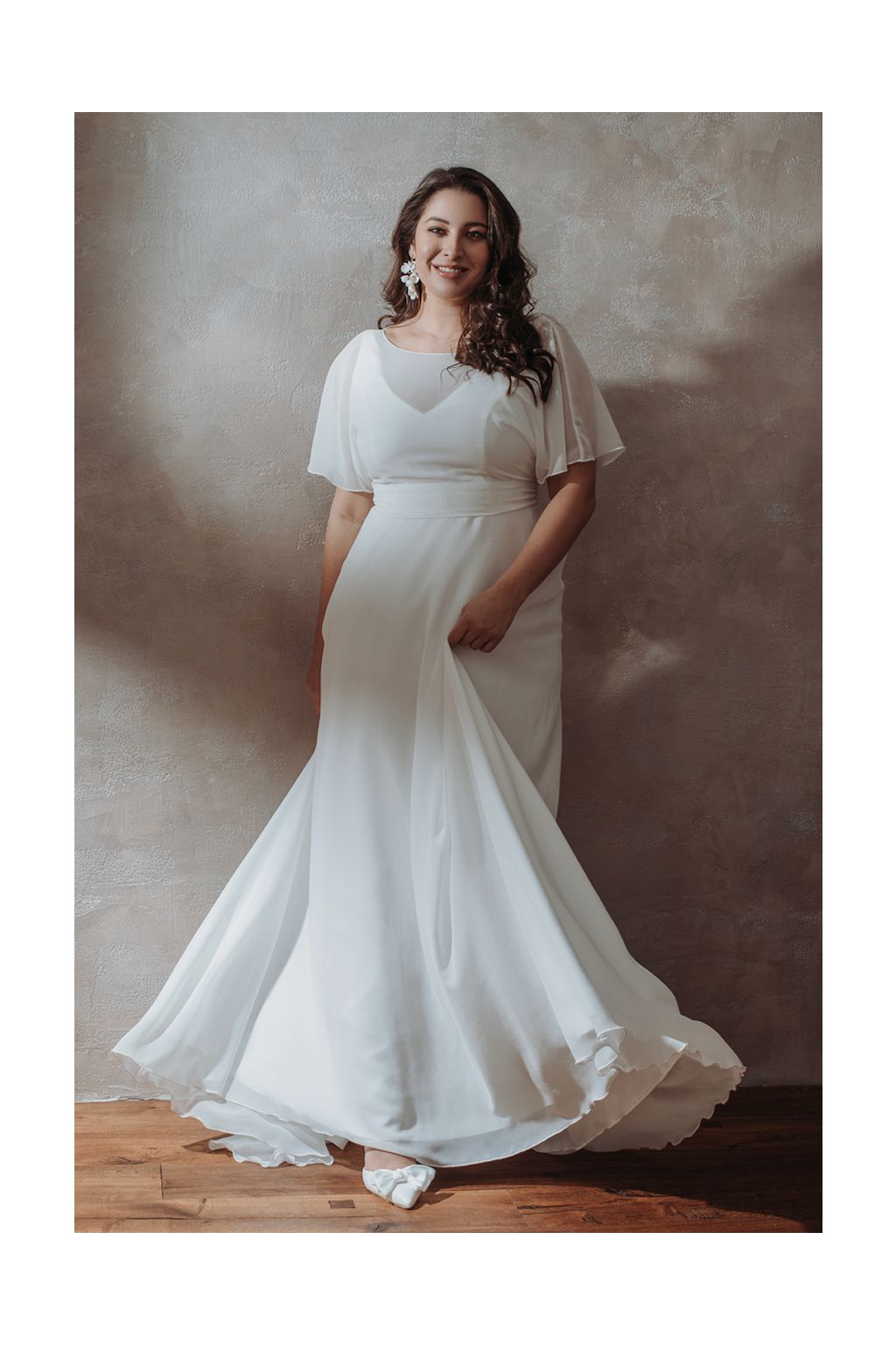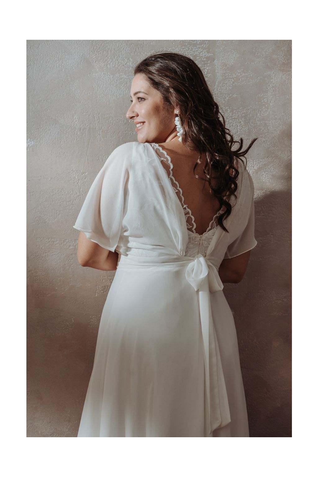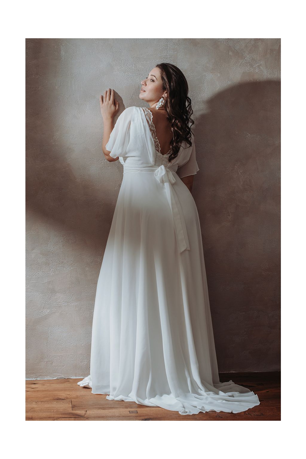 Svatební šaty "Vespera" reprezentují skvost v jednoduchosti a eleganci, ideální pro nevěstu, která touží po sofistikované a zároveň neformální eleganci. Hlavní šaty nabízejí krásně propracované linie, zatímco šifonový "kabátek" jim dodává nádech kouzla a tajemství. Lodičkový výstřih kabátku ladně doplňuje výstřih hlavních šatů, což vytváří nádhernou harmonii a podtrhuje ženskost. Zadní část šatů skrývá nádhernou krajkovou část, která je lehce skrytá pod šifonovým kabátkem, což přidává šatům vznešený a romantický touch. Vázaní šatů v pase na širší stuhu není jen praktickým detailem, ale také zvýrazňuje pas a dodává šatům jemný ženský vzhled s roztomilou mašličkou na zádech. Aby byla vaše svatební den dokonalý a vy jste se cítila naprosto skvěle, šaty Vespera vám ušijeme přesně na míru.