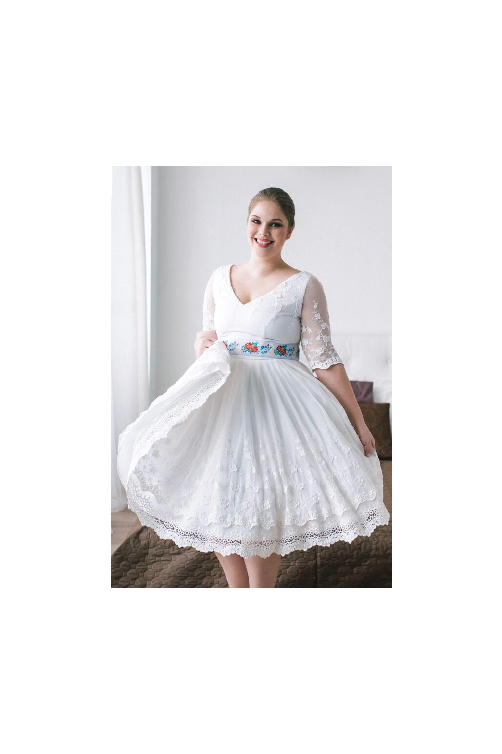 Tyto romantické svatební šaty jsou ušité z překrásné bavlněné krajky s výrazným květinovým vzorem. Šaty šijeme na zakázku, a proto si můžete zvolit i jiný výstřih, případně přizpůsobit délku rukávů. Hlubší véčkový výstřih bude slušet dámám větších velikostí. Spodní sukně je kolová a je ušitá z matného svatebního saténu. Vrchní krajková sukně je skládaná, aby lépe vynikl vzor krajky a bordura. Pas je zvýrazněný originální folklórní stuhou s mašlí. Stuhu do pasu je možné ušít v jakékoliv barvě. Stuha není součástí šatů. Šaty vám ušijeme na zakázku, abyste ve svůj velký den byla dokonalá. Šaty jsou focené se spodničkou, která není součástí šatů, k dokoupení ji najdete v kategorii Originální výběr - spodničky.
