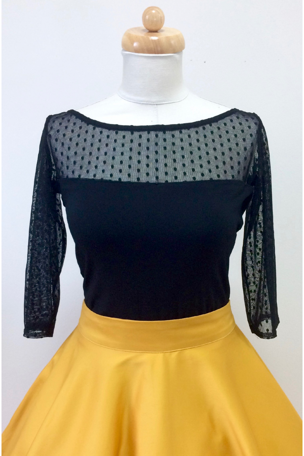 Černé triko je základem každého šatníku a pokud si zvolíte tento model s puntíkatým sedlem a 3/4 rukávy, můžete klidně vyrazit i na méně prestížní společenskou událost. Triko se skvěle hodí k TUTU sukni, nebo ke společenským kalhotám. Triko je ušité z velice kvalitního bambusového úpletu s příměsí elastanu. Bambus je přírodně antiseptický a má výborné savé vlastnosti. Oděvy vyrobené z bambusu jsou jedny z nejhebčích vůbec. Vlákna se vyrábějí z bambusové masy podobným způsobem jako se vyrábí viskóza, má však ještě znásobené užitné vlastnosti. Bambus je anibakteriální, antialergický a antistatický. Vyznačuje se okamžitou savostí a odvodem vlhkosti, je mimořádně prodyšný, má výborné termo-vlastnosti a díky odolnosti proti otěru má dlouhou životnost.