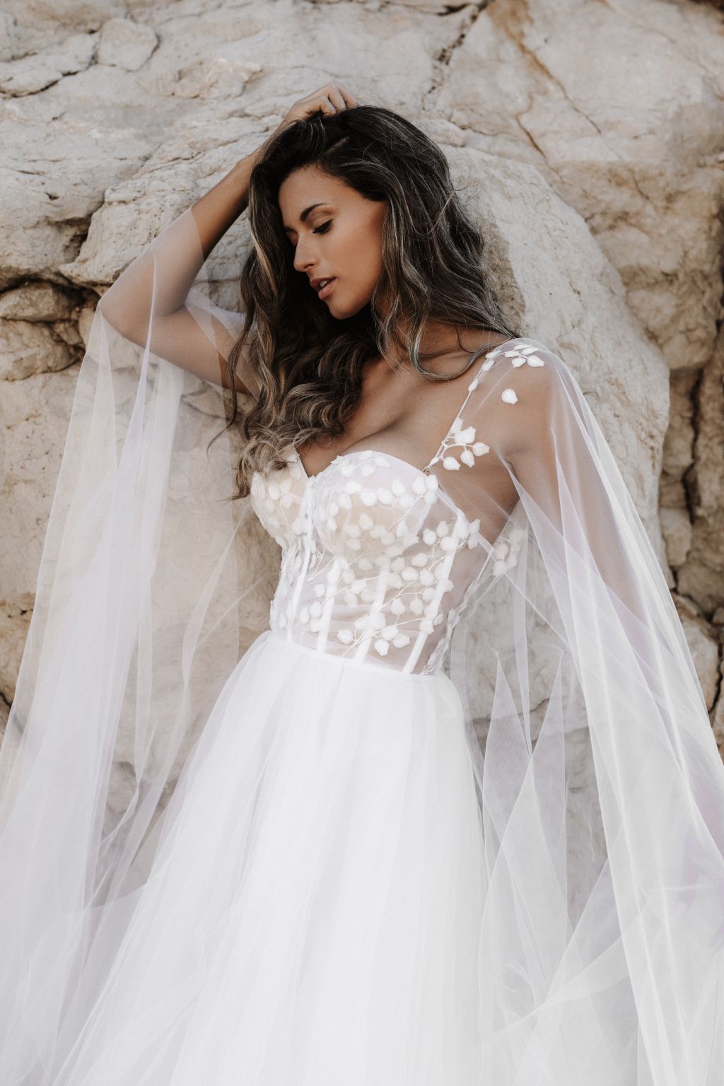Šaty jsou ušité z lehce průhledného bílého lehounkého tylu zdobeného jemnou lístečkovou krajkou. Korzetový živůtek s přiznanými kosticemi a svůdným šněrováním na zádech doplňuje nadýchaná tylová sukně s hlubokým rozparkem. Model je variabilní – můžete si ho doplnit odepínacími dlouhými závojovými rukávy s krajkou a zcela jimi zakrýt ramena nebo je nosit ležérně volně spadlé.