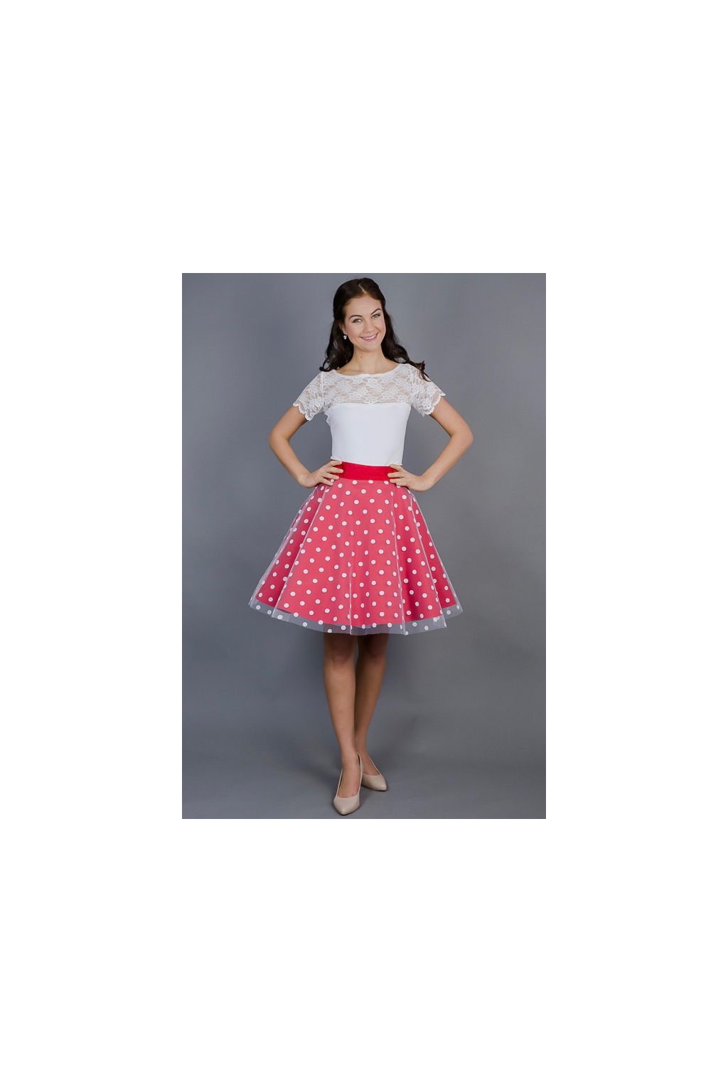 Hravá letní sukénka v červené barvě doplněná puntíkatým tylem bude vhodná na letní párty, pro nevěsty na převlečení, nebo pro družičky. V této sukni budete zaručeně nepřehlédnutelná. Doplnit ji můžete bambusovým trikem. Sukni lze zakoupit v konfekčních velikostech 36 - 42, nebo je možné zadat vlastní rozměry a sukni ušít na zakázku. Sukně je nafocena se spodničkou, která není součástí, k dokoupení ji najdete v kategorii Originální výběr - spodničky.