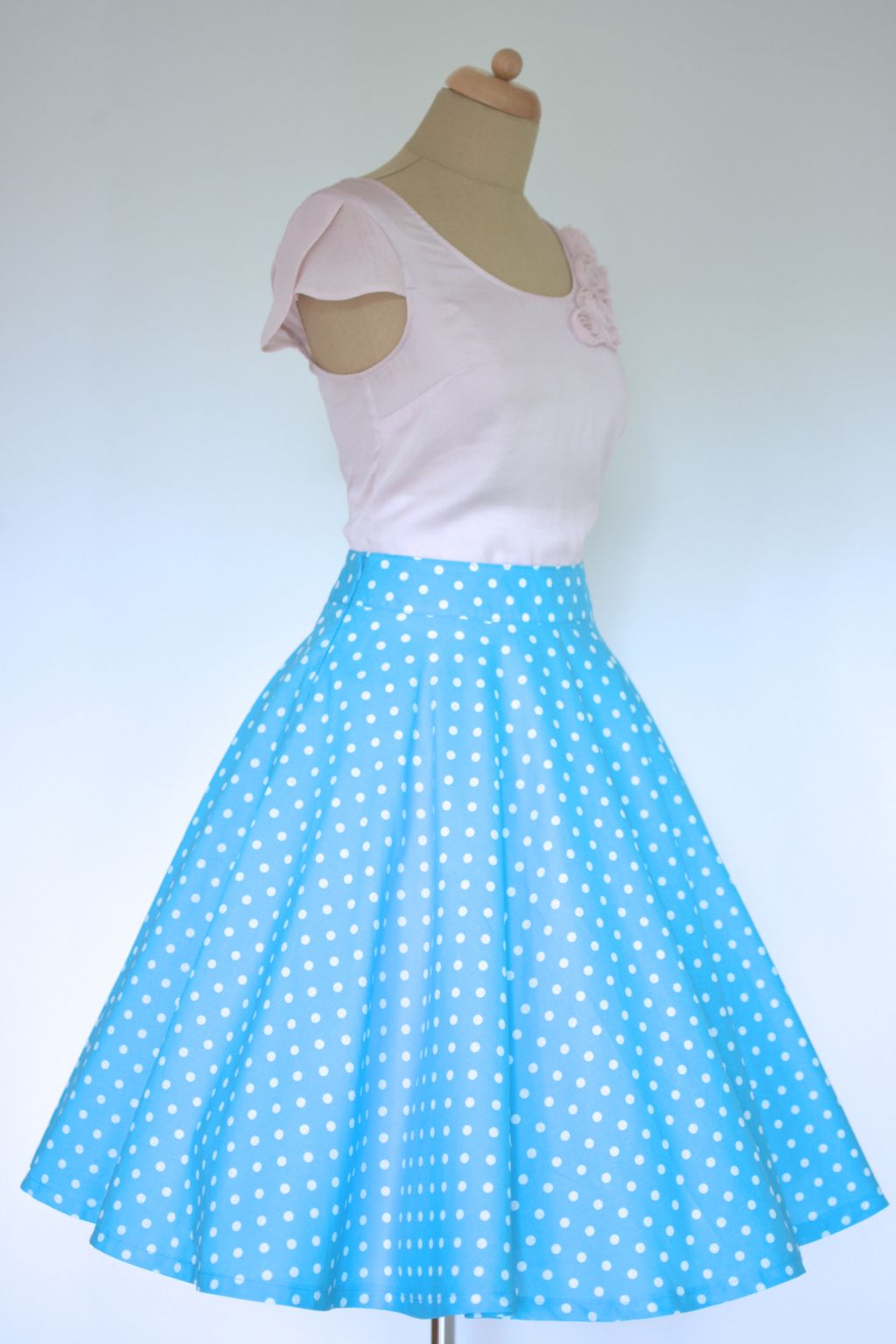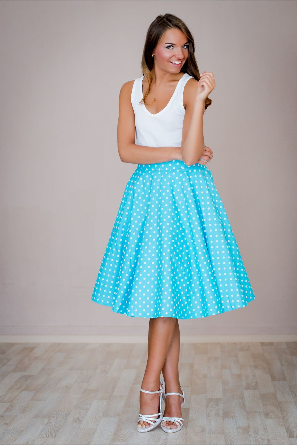 Hravá letní sukénka v tyrkysové barvě s puntíkem vhodná jak do školy, tak i na párty. V této sukni budete zaručeně nepřehlédnutelná. Doplnit ji můžete hedvábným, nebo kašmírovým svetříkem, který nabízíme v různých barvách. Sukni lze zakoupit v konfekčních velikostech 36 - 42, nebo je možné zadat vlastní rozměry a sukni ušít na zakázku. Sukně je nafocena se spodničkou, která není součástí, k dokoupení ji najdete v kategorii Originální výběr - spodničky.