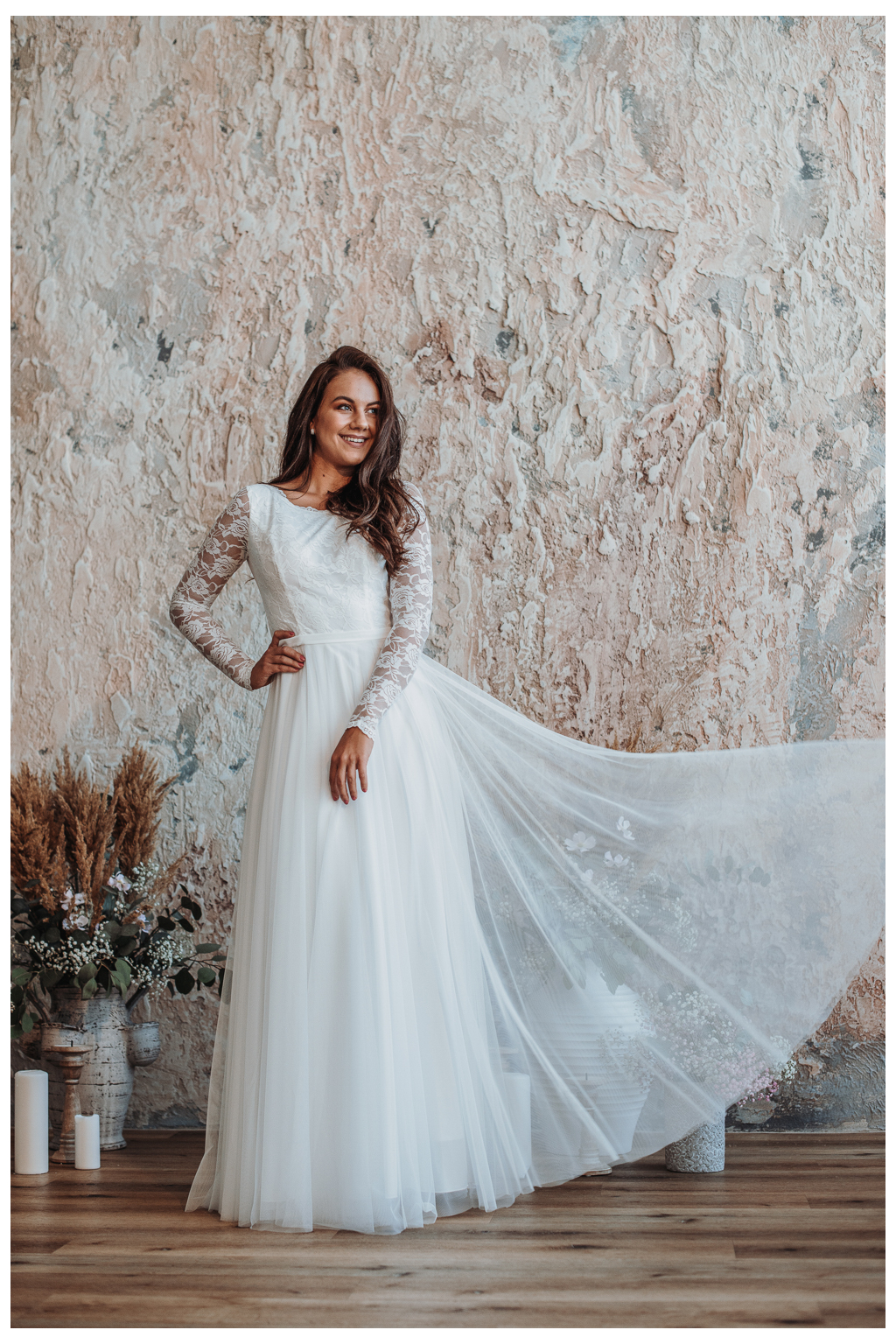 Dlouhé krajkové rukávy jsou elastické a měkké, střih nabízí dostatek volnosti. Díky tomu si svůj nezapomenutelný den vychutnáte v maximálním pohodlí.