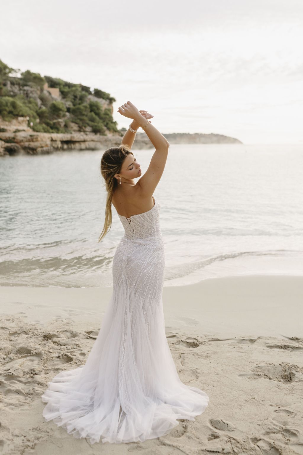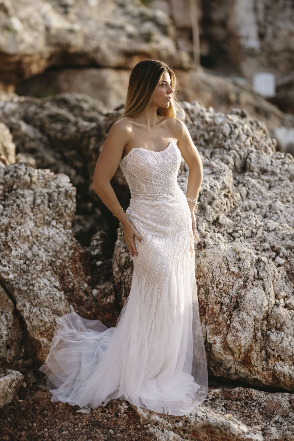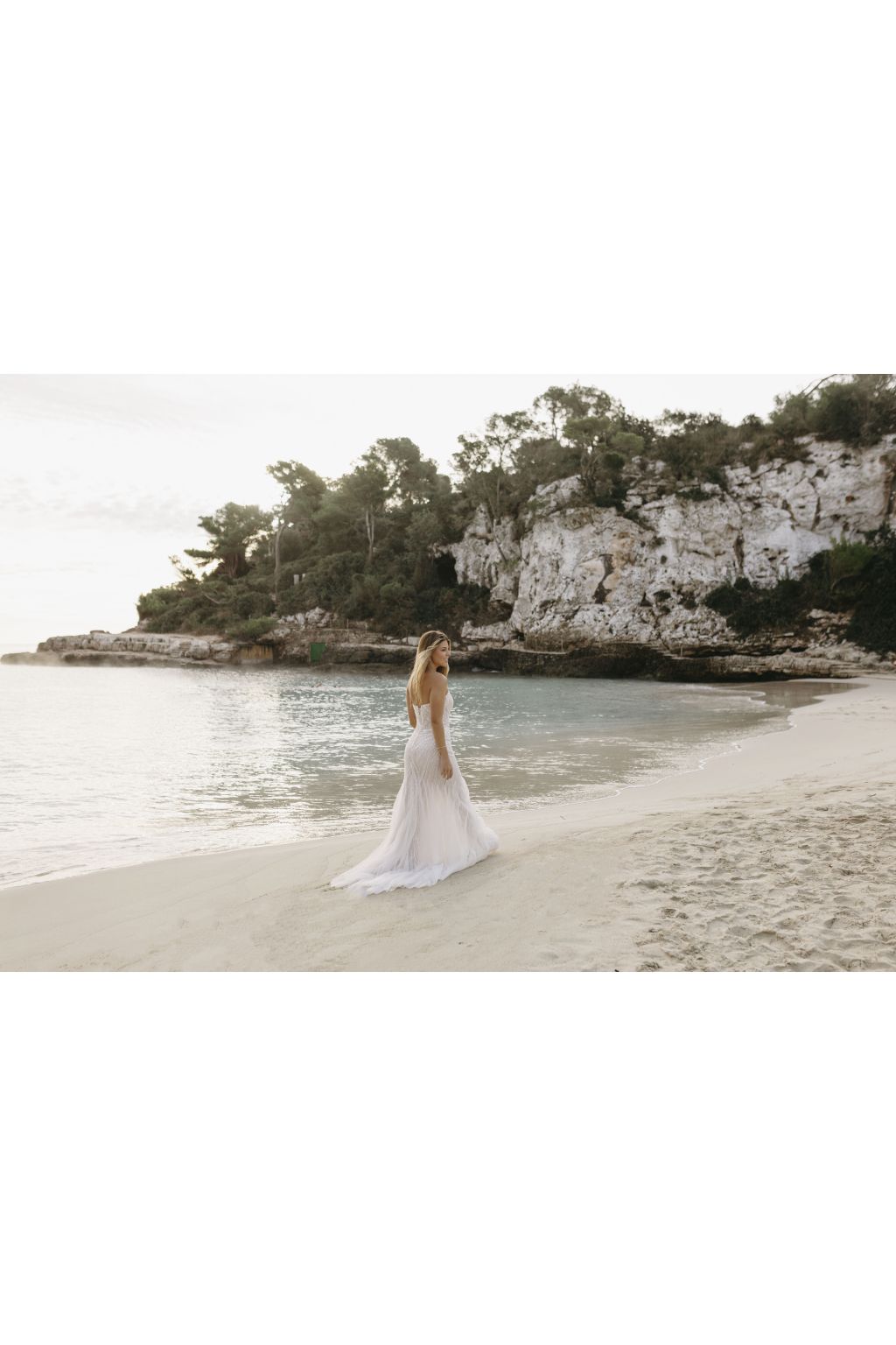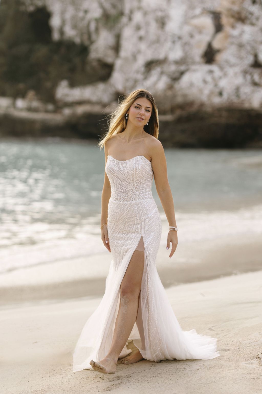 Tyto úchvatné korzetové šaty, plné jemných flitrovaných aplikací, jsou ztělesněním moderní elegance a glamouru. Díky pečlivě propracovanému střihu nádherně zdůrazňují postavu a zároveň poskytují pohodlí. Hluboký rozparek v sukni přidává na odvážnosti a přirozené smyslnosti, zatímco třpytivé detaily odrážejí světlo s každým pohybem. Každý kousek je ušitý na míru, aby nevěsta vypadala a cítila se dokonale ve svůj velký den. Tyto šaty jsou ideální volbou pro ty, které chtějí zazářit a přitom si udržet eleganci a styl.