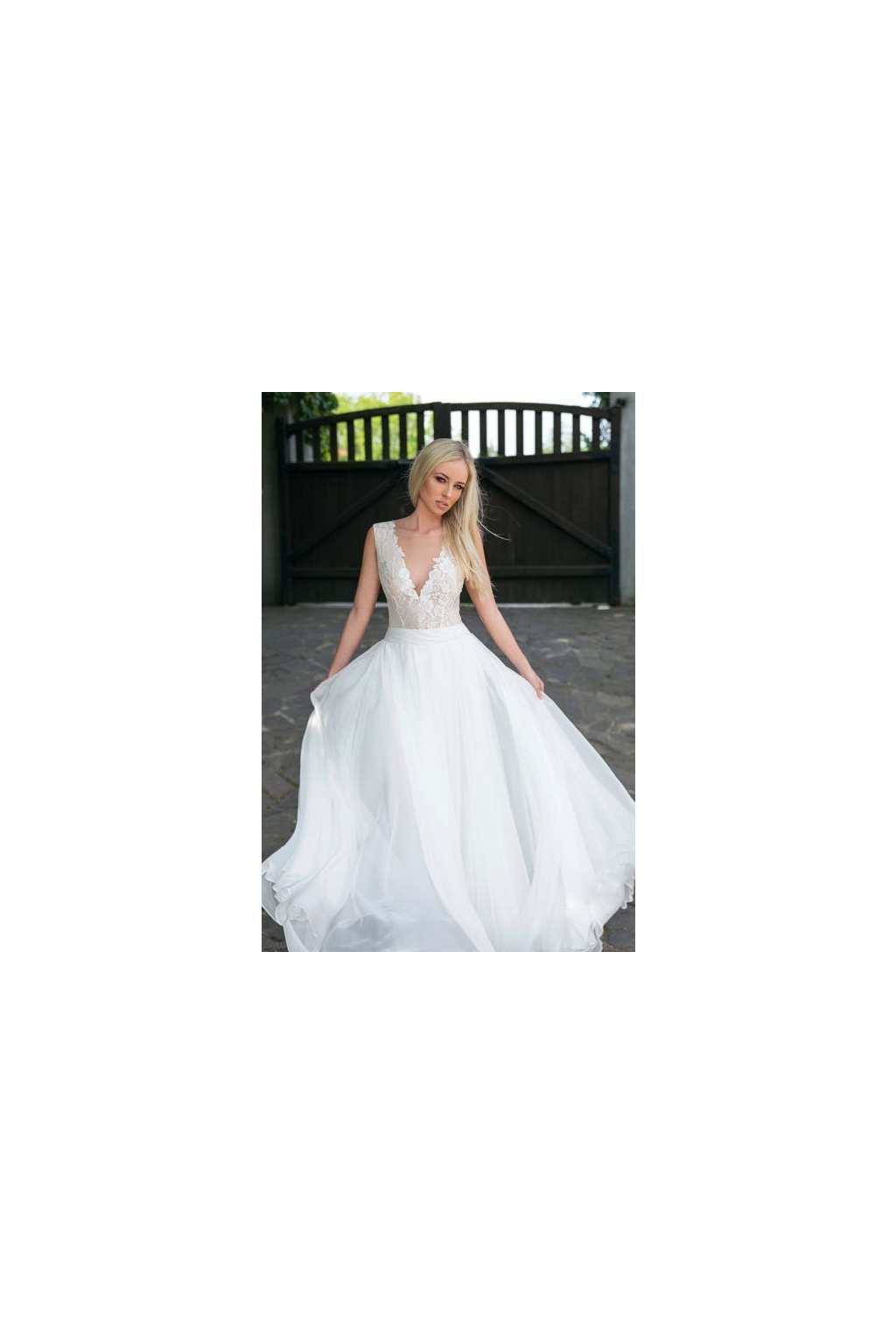 Romantické svatební šaty se hodí především na svatbu ve stylu boho. V těchto jemných šatech se budete cítit jako lesní víla. Živůtek je decentně zdobený krajkou a má výstřih do V, který vyplňuje tyl. Pas je zvýrazněn nenápadným páskem, ze kterého vychází bohatá tylová sukně ušitá ze 17 metrů šifonu. Délka šatů je 155 cm od ramene k přednímu lemu. Zip šatů je na zádech.