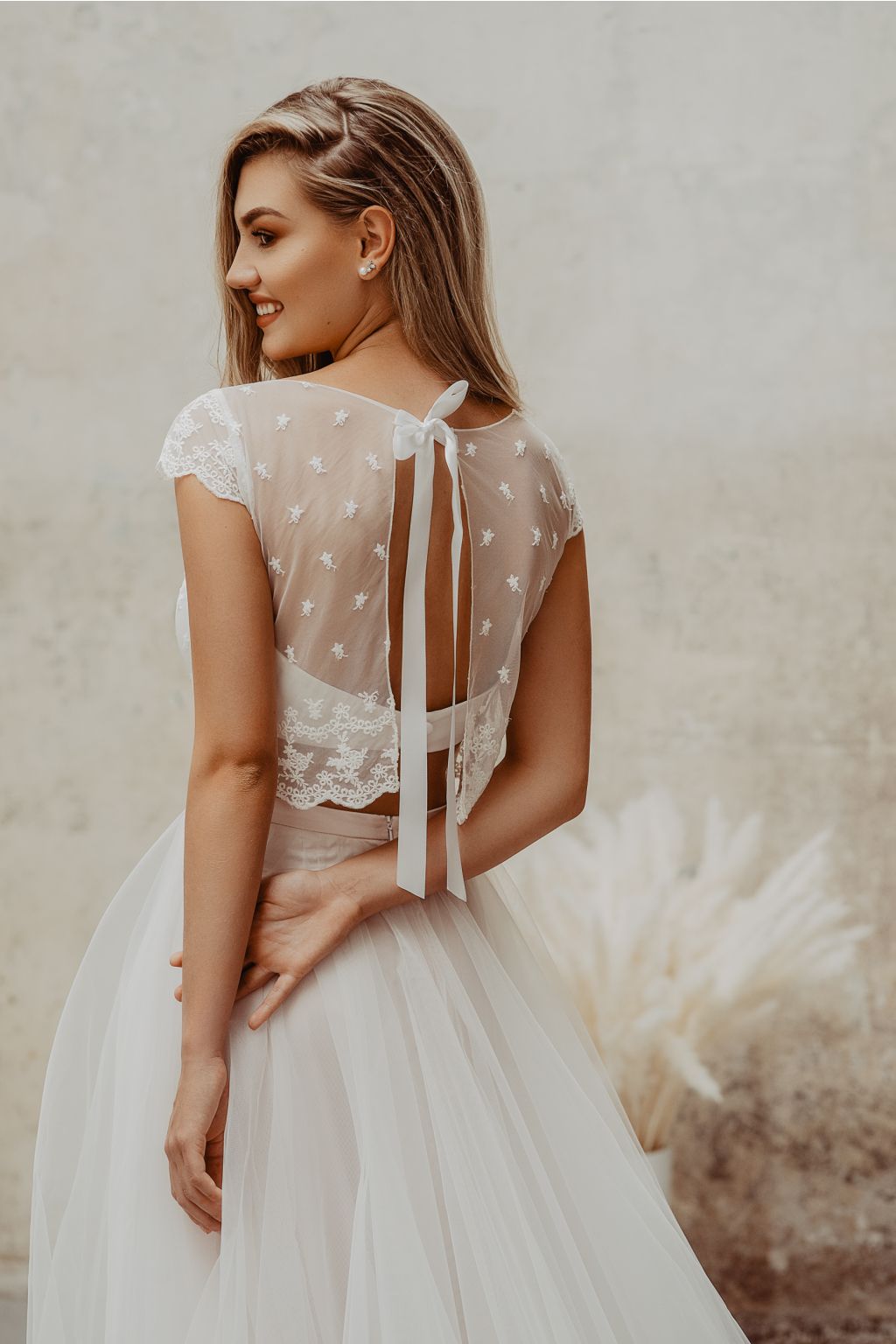 - Moderní svatební šaty se samostatnou sukní a krajkovým živůtkem,